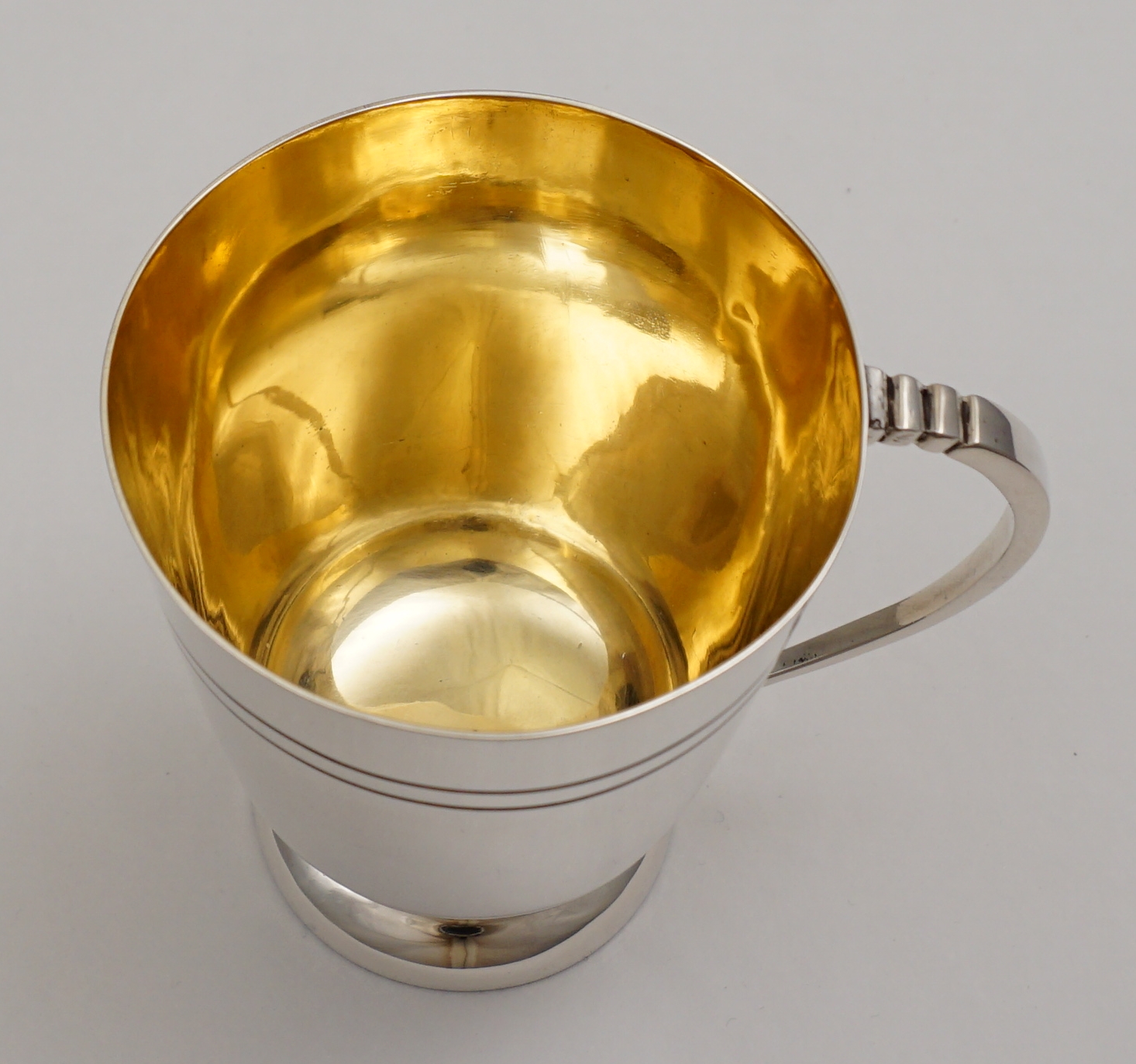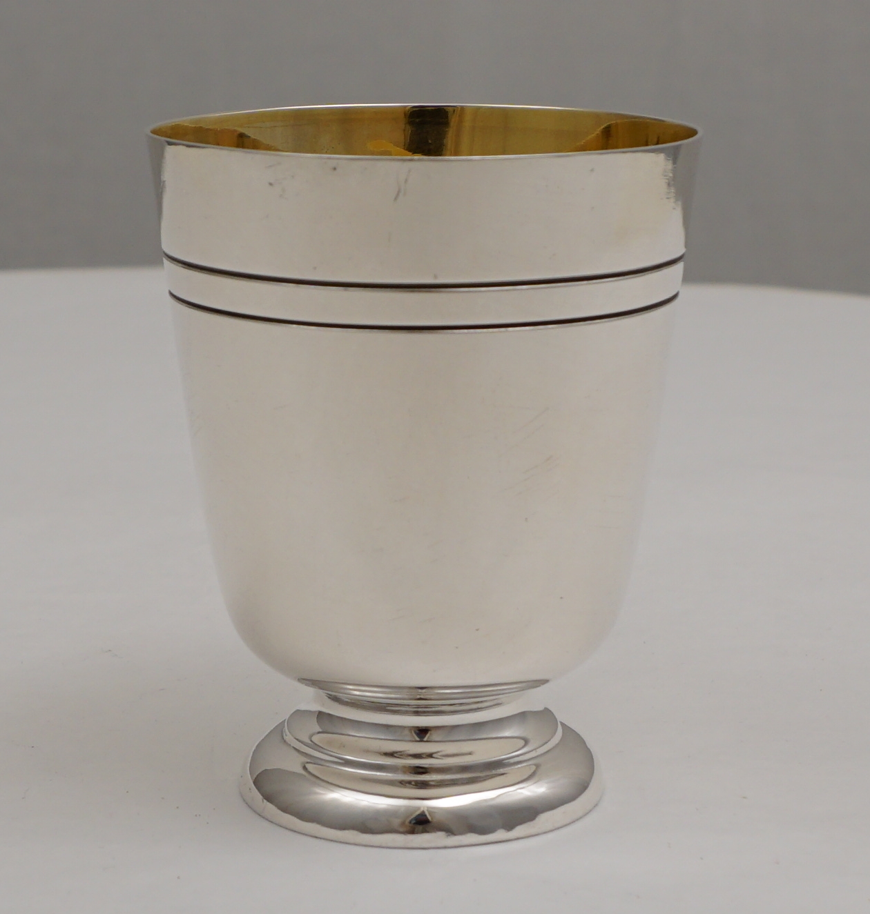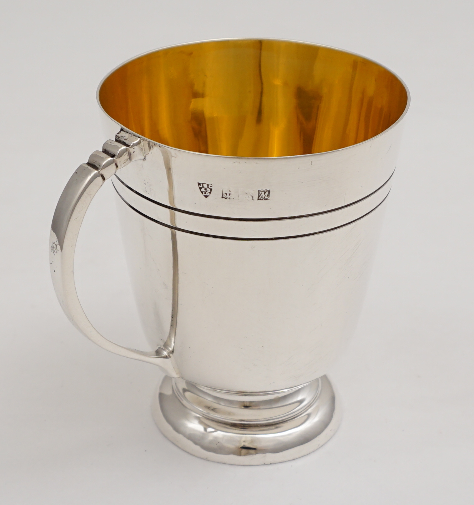 DESCRIPTION | Good vintage Art Deco style English solid sterling silver christening mug with thread decoration, pedestal base and a fully gilded interior. |
