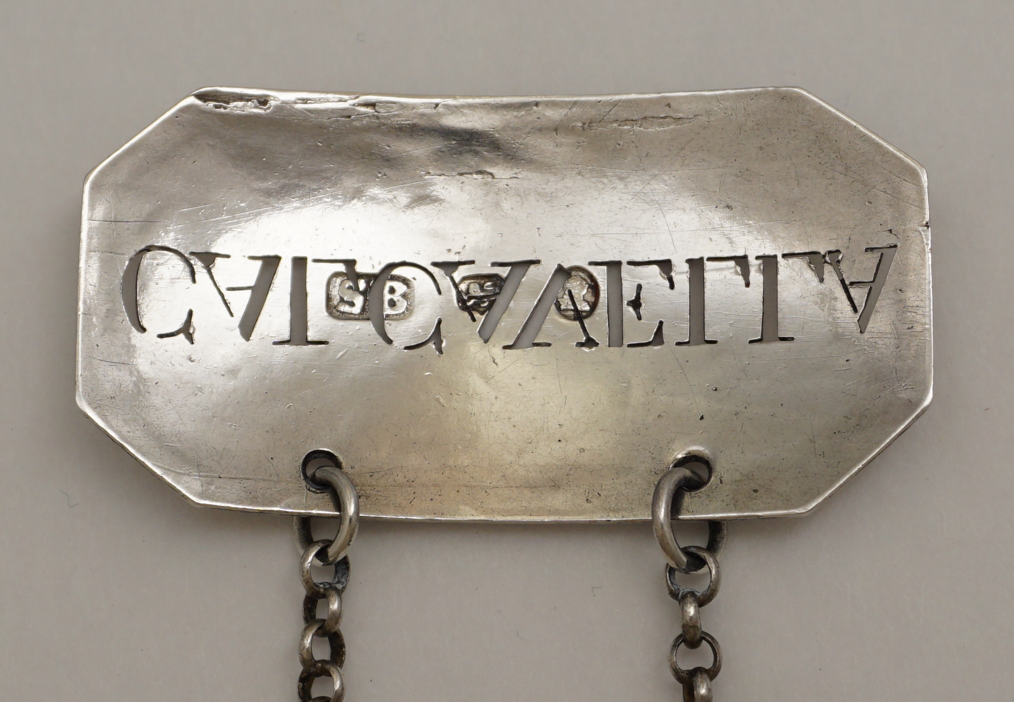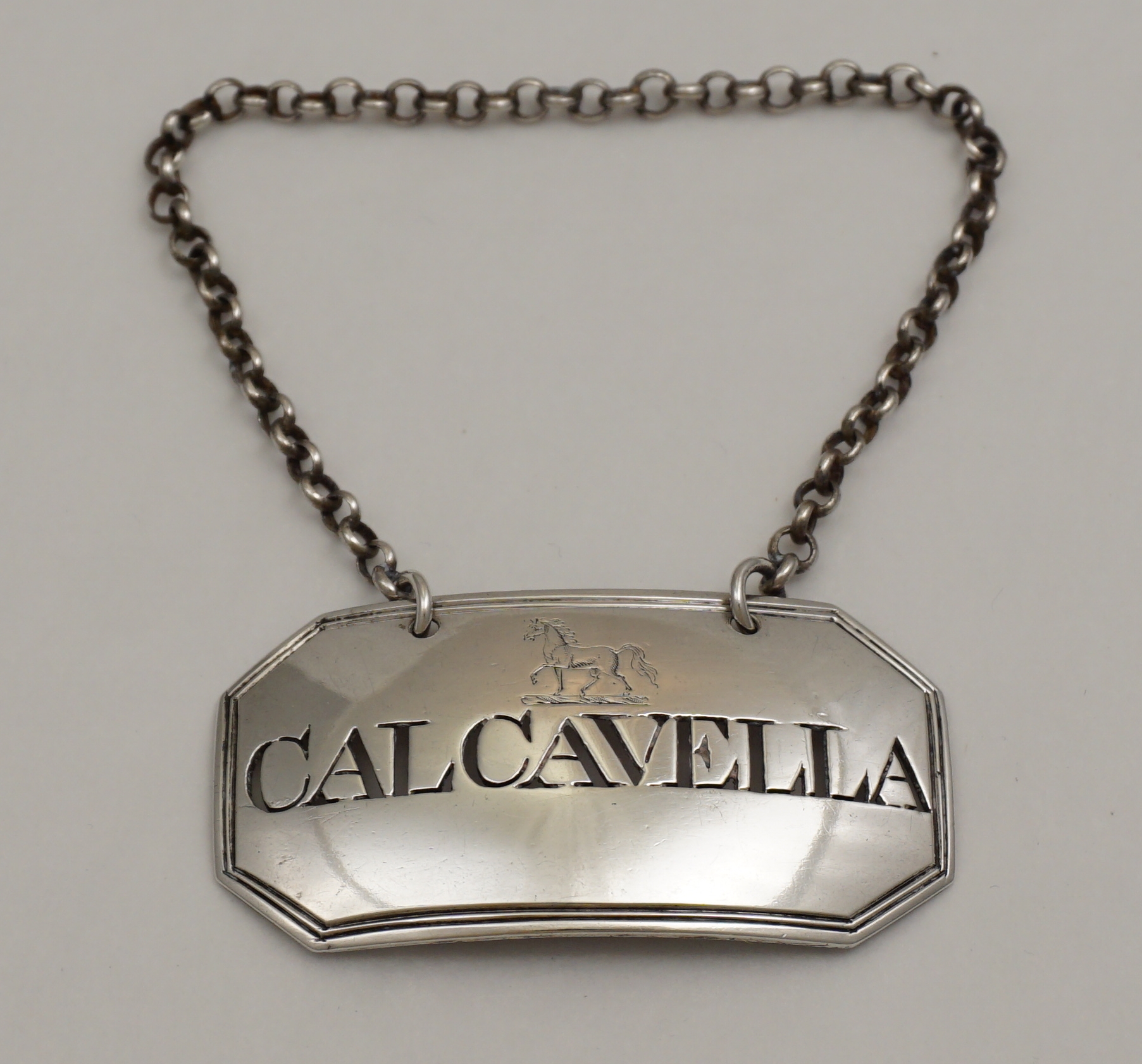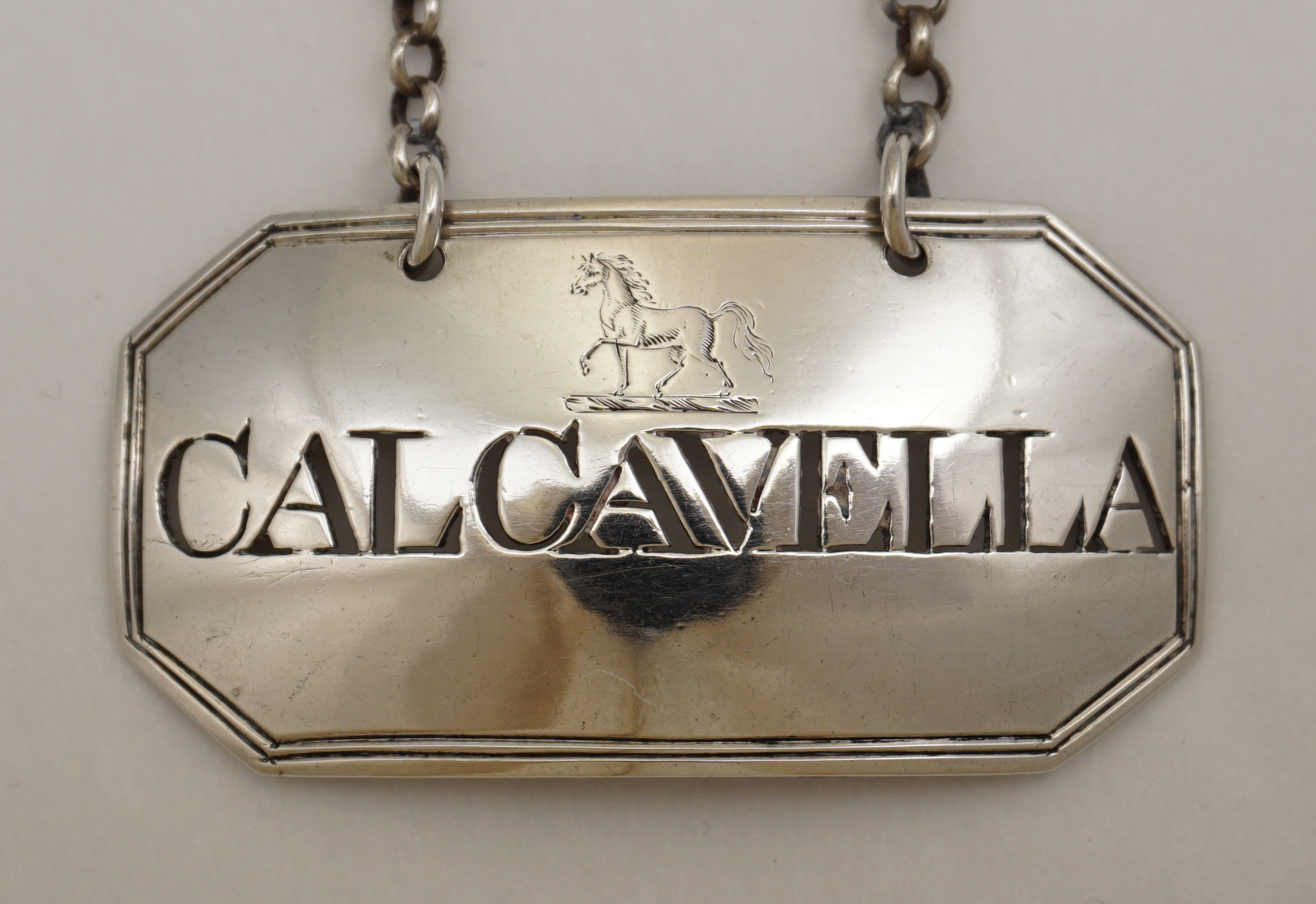 DESCRIPTION | Scarce antique English Georgian solid sterling silver thread decorated rectangular wine label with cut corners and pierced CALCAVELLA below a nice horse crest and complete with suspension chain. Calcavella is a sweet wine from Portugal. |