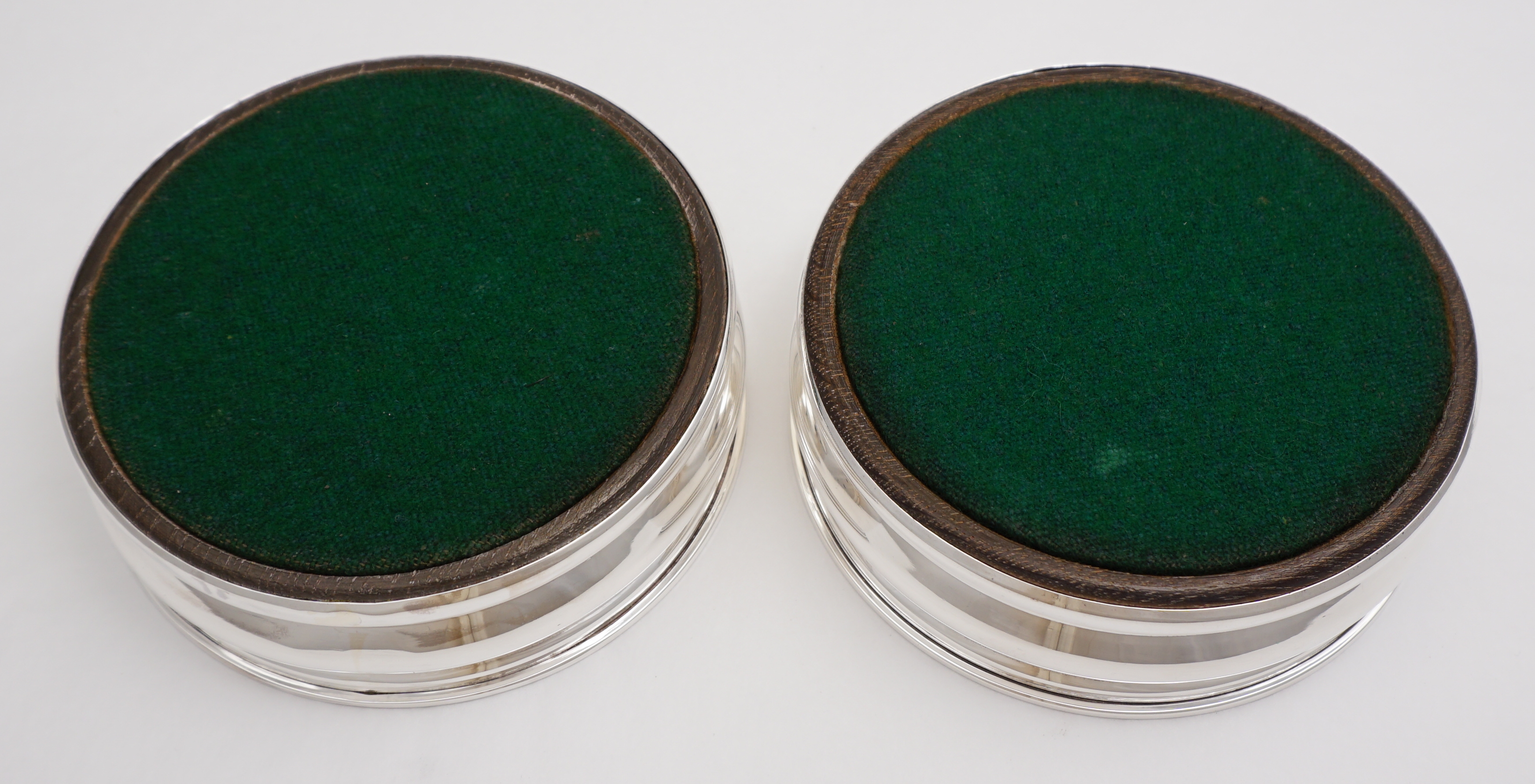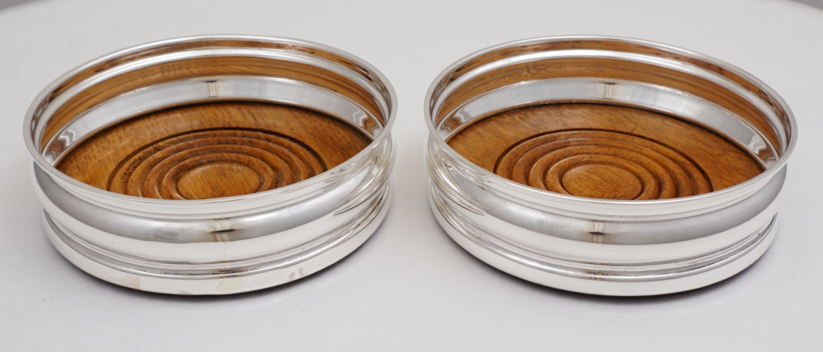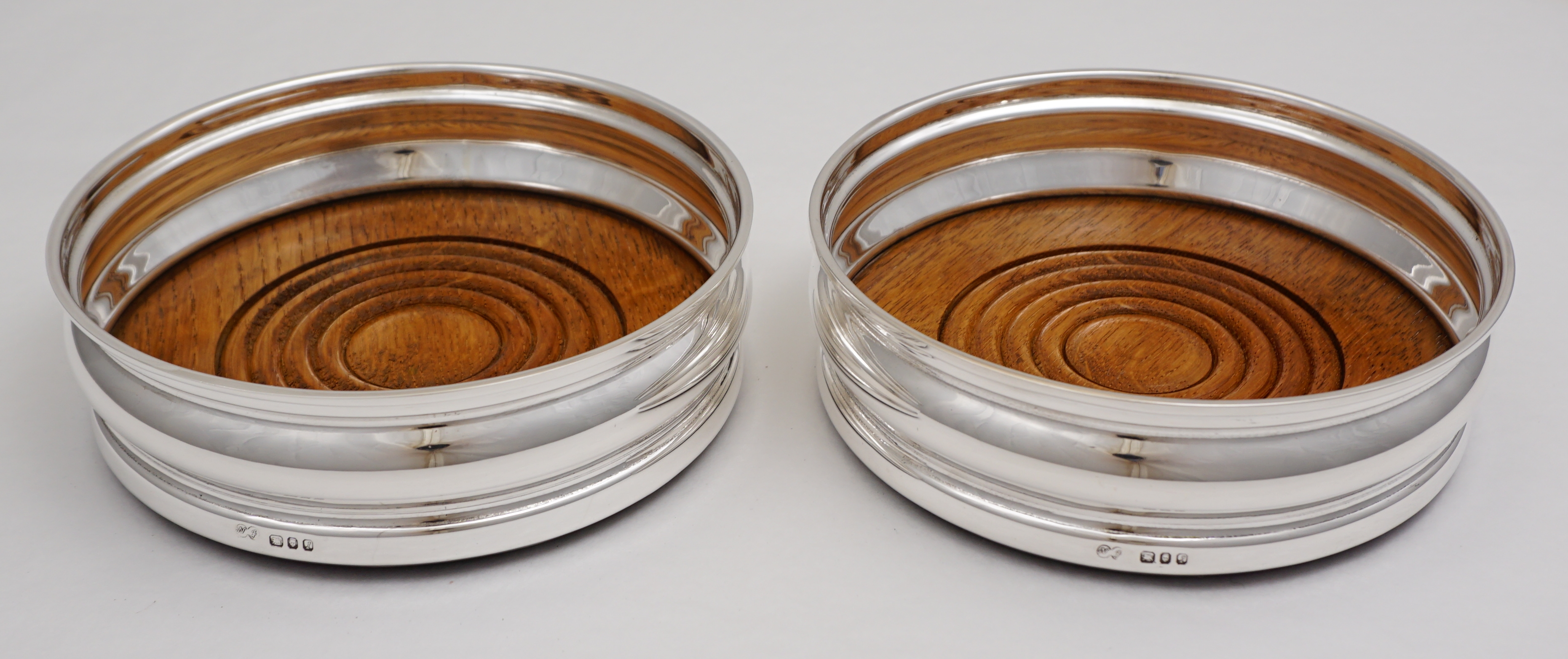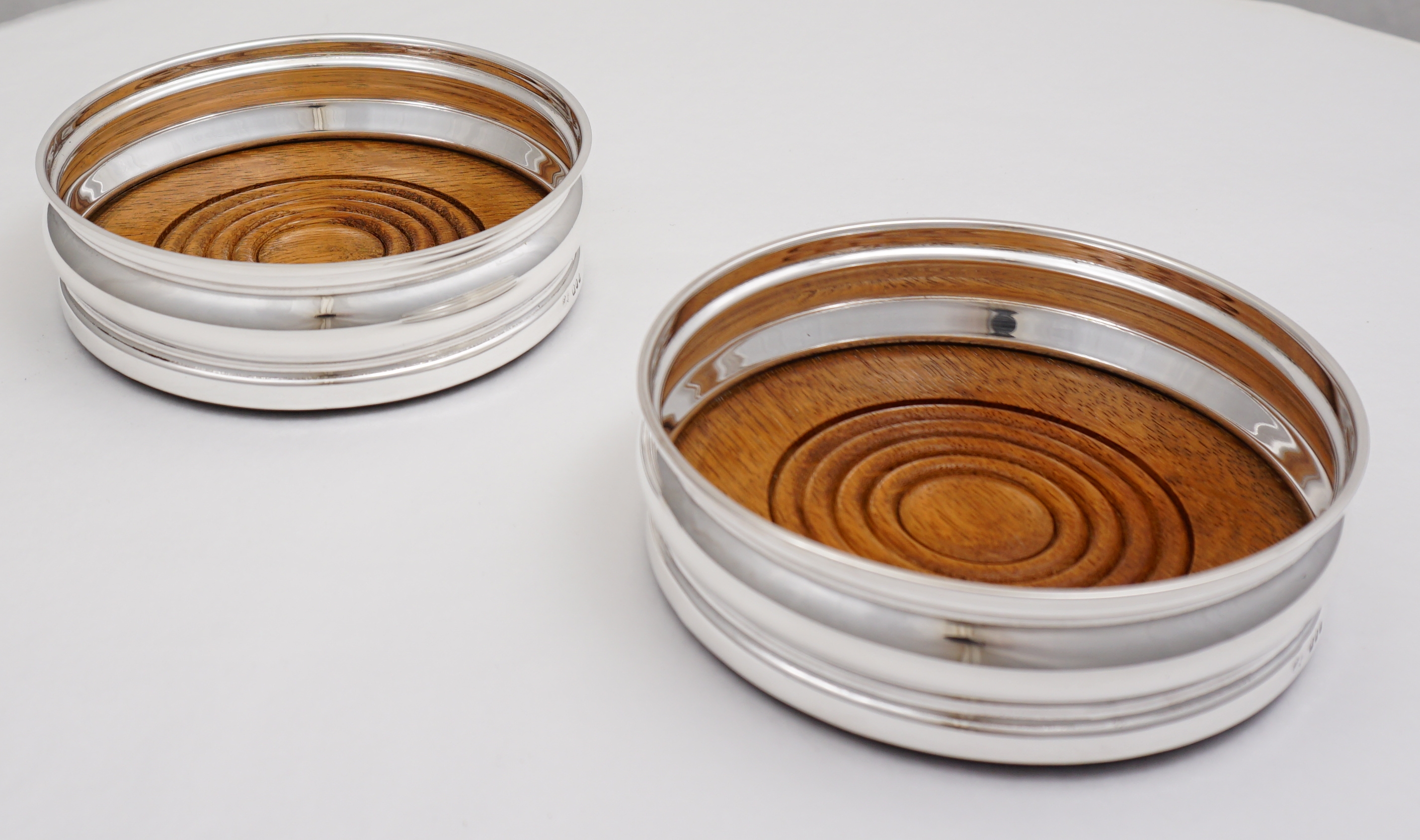 DESCRIPTION | Good and useful pair of vintage English solid sterling silver bottle/decanter coasters with turned wood bases and felt bottoms. |