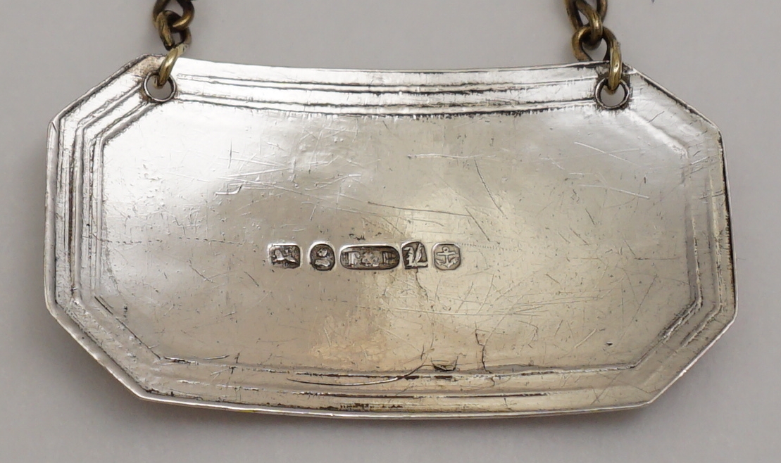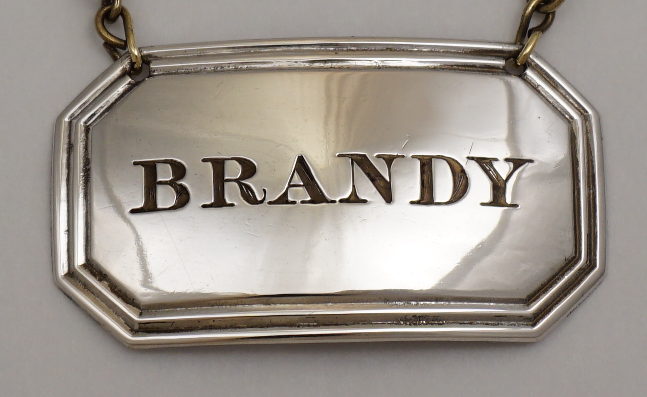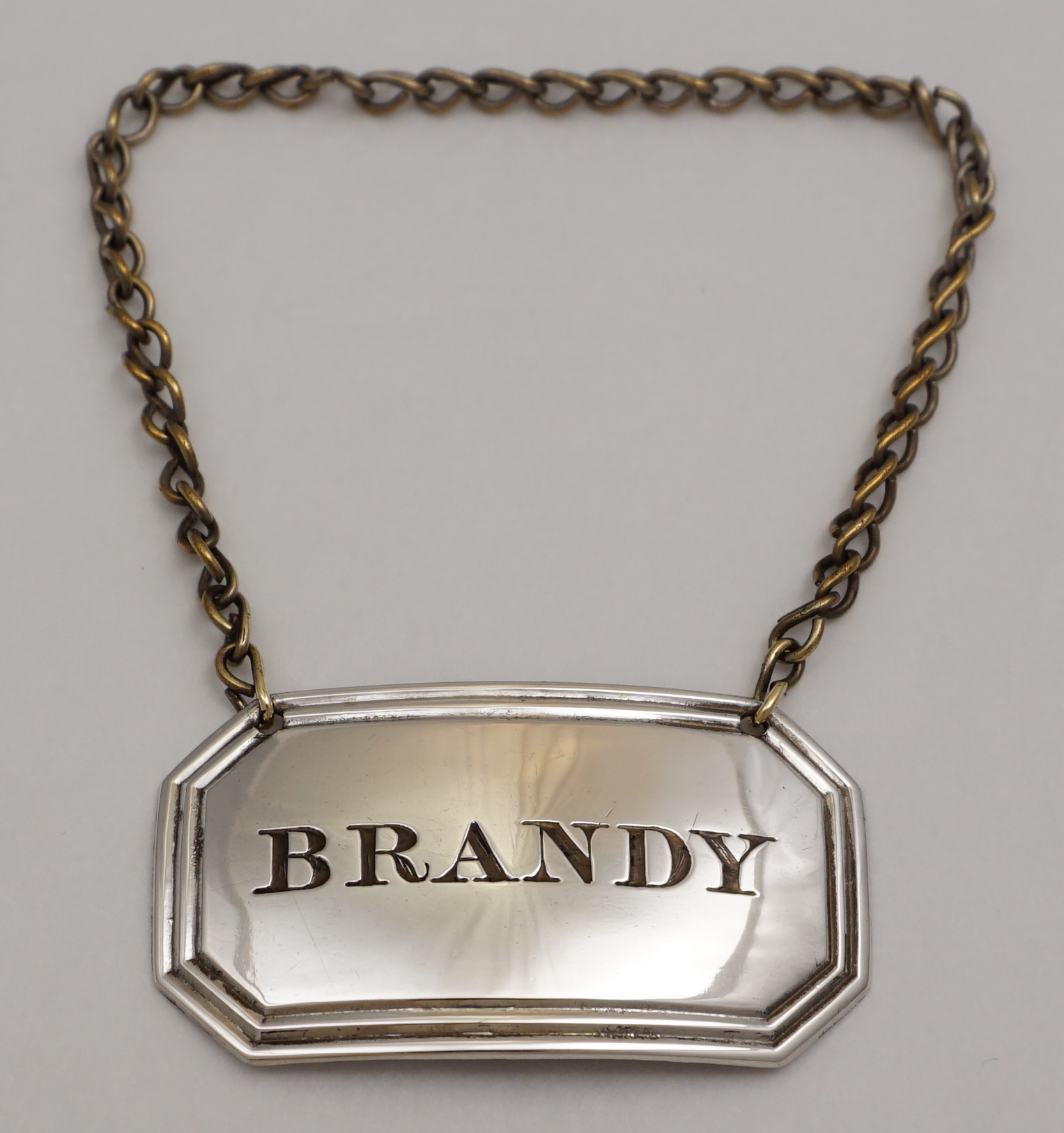 DESCRIPTION | Good antique English William IV solid sterling silver BRANDY label on ex-plated suspension chain. |