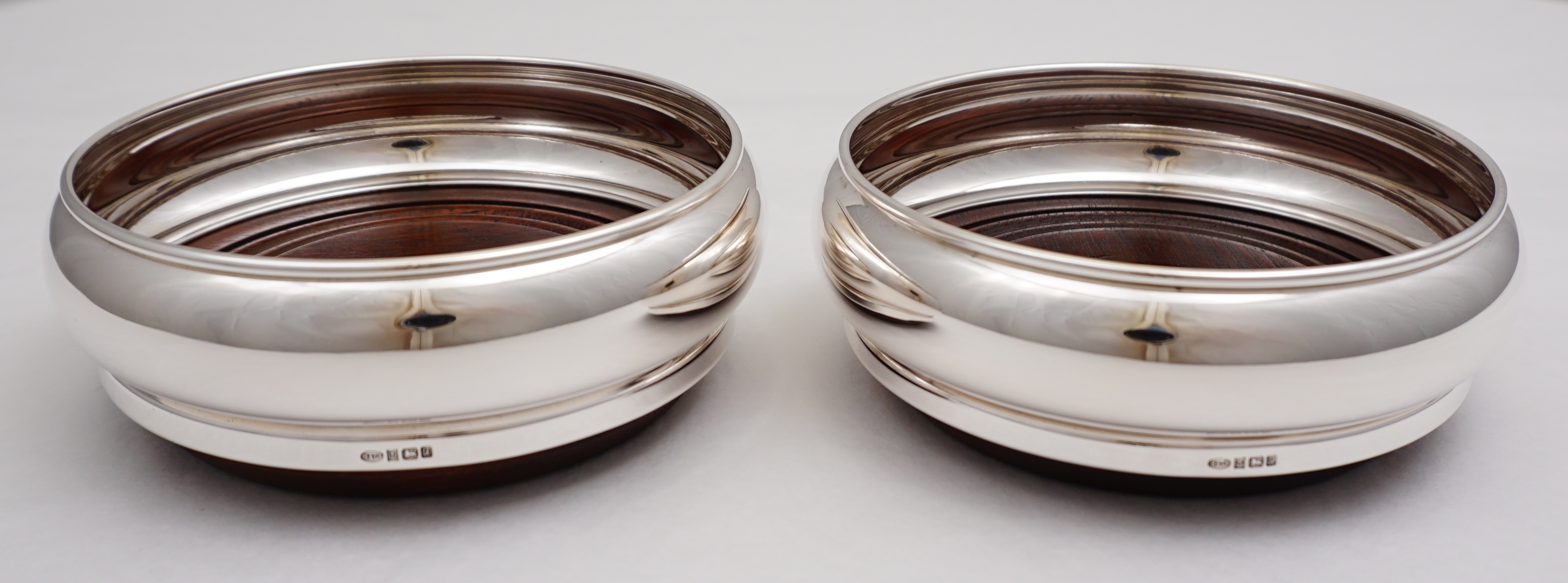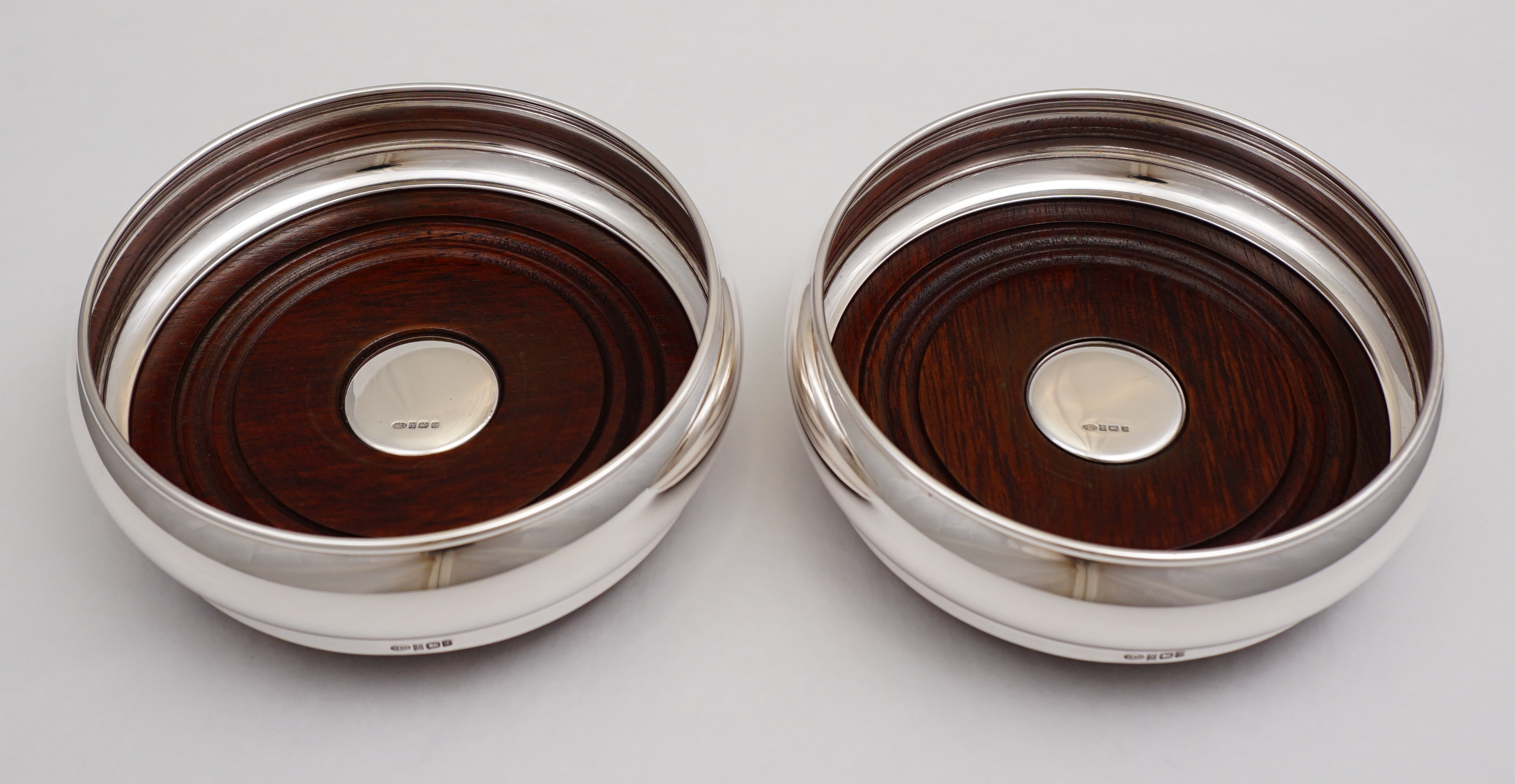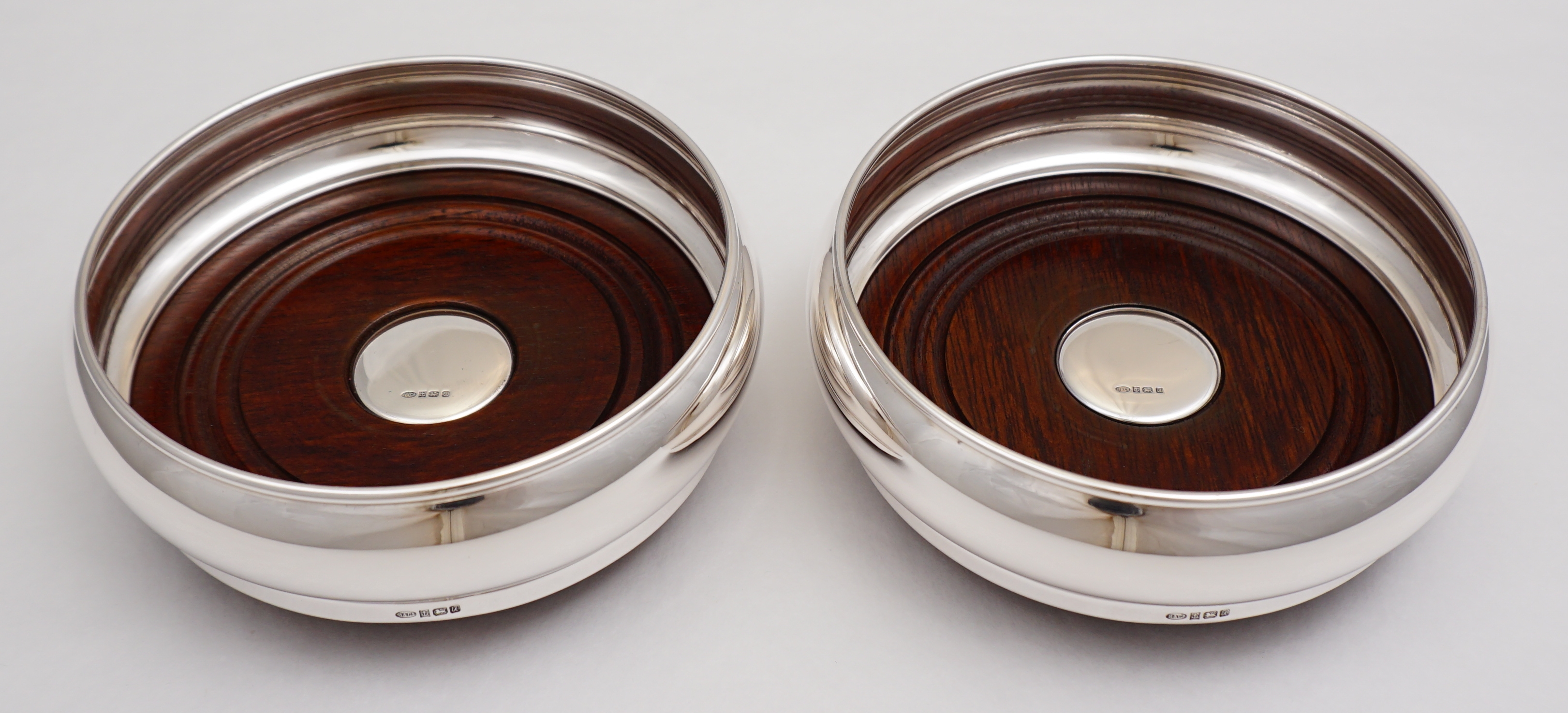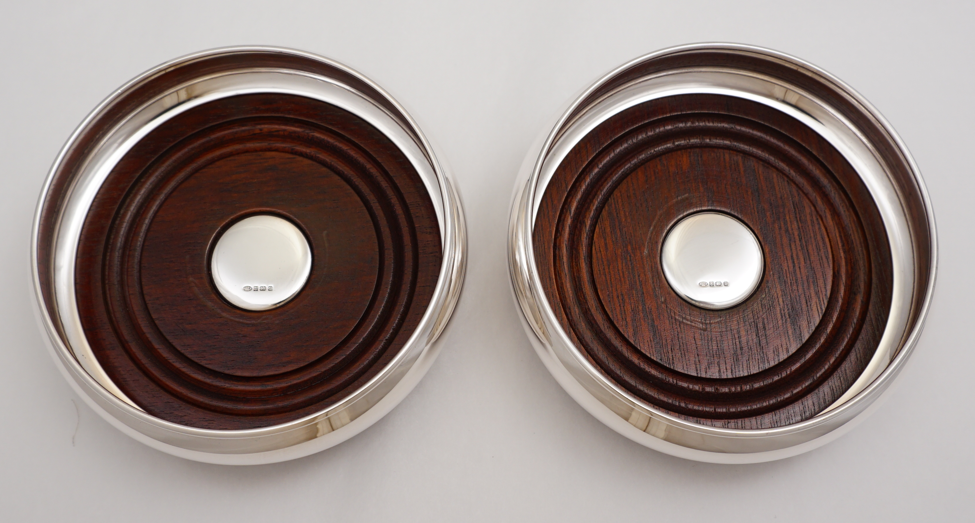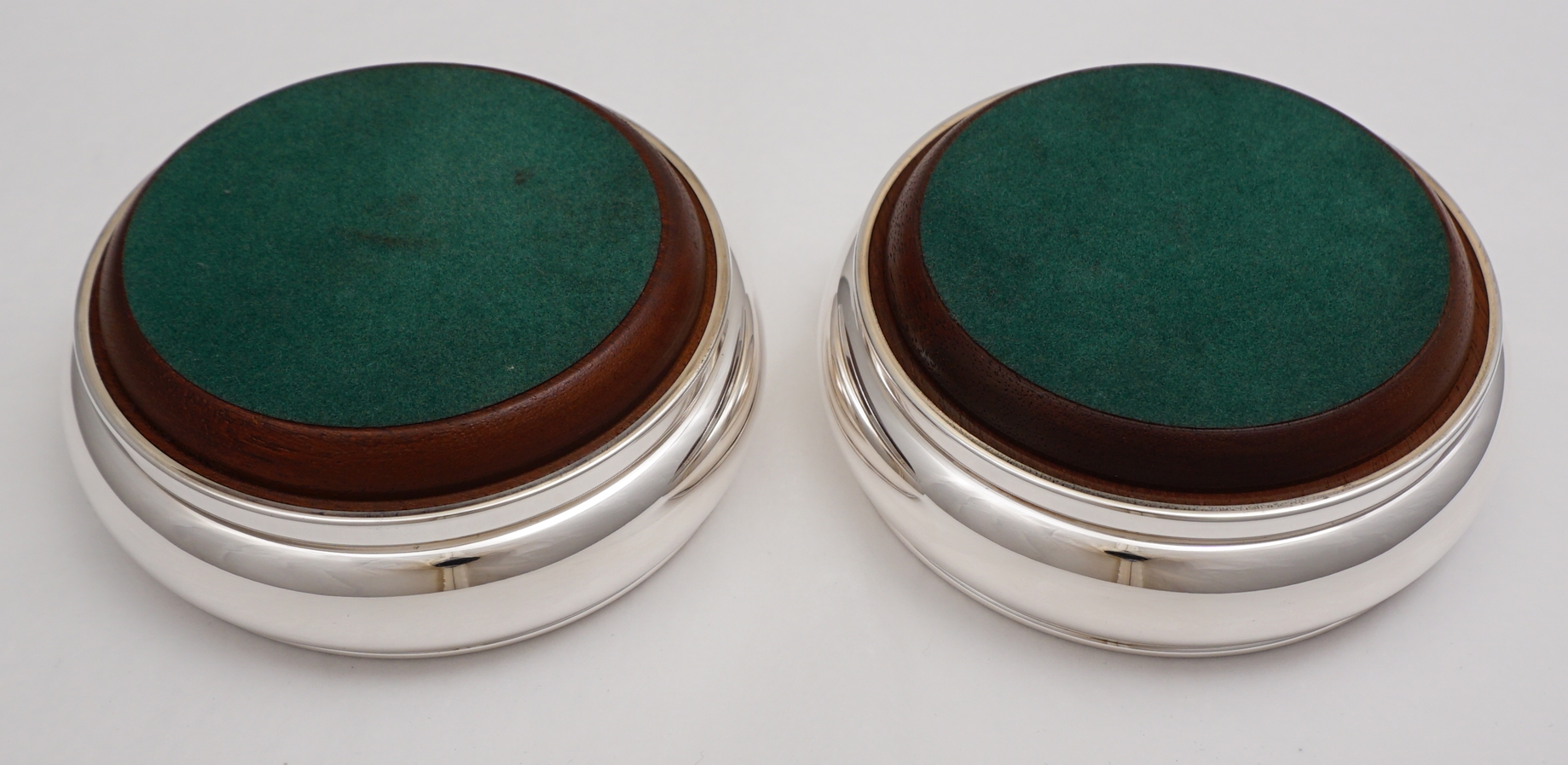 DESCRIPTION | Superb pair of vintage English solid sterling silver bottle coasters with silver button inset turned wood bases and felt bottoms. |
