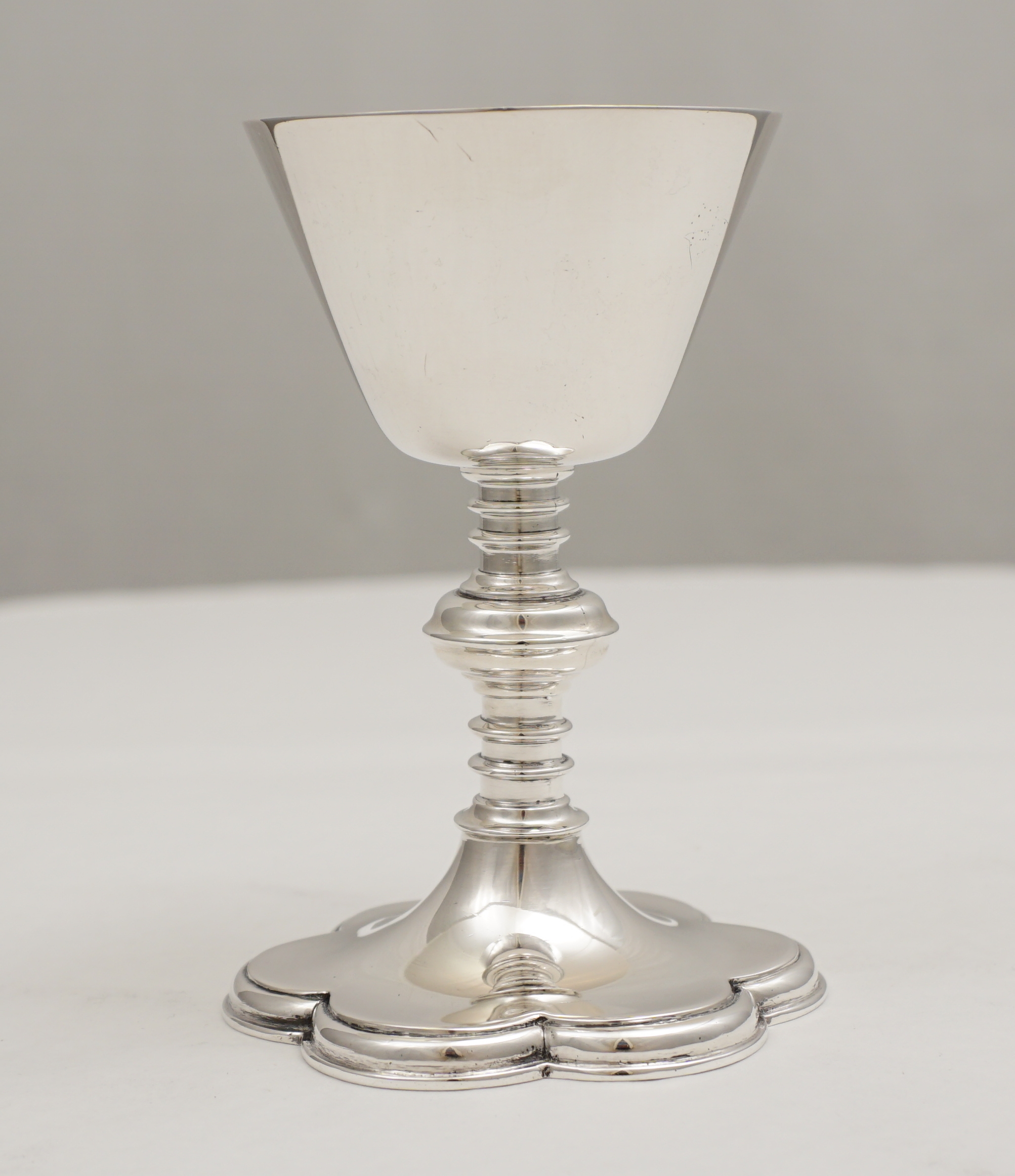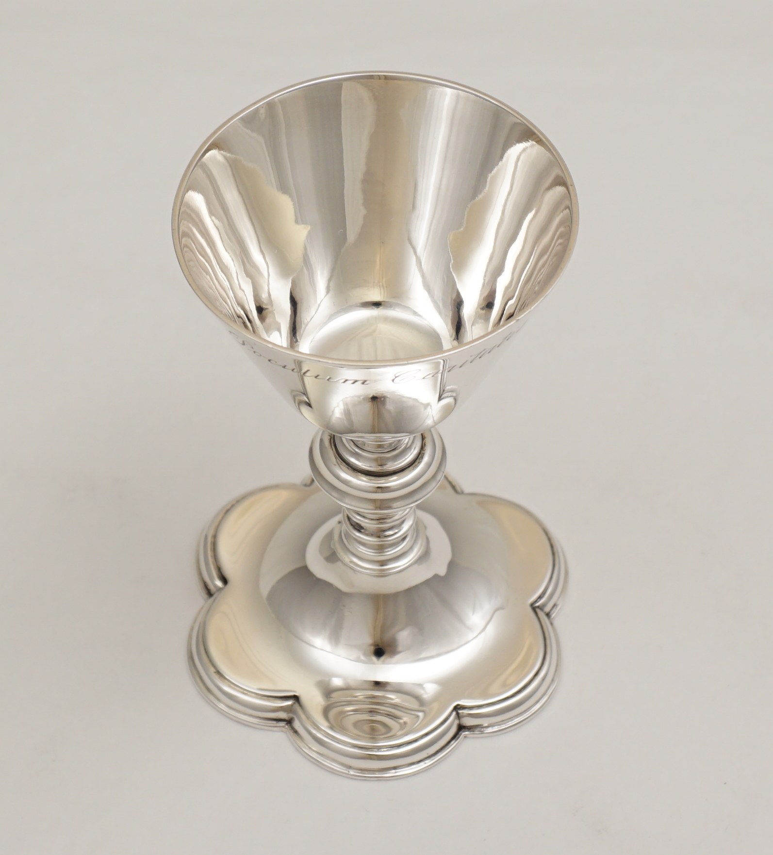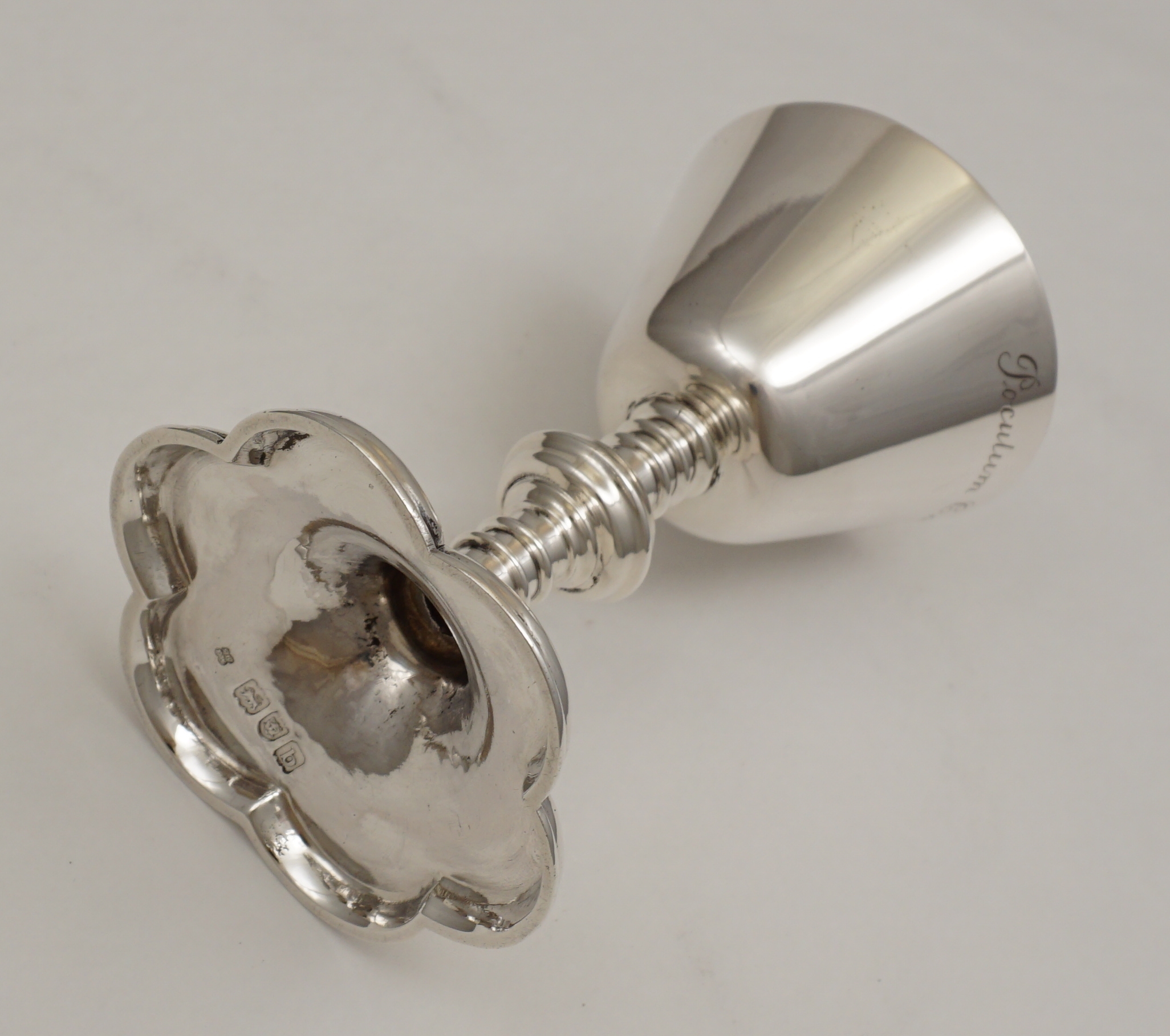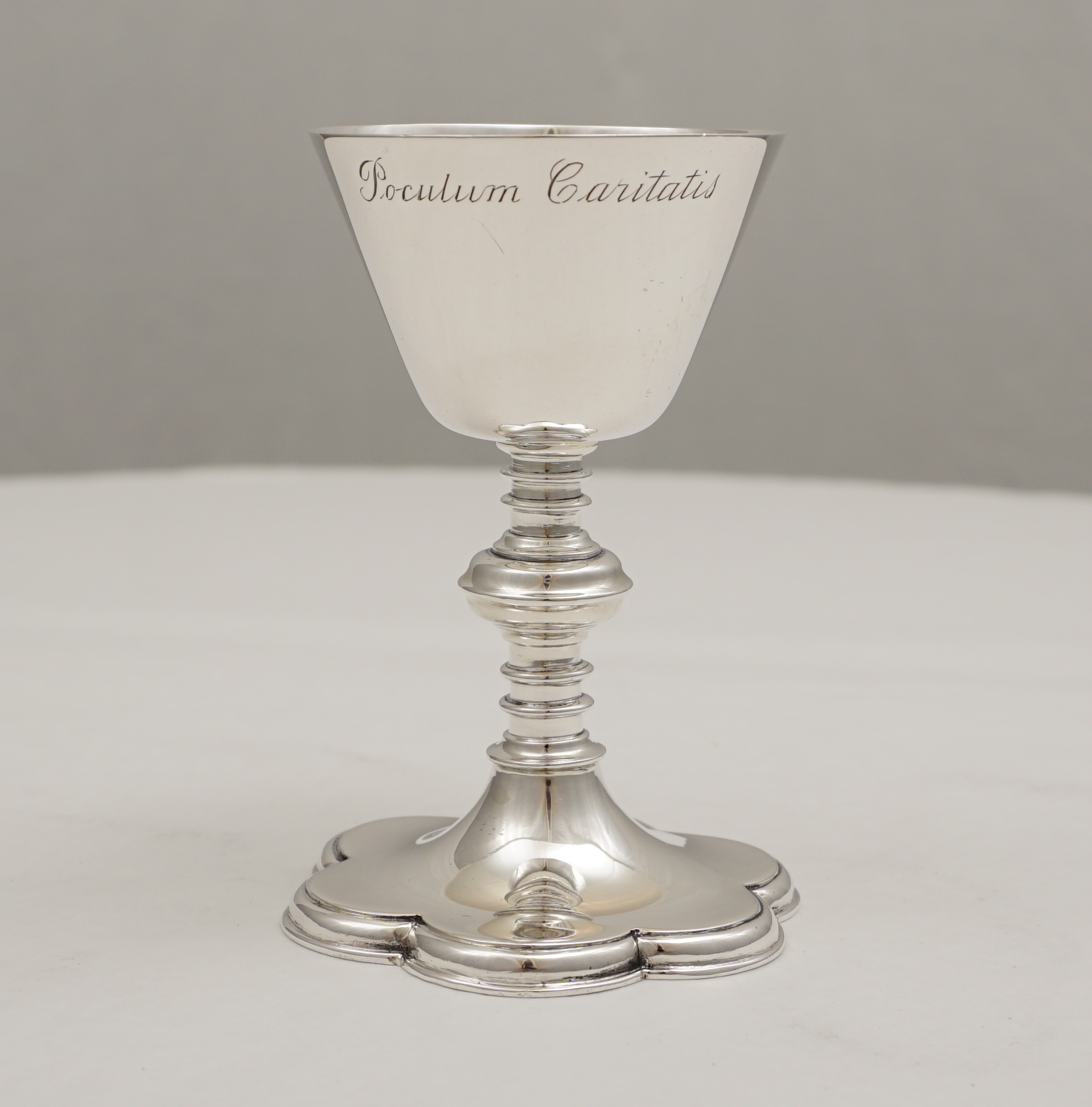 DESCRIPTION | Good quality antique English Victorian solid sterling silver Tudor style small chalice or communion cup for domestic visits. The broad bottomed conical bowl sits atop a ring decorated stem with central knop and a stepped hexafoil (six lobed) base. Below the top rim is inscribed "Poculum Caritatis" which translates as 'Loving Cup' or 'Grace Cup' dependent upon where you are sitting. |