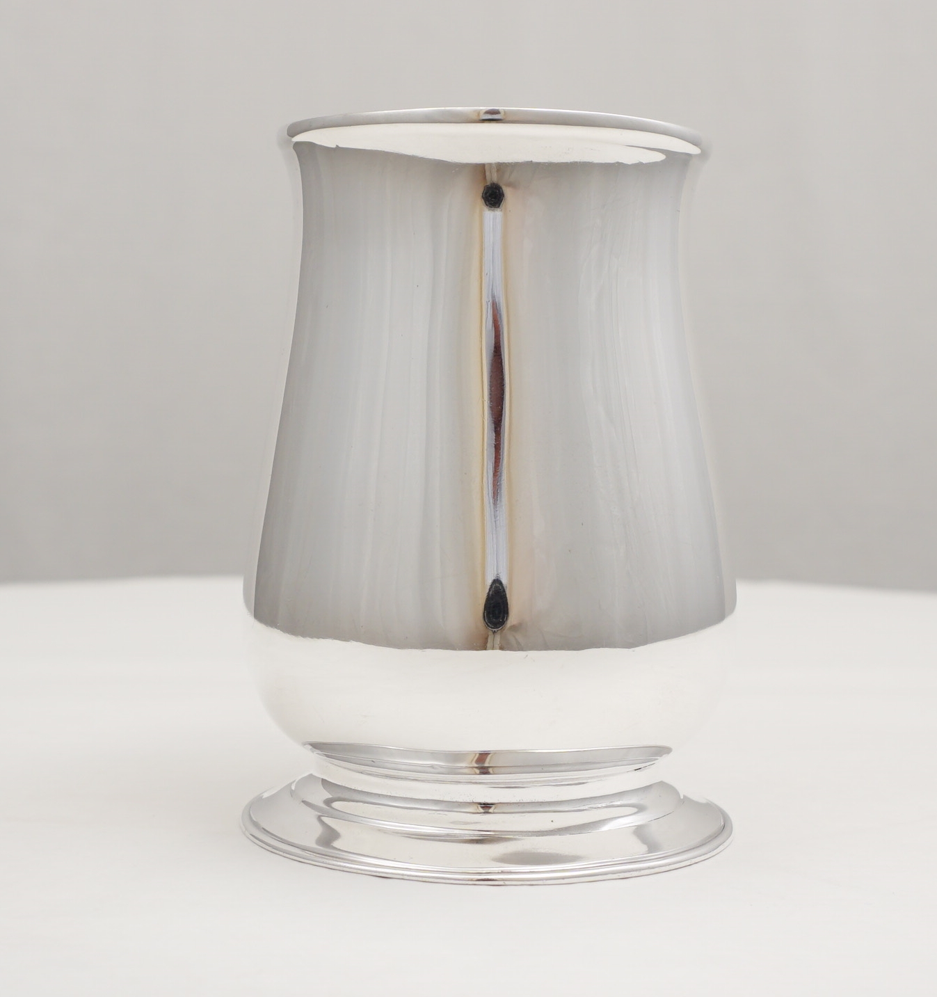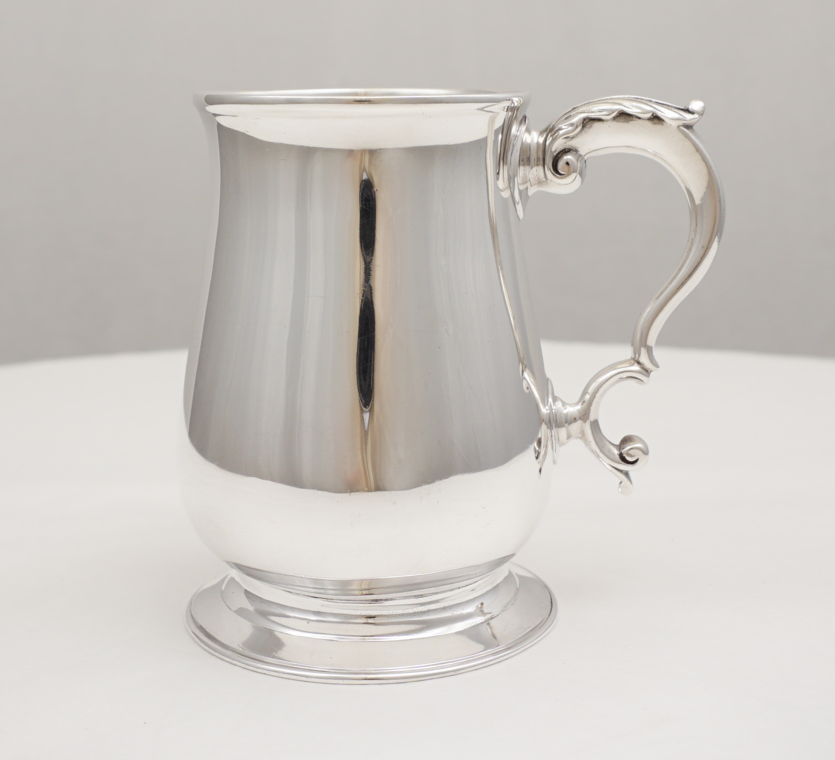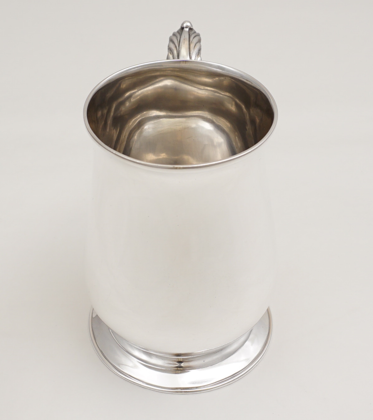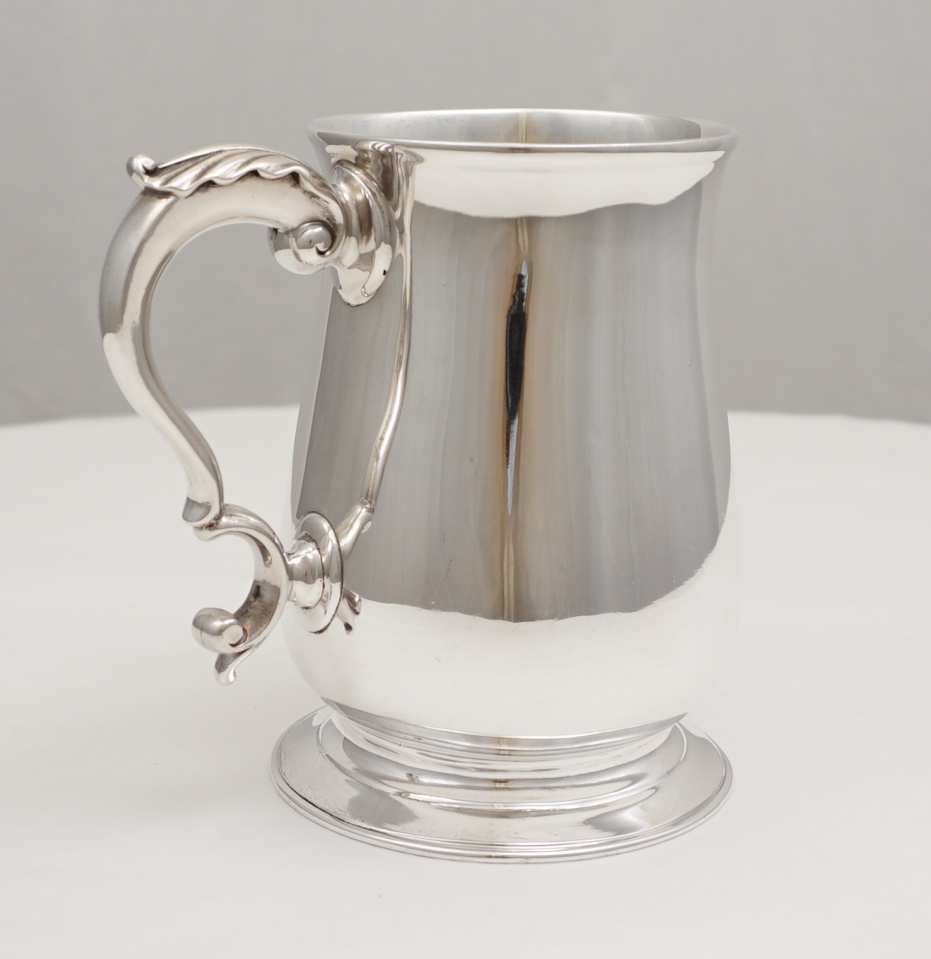 DESCRIPTION | Antique English George II solid sterling silver one half pint (300ml) baluster mug with a flying leaf capped scrolling handle and ring turned pedestal foot. An extraordinary survivor to have avoided both a christening presentation engraving and additional Victorian decoration. No erasures and beautifully clear hallmarks to base. Black blobs are distorted reflections of my camera's lens. |