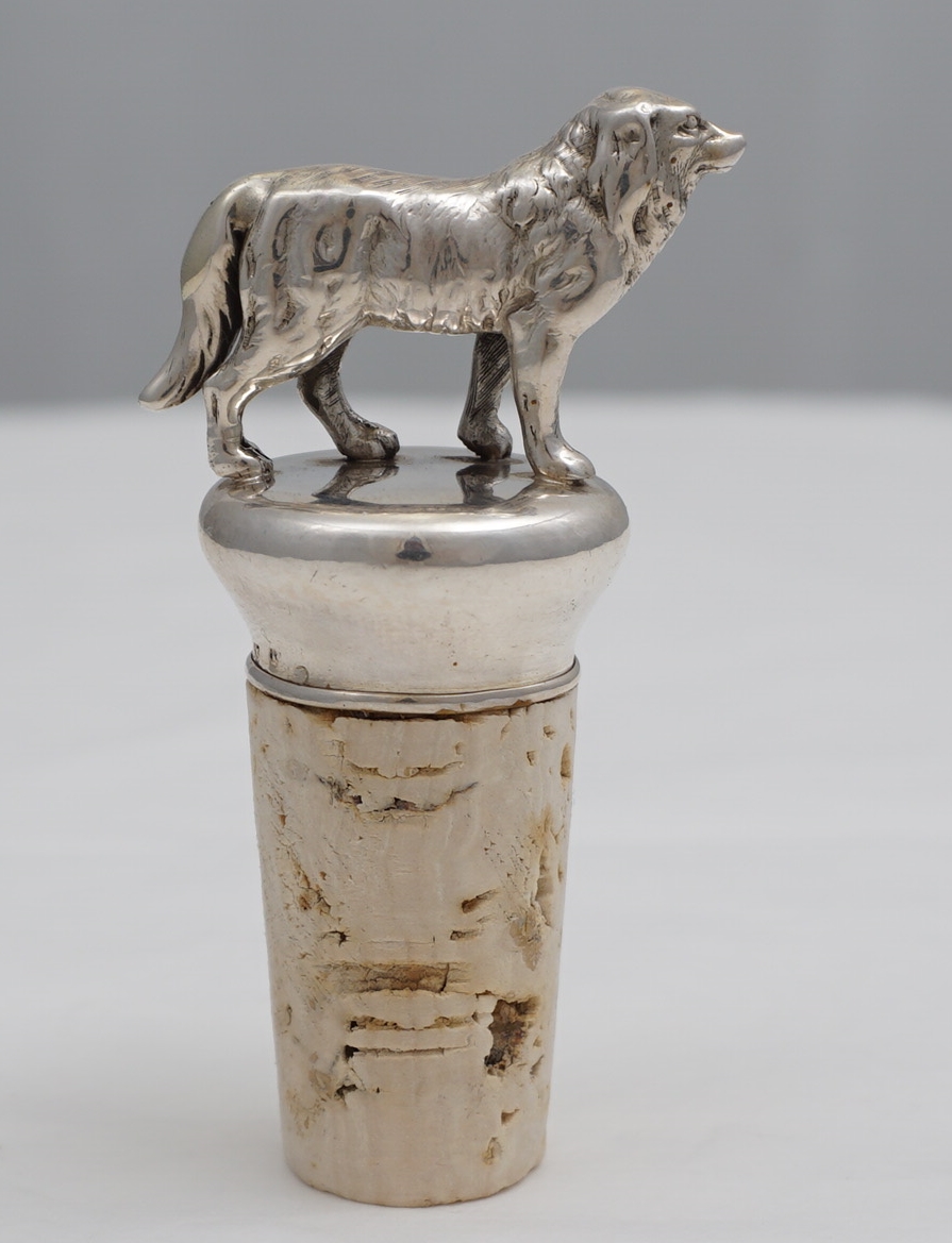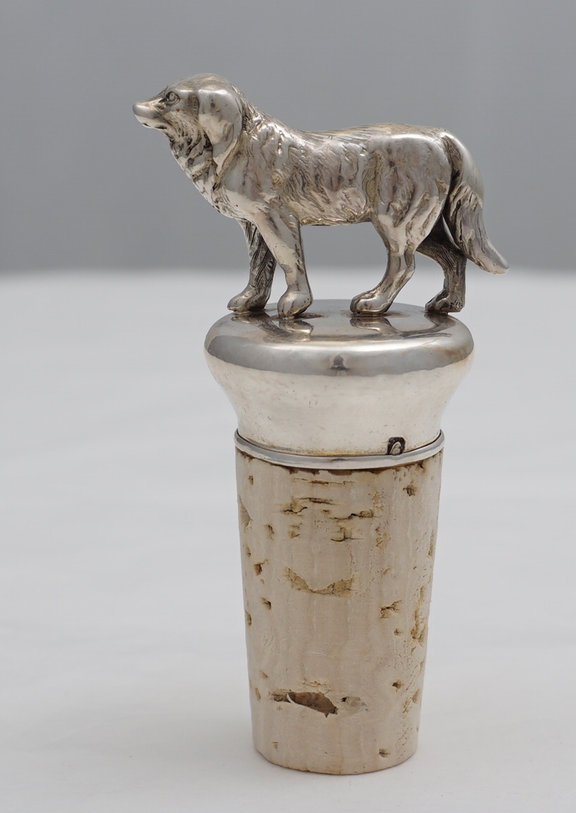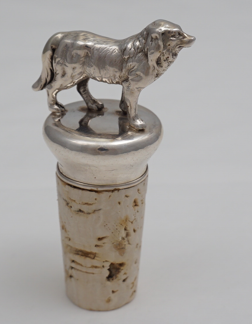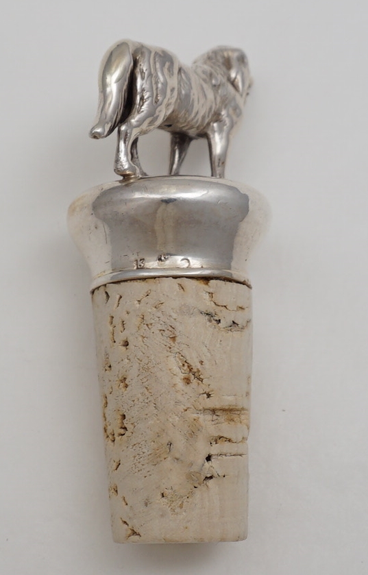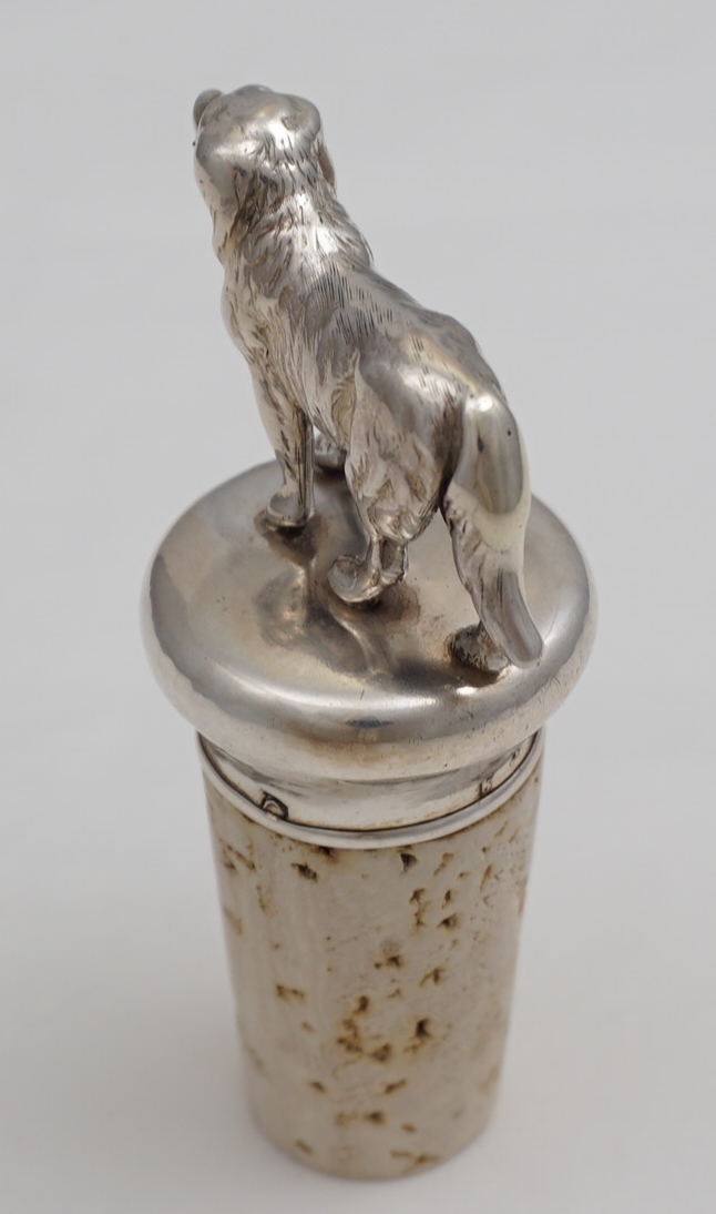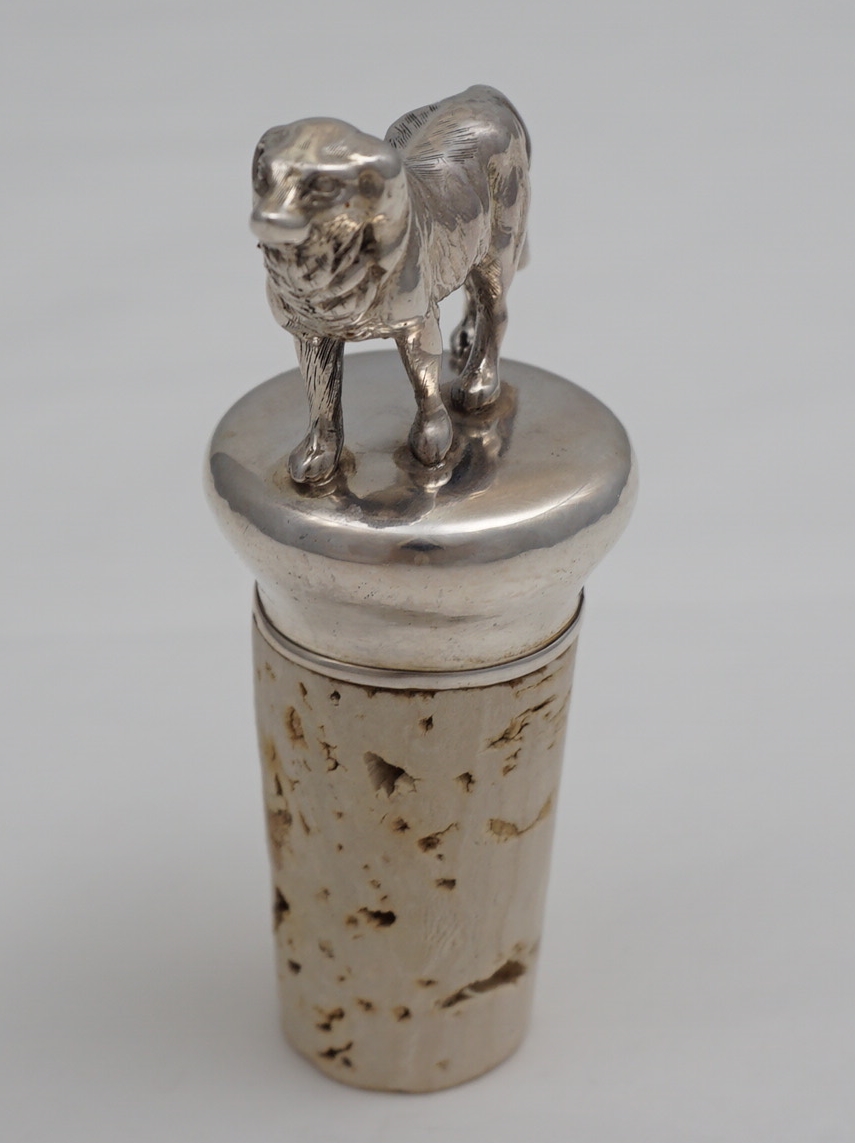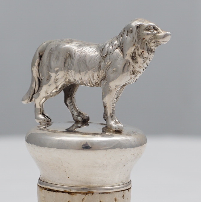 DESCRIPTION | Vintage hollow cast silver bottle stopper mounted with a realistically modelled dog and new replacement cork stopper. Dog not marked but she looks and feels like silver. Some rubbing to her back and tail, especially the top of her tail where the pattern has been worn smooth, probably from stroking. If she was silver plated then it would show through here but it does not. There are some markings around the lower rim of the stopper but the only one that I can read is '13'. |