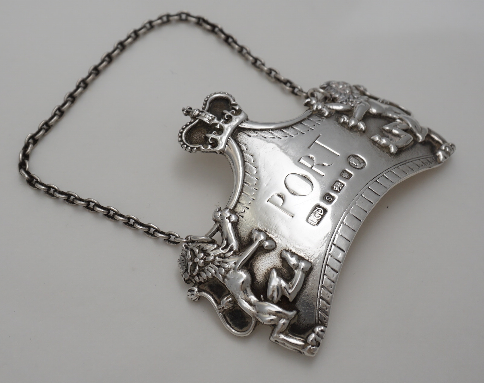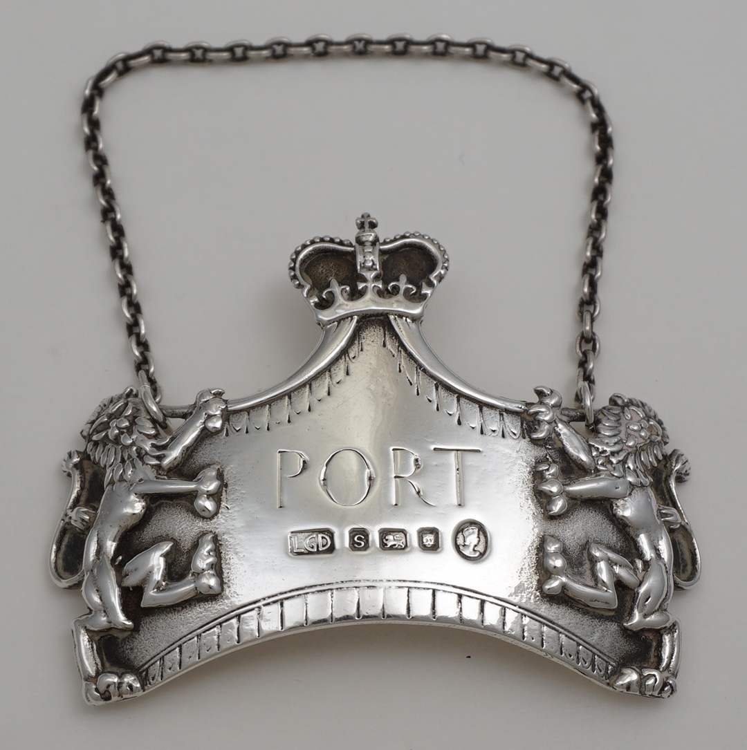 DESCRIPTION | Large and heavy vintage English cast solid sterling silver 'PORT' wine label decorated with royal insignia. Hallmarked with the optional coronation mark for QEII. |