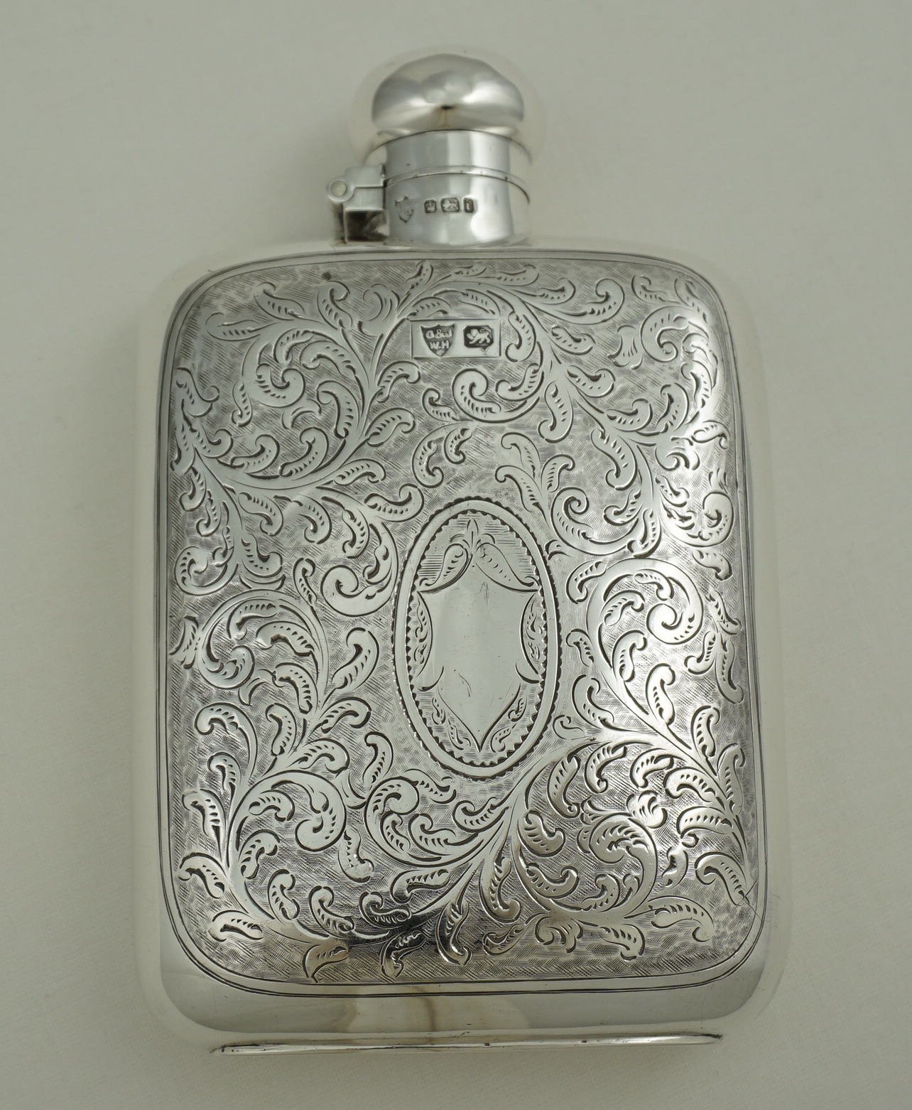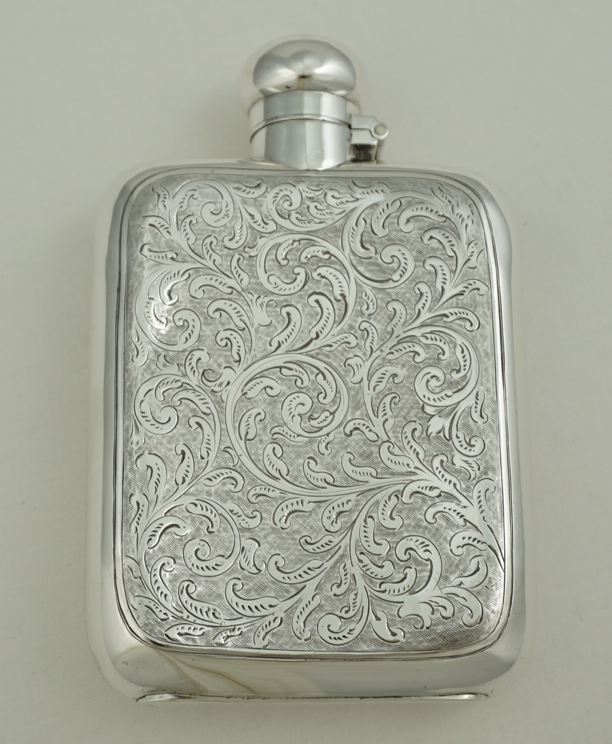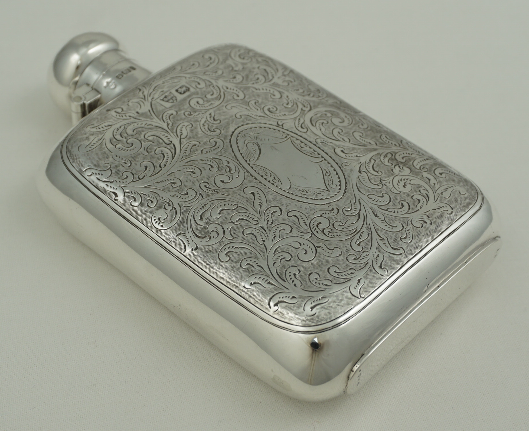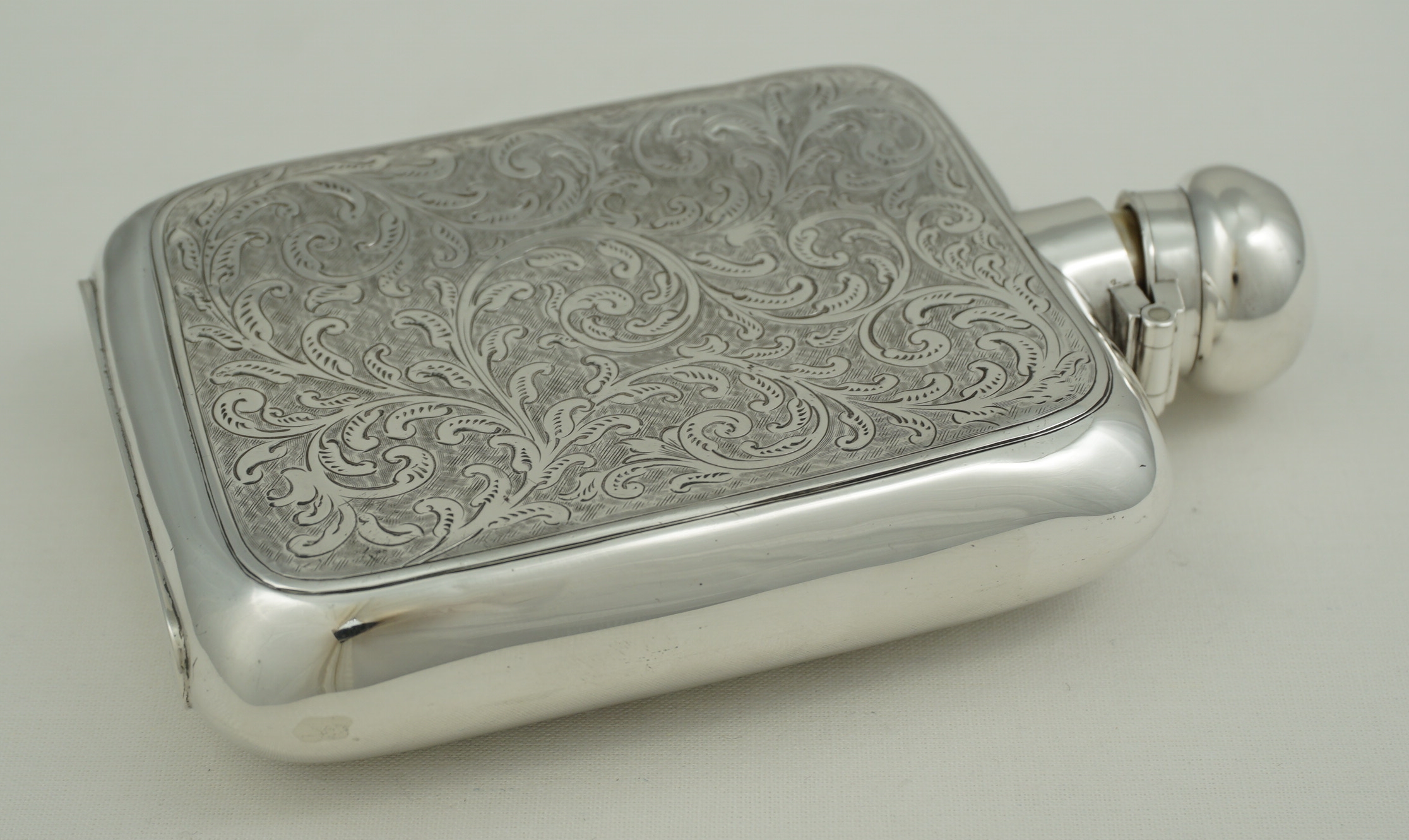 DESCRIPTION | Superb and impressive antique English Edwardian solid sterling silver pocket flask with engraved decoration. One of the finest examples that I have seen. Not only looks fantastic but, perhaps more importantly, feels fantastic in the hand and is a good size too. Benefits, I am not being flippant, from a quite significant seam repair. Most of these flasks will have seam splits or seam repair, sometimes both. You can see the original solder joint all around the edge where the two flat halves meet. In this instance a beautifully executed and delicate thin grey line. Obviously too delicate as the seam has popped on one side and a tiny bit near the bottom corner on the other, perhaps when a loaded and closed flask has been sat on. The repairing silversmith has decided that this is not going to happen again and has strengthened this weak spot significantly. Seen best in image eight and image seven for the little spot near the bottom corner on the other side. Not only a stunning example but now robust too. |