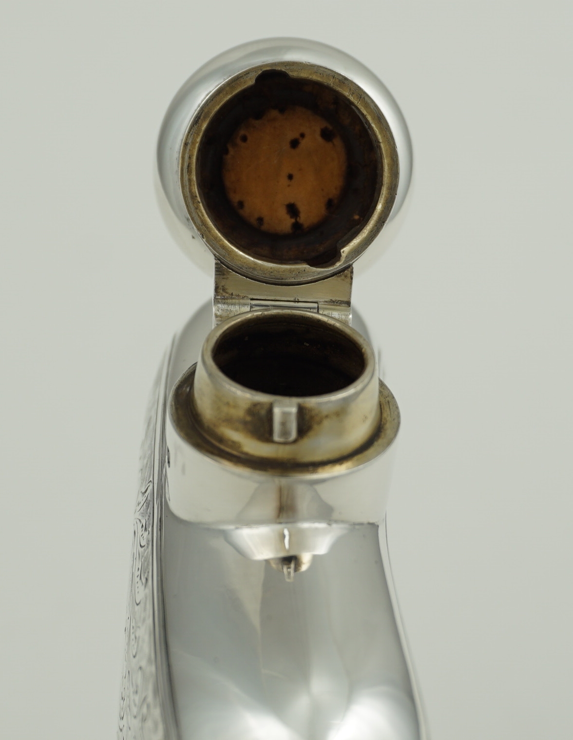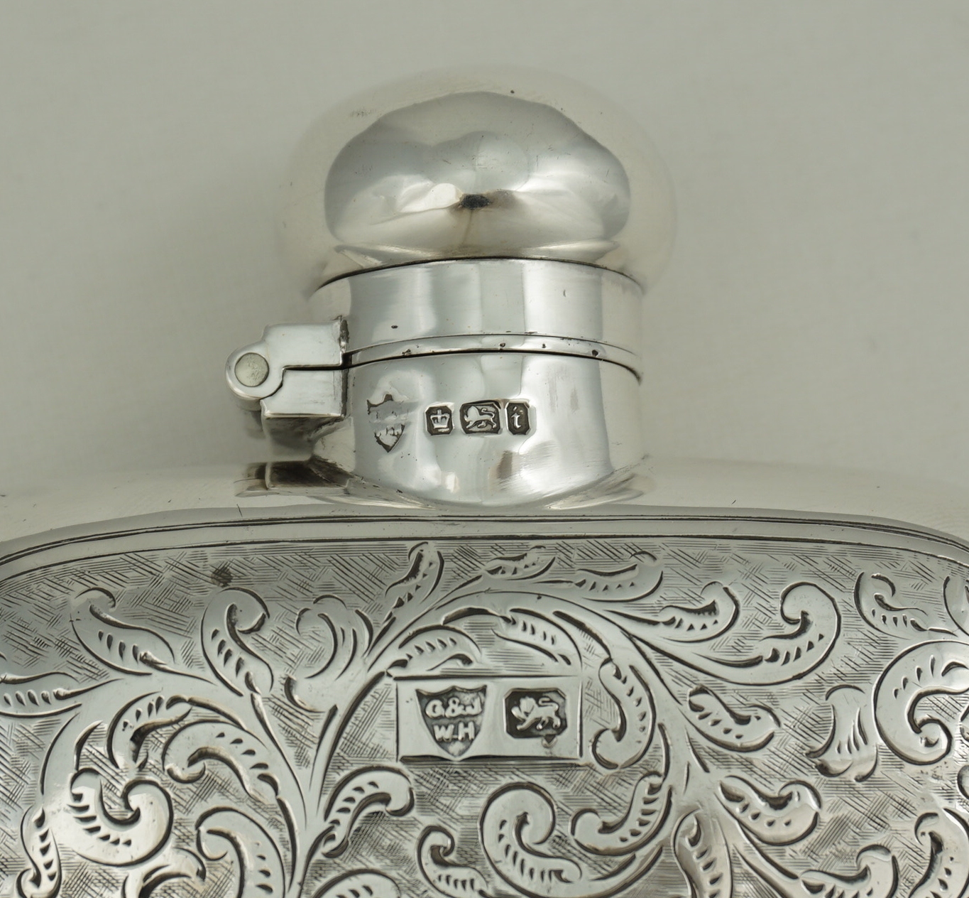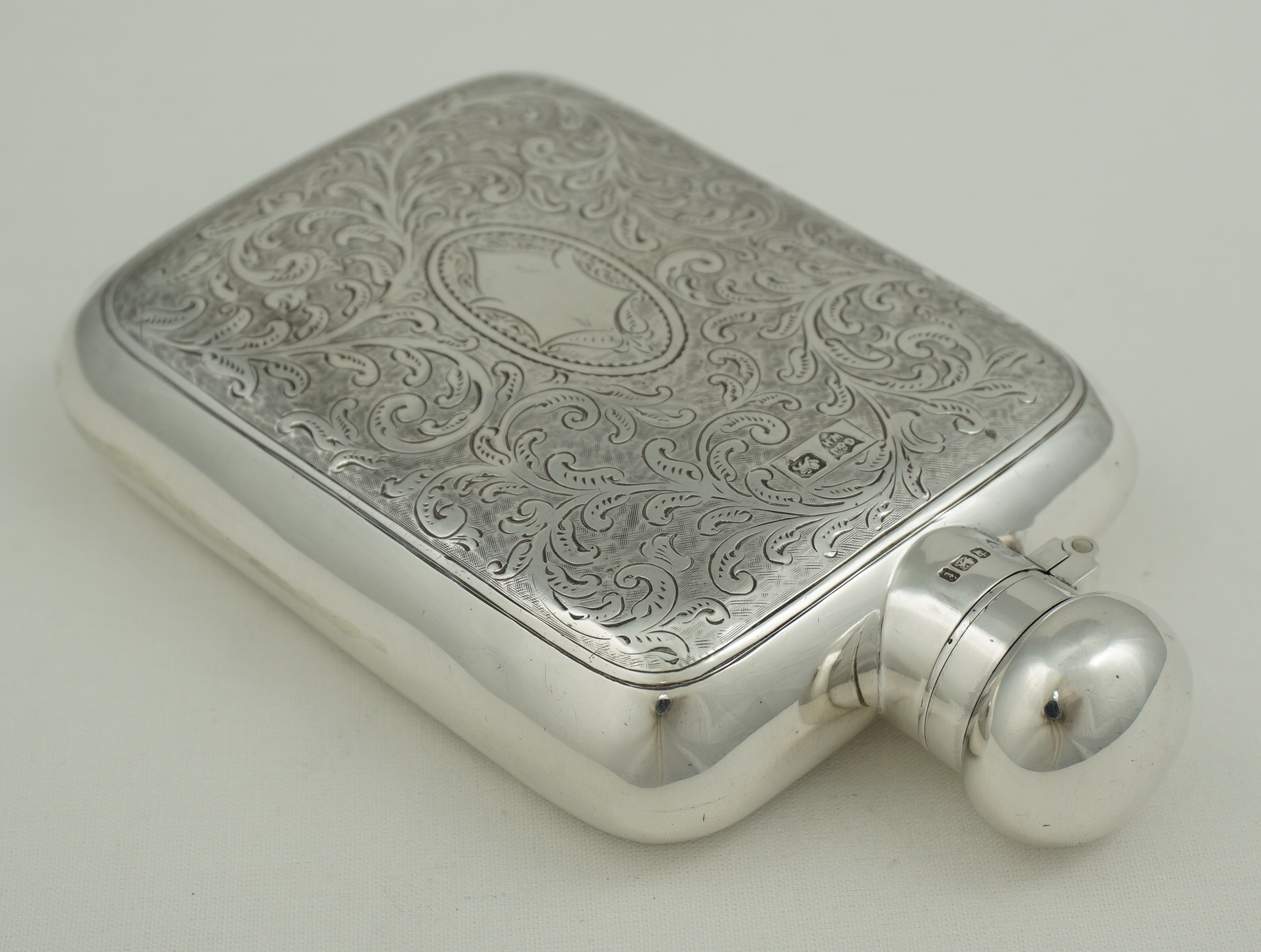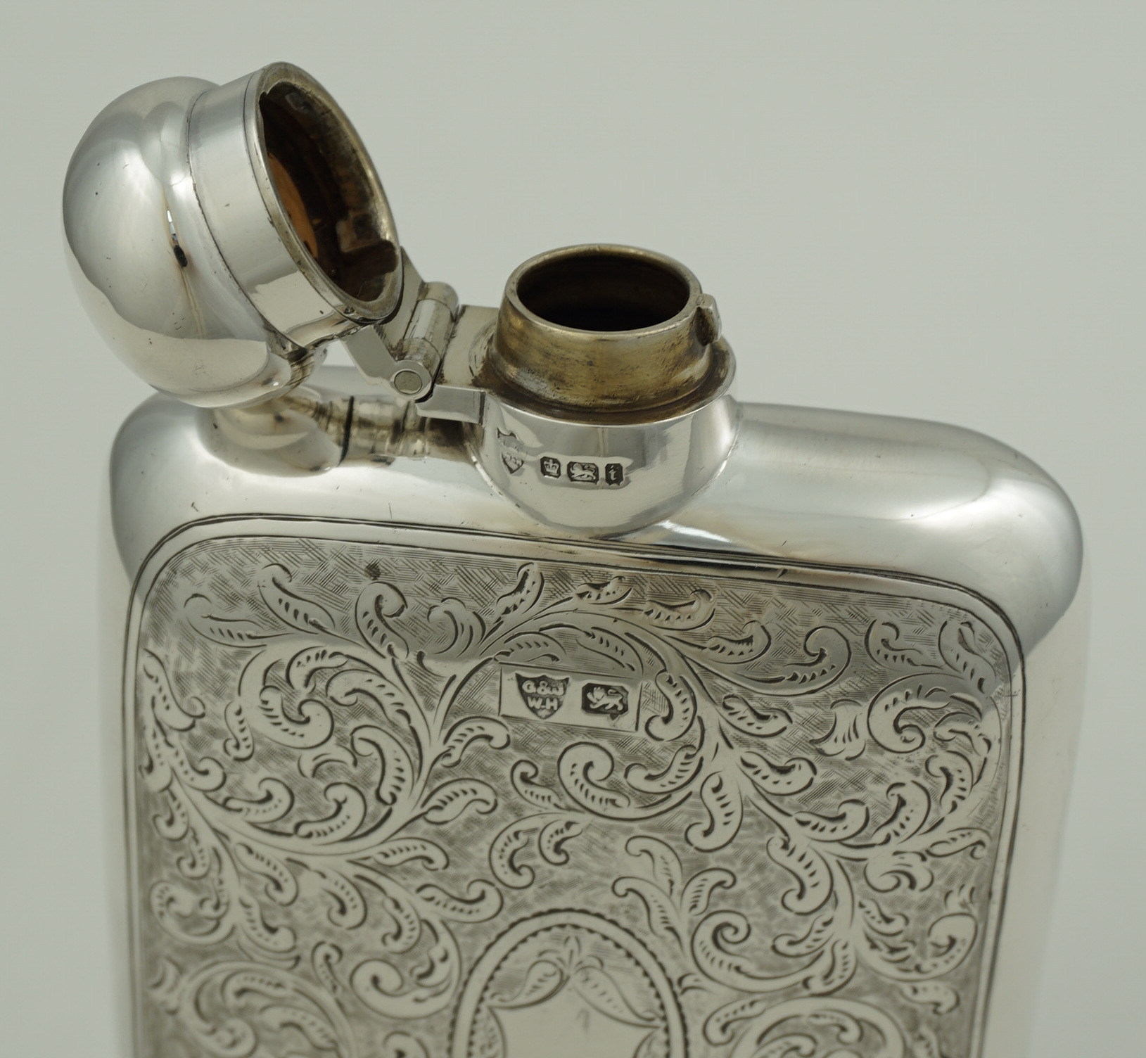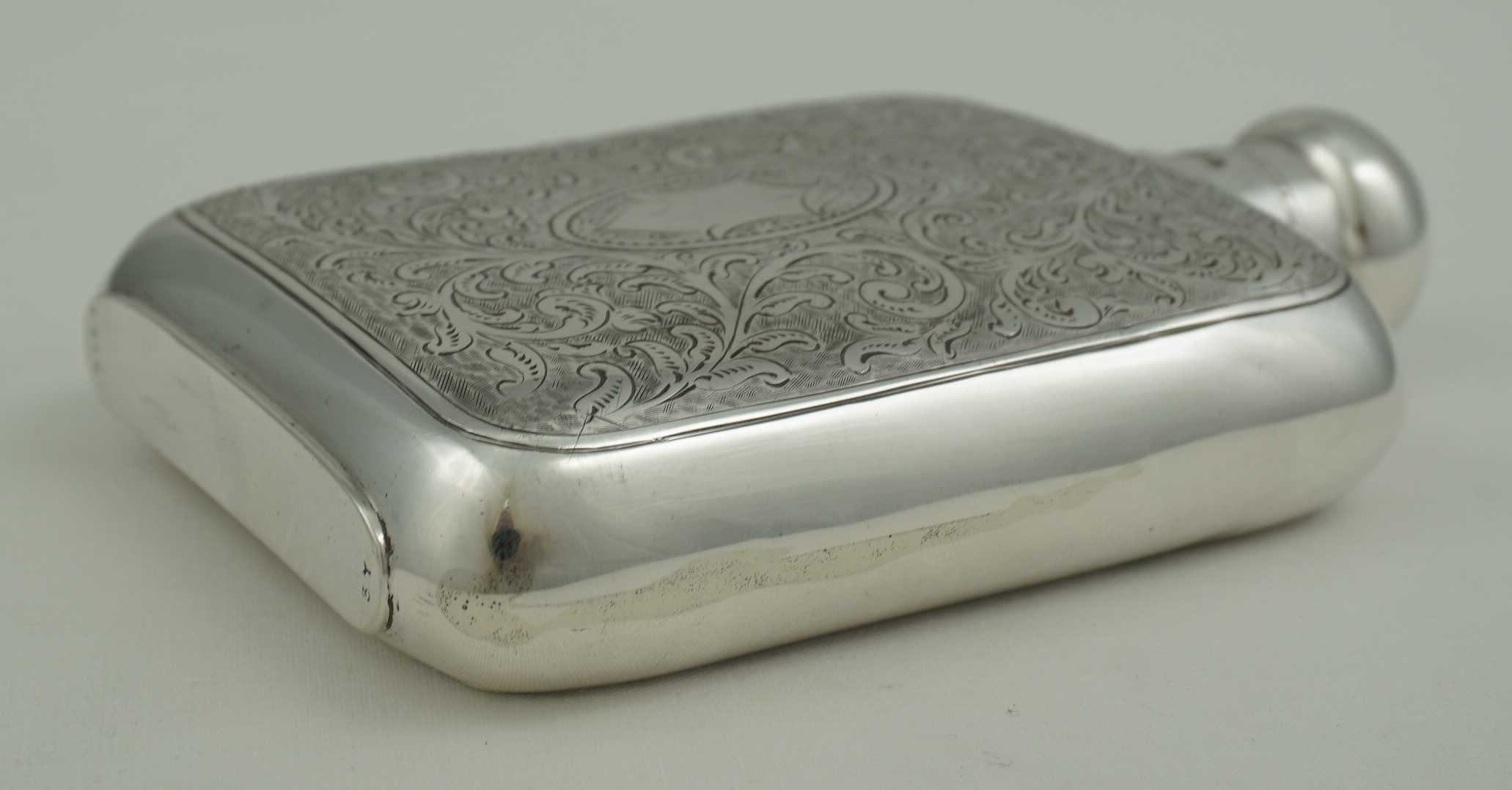 DESCRIPTION | Superb and impressive antique English Edwardian solid sterling silver pocket flask with engraved decoration. One of the finest examples that I have seen. Not only looks fantastic but, perhaps more importantly, feels fantastic in the hand and is a good size too. Benefits, I am not being flippant, from a quite significant seam repair. Most of these flasks will have seam splits or seam repair, sometimes both. You can see the original solder joint all around the edge where the two flat halves meet. In this instance a beautifully executed and delicate thin grey line. Obviously too delicate as the seam has popped on one side and a tiny bit near the bottom corner on the other, perhaps when a loaded and closed flask has been sat on. The repairing silversmith has decided that this is not going to happen again and has strengthened this weak spot significantly. Seen best in image eight and image seven for the little spot near the bottom corner on the other side. Not only a stunning example but now robust too. |