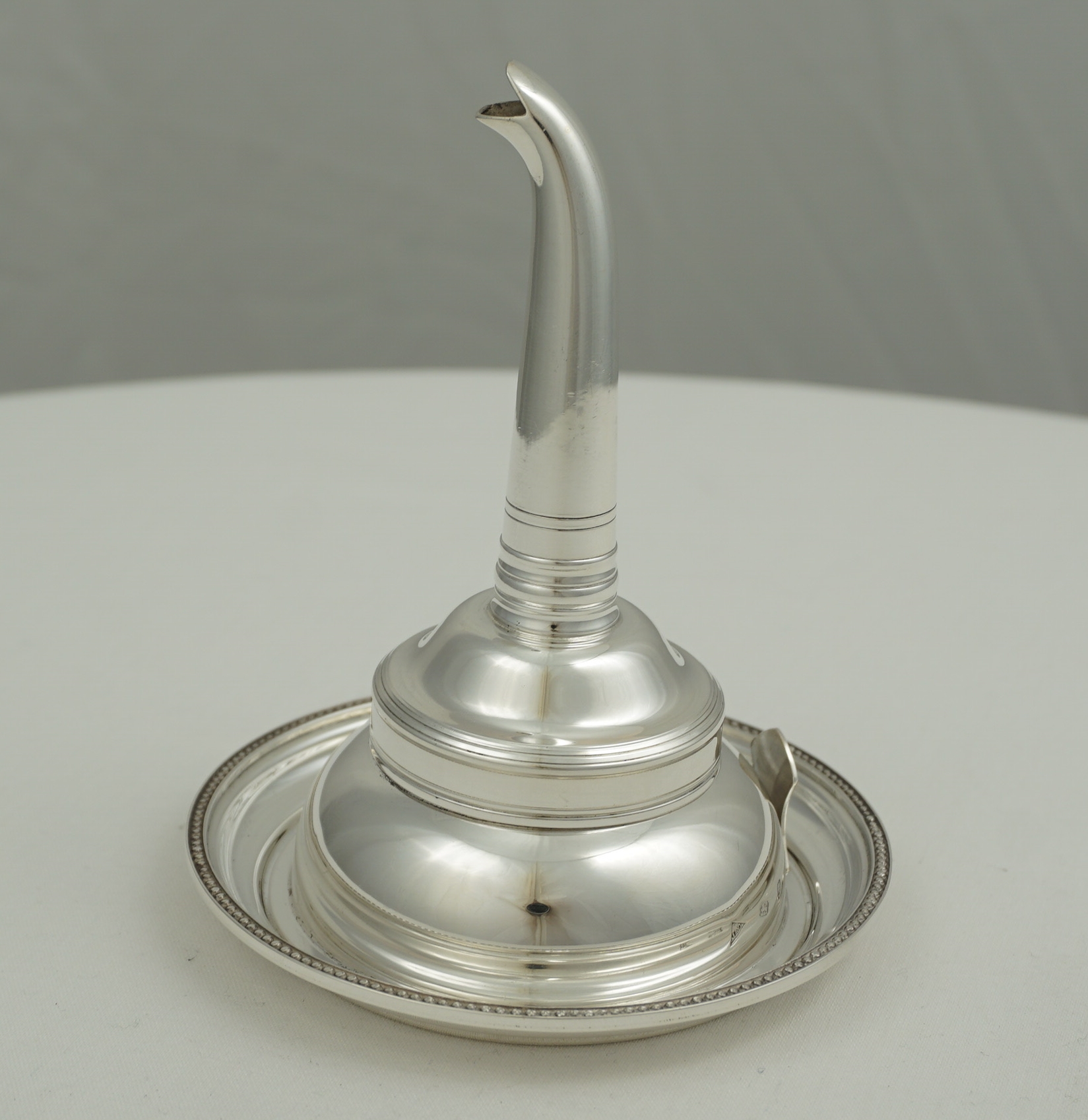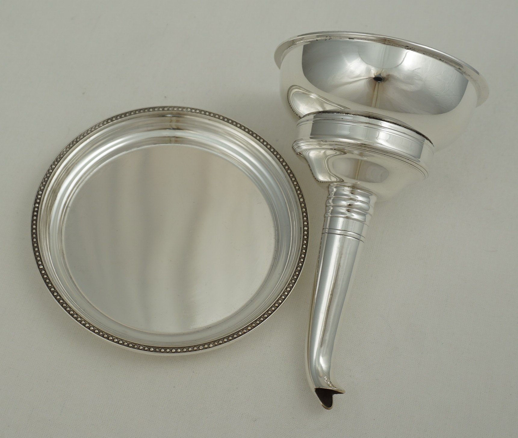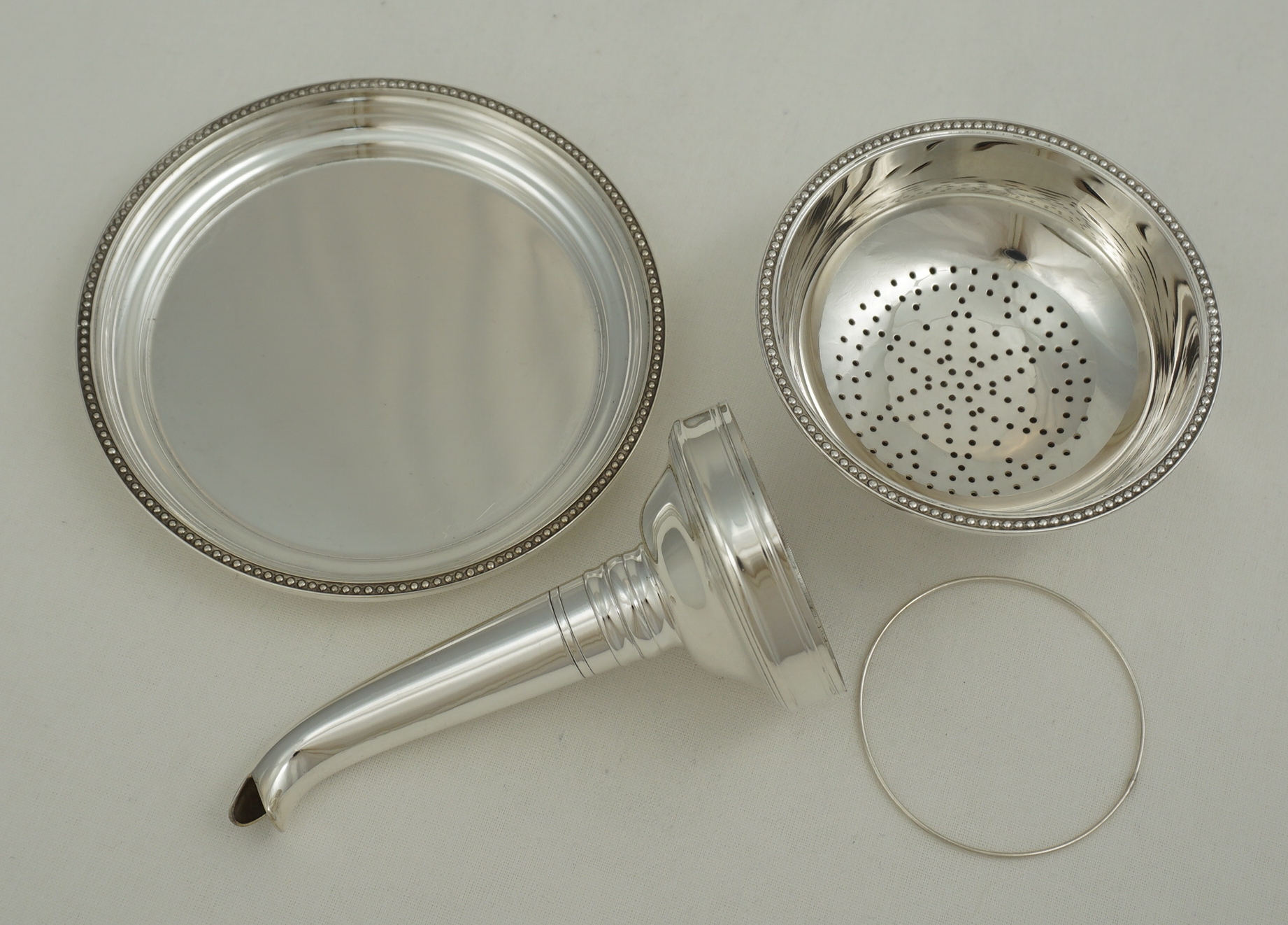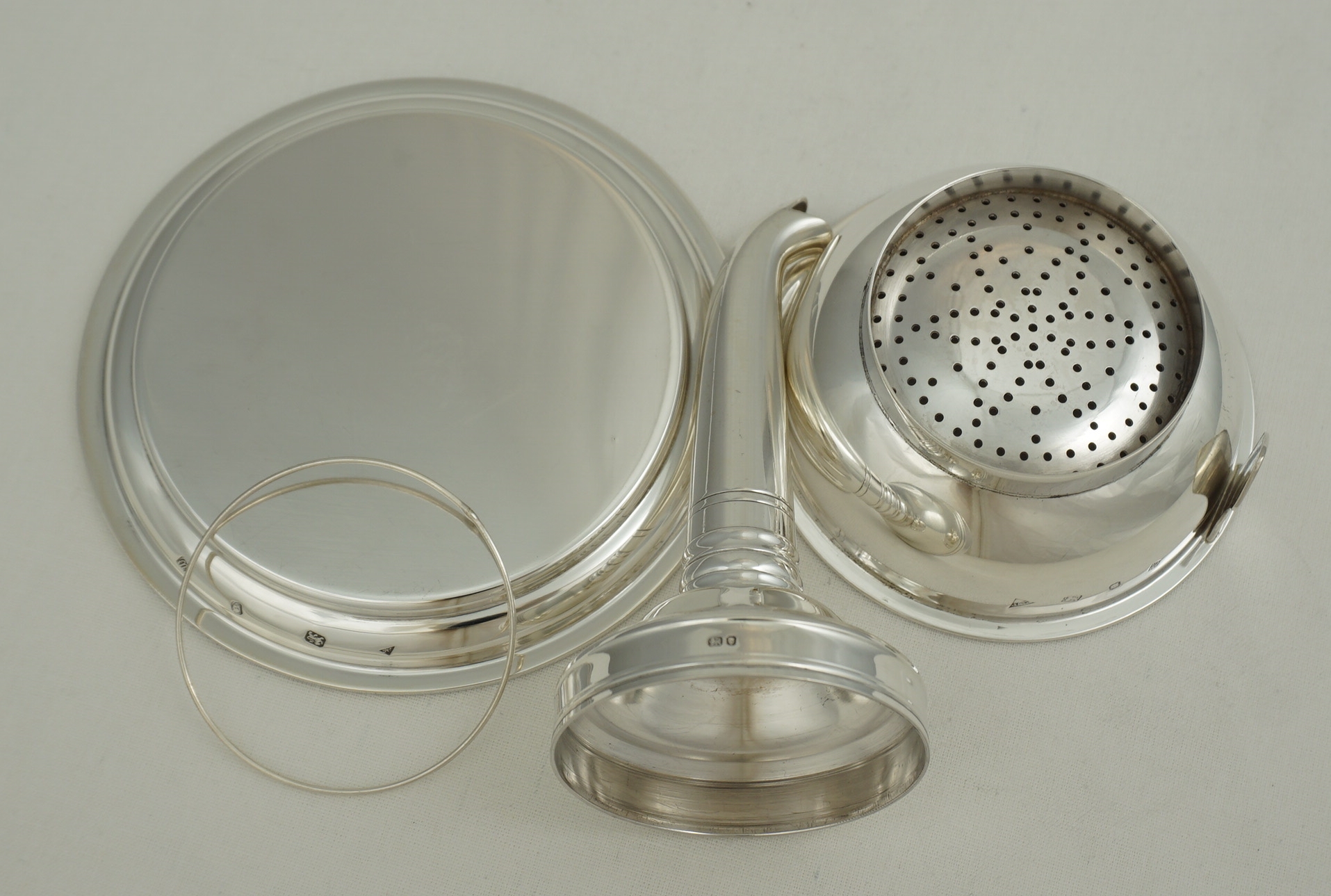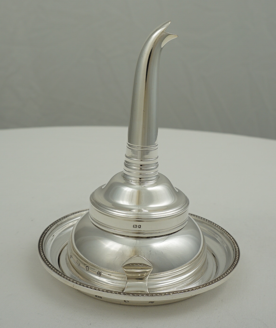 DESCRIPTION | Excellent vintage English solid sterling silver wine funnel complete with muslin ring and stand. |