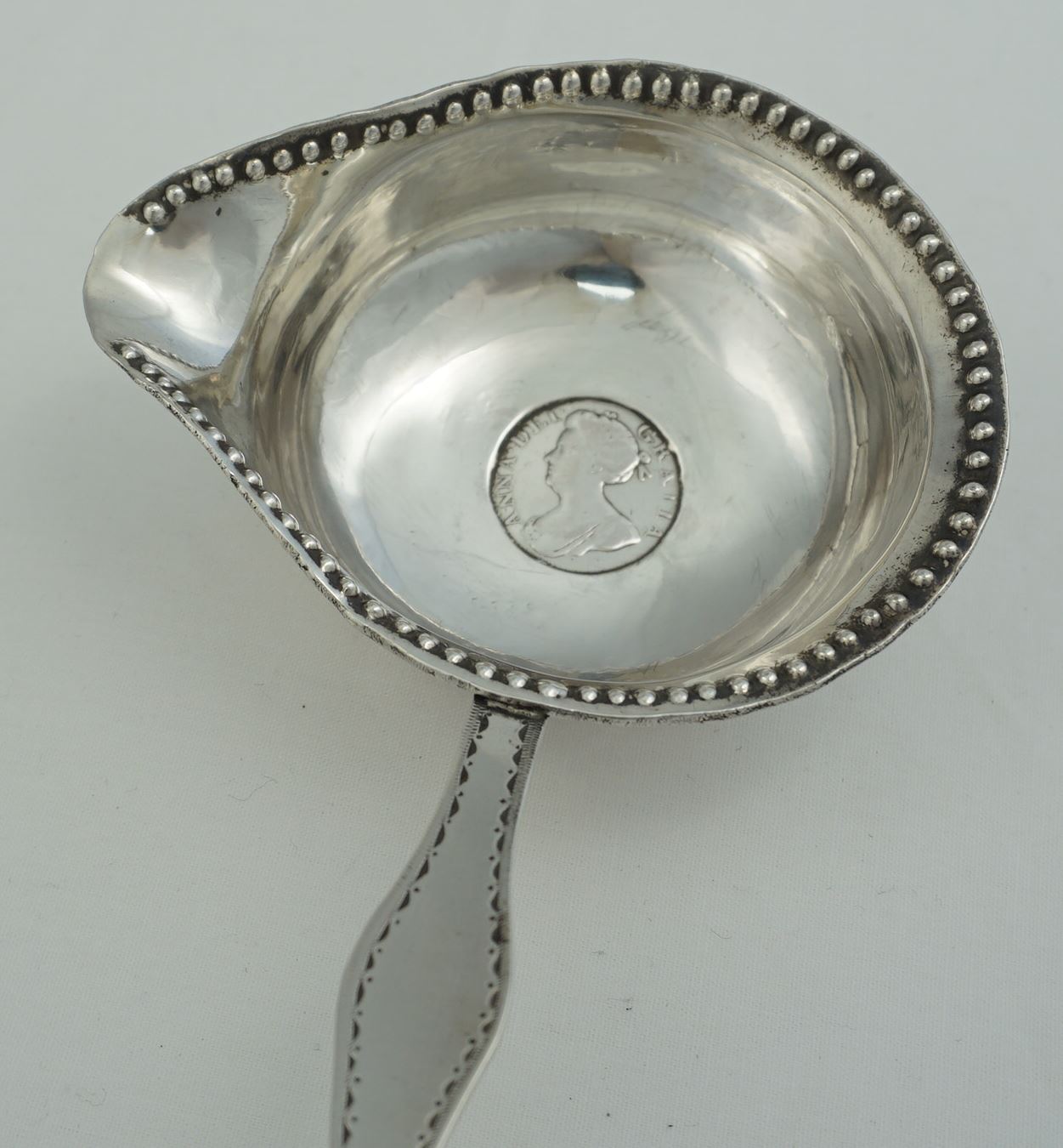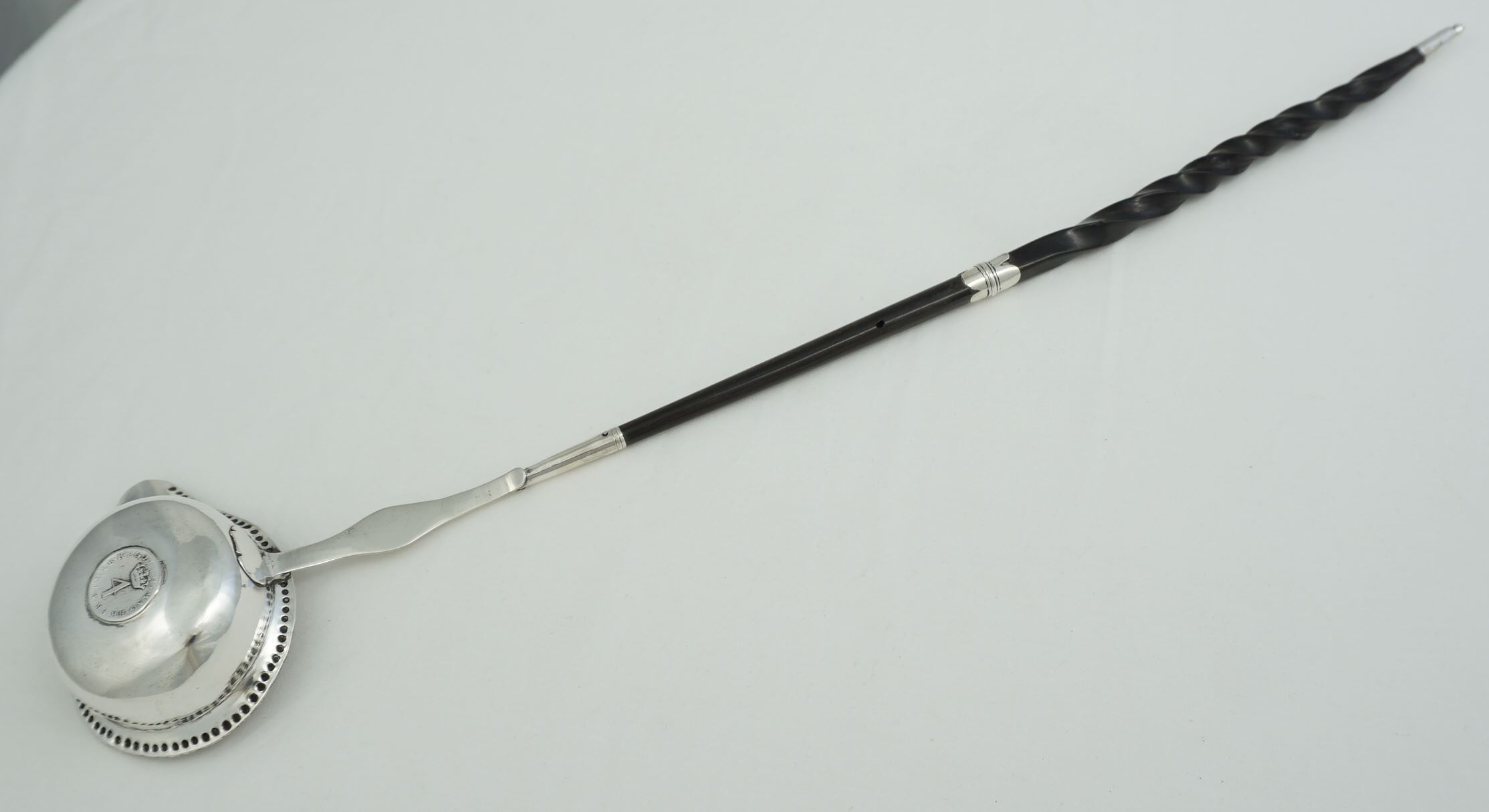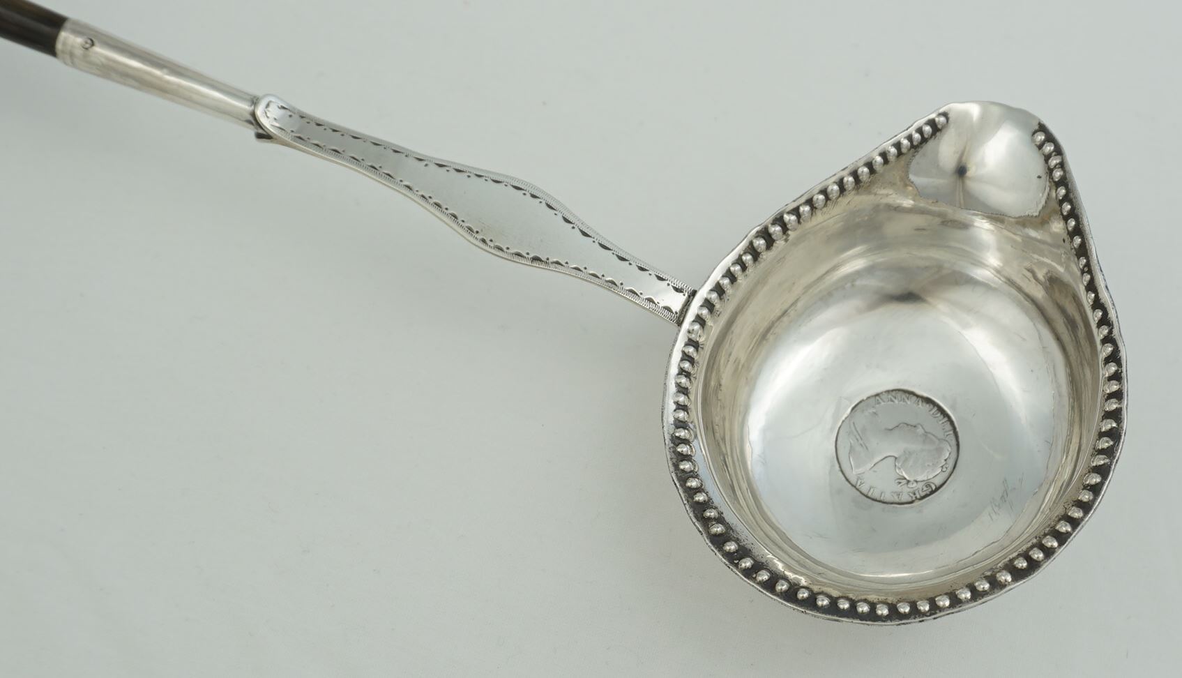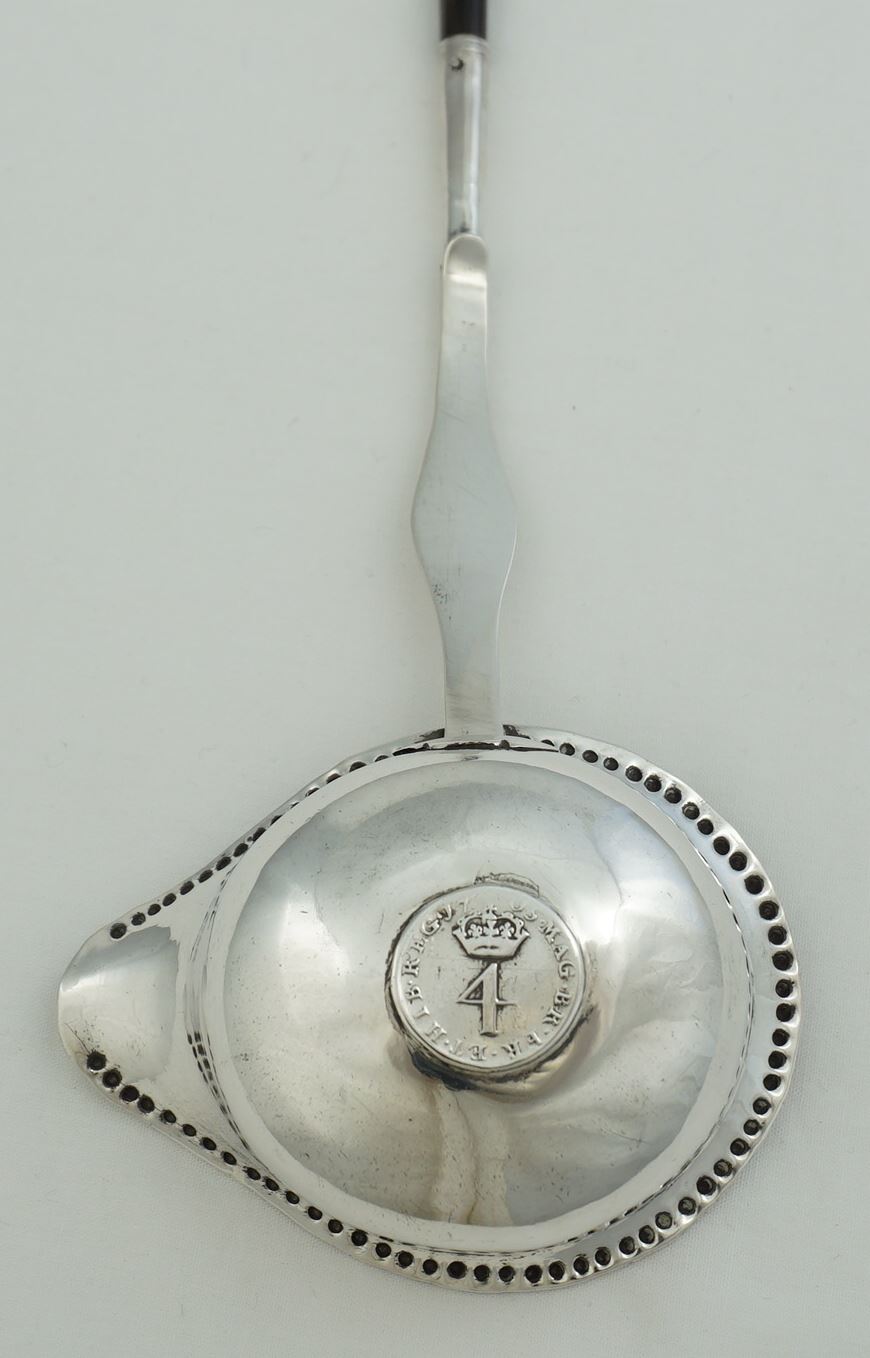 | DESCRIPTION | Exceptionally long antique English Georgian solid sterling silver toddy ladle, the bowl inset with a silver 1705 Queen Anne fourpence. |