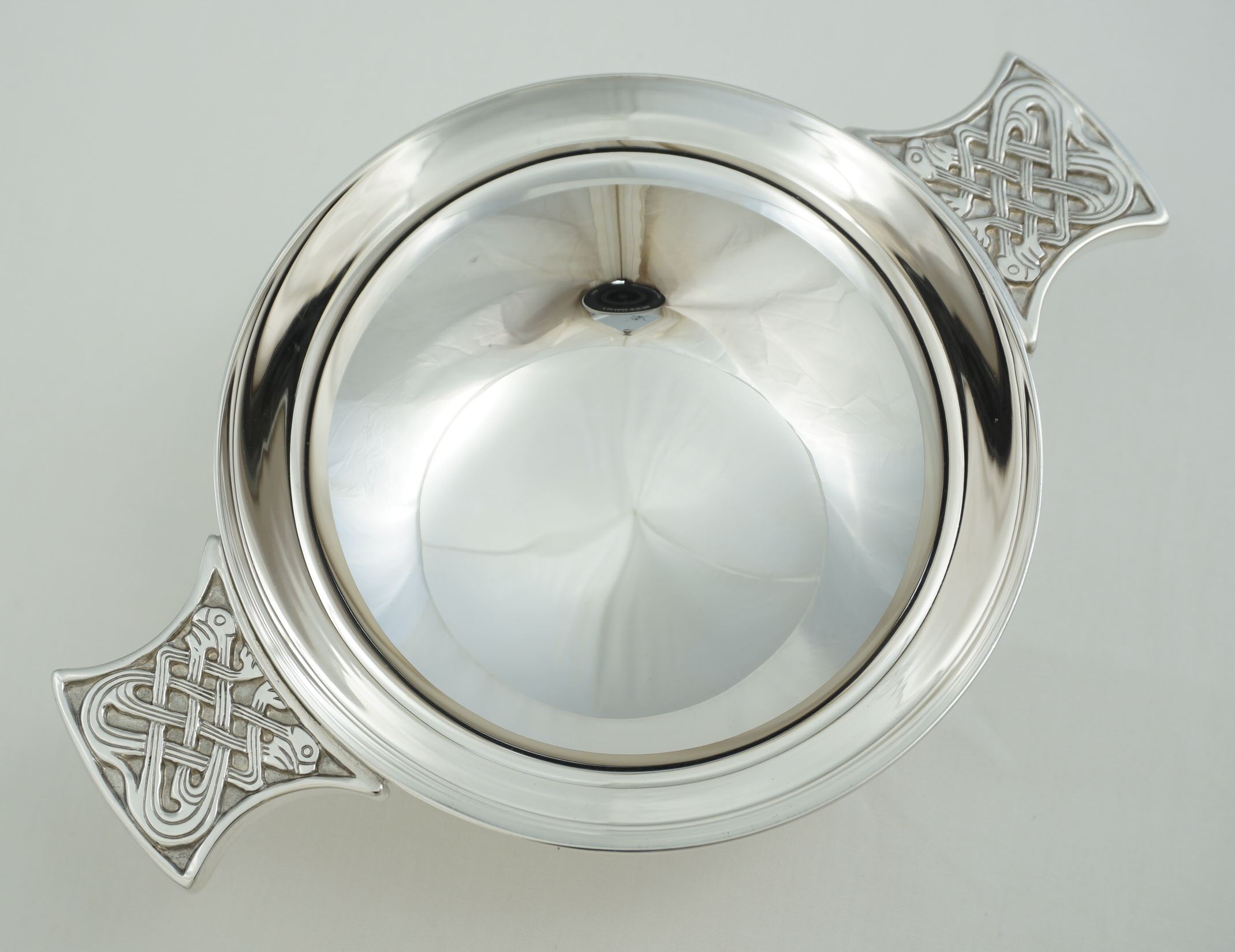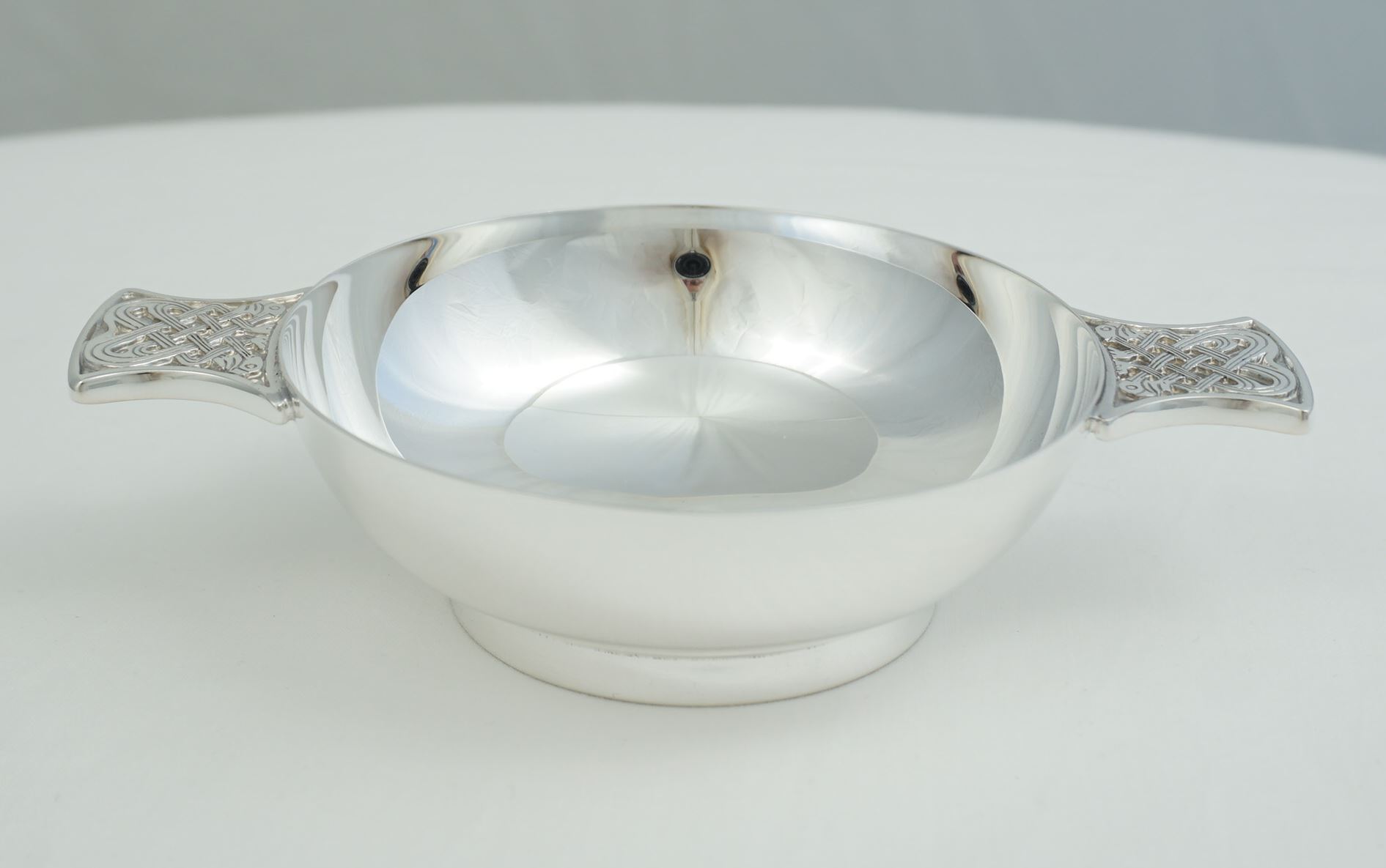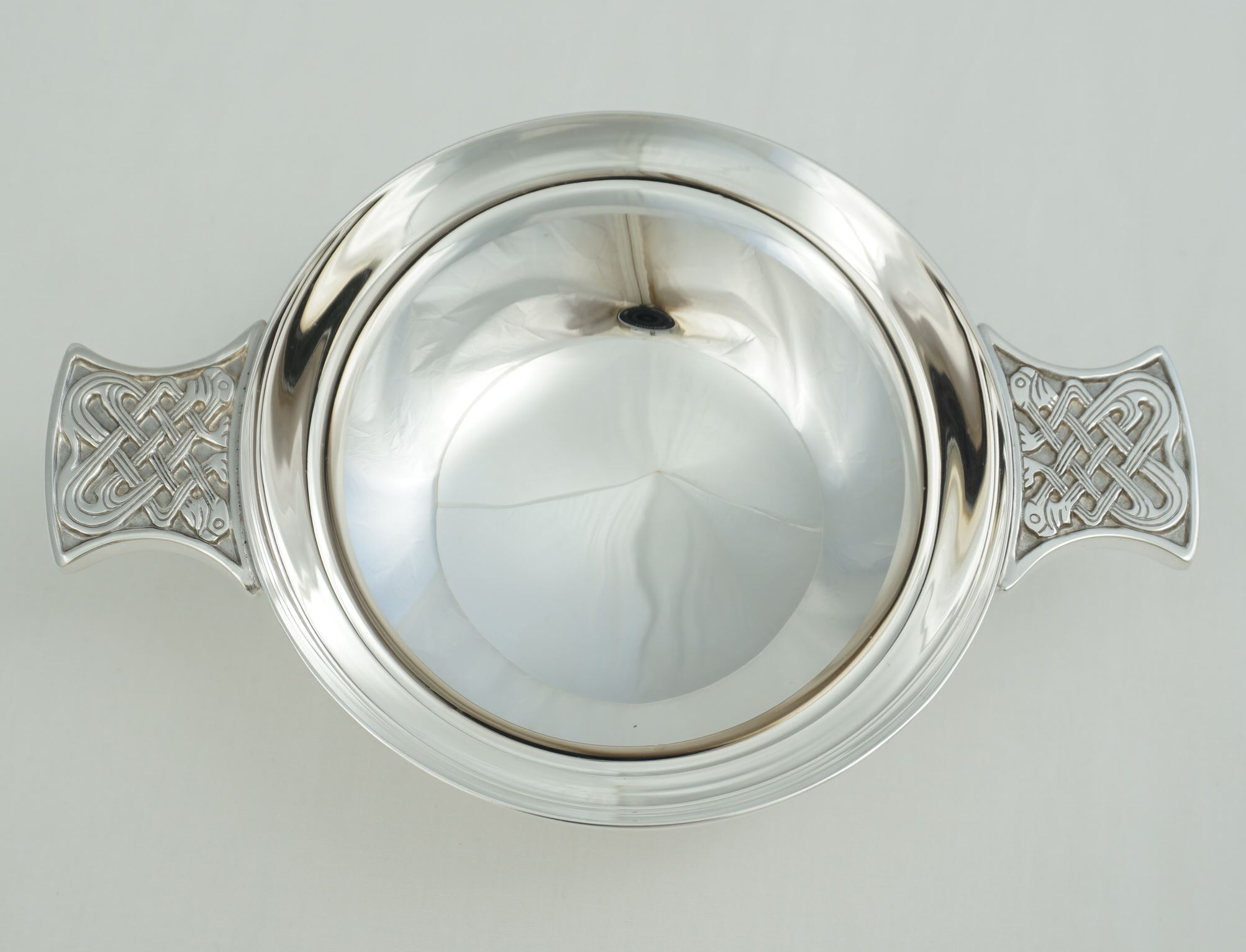 DESCRIPTION | Very good vintage Scottish solid sterling silver quaich (two handled drinking bowl for whisky) with Celtic style decoration. |