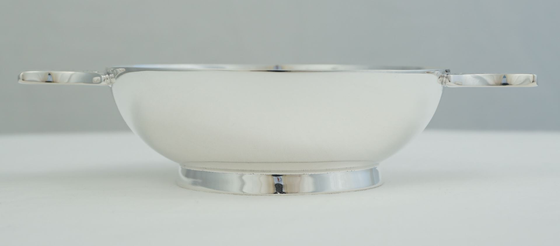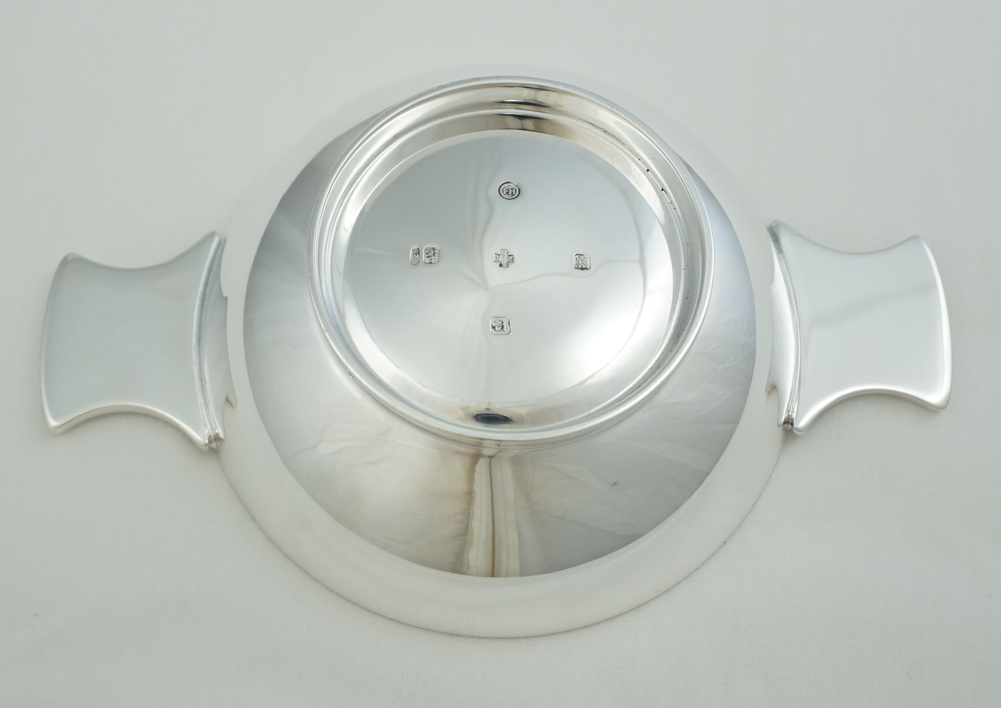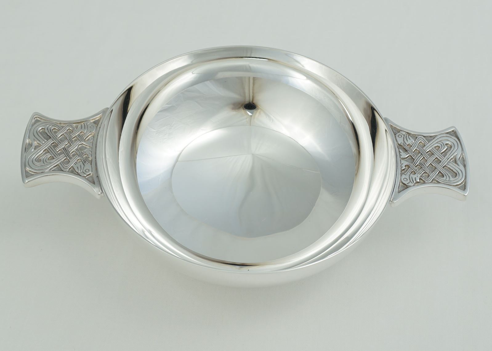 DESCRIPTION | Very good vintage Scottish solid sterling silver quaich (two handled drinking bowl for whisky) with Celtic style decoration. |