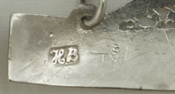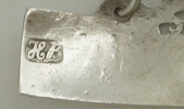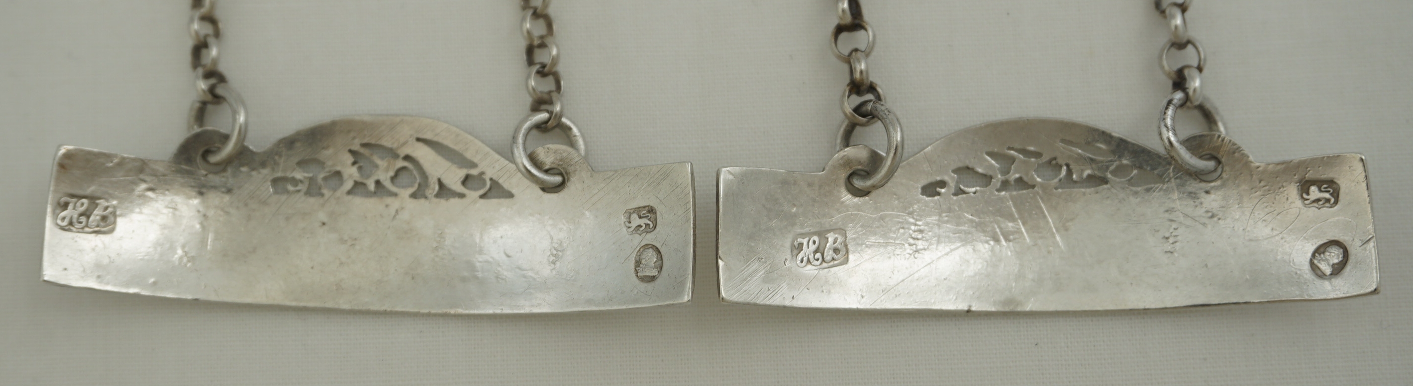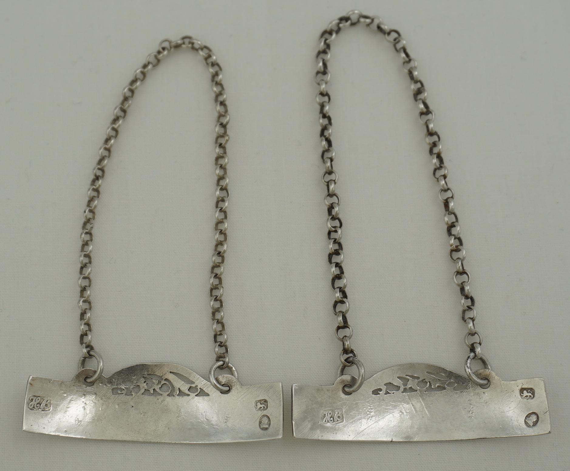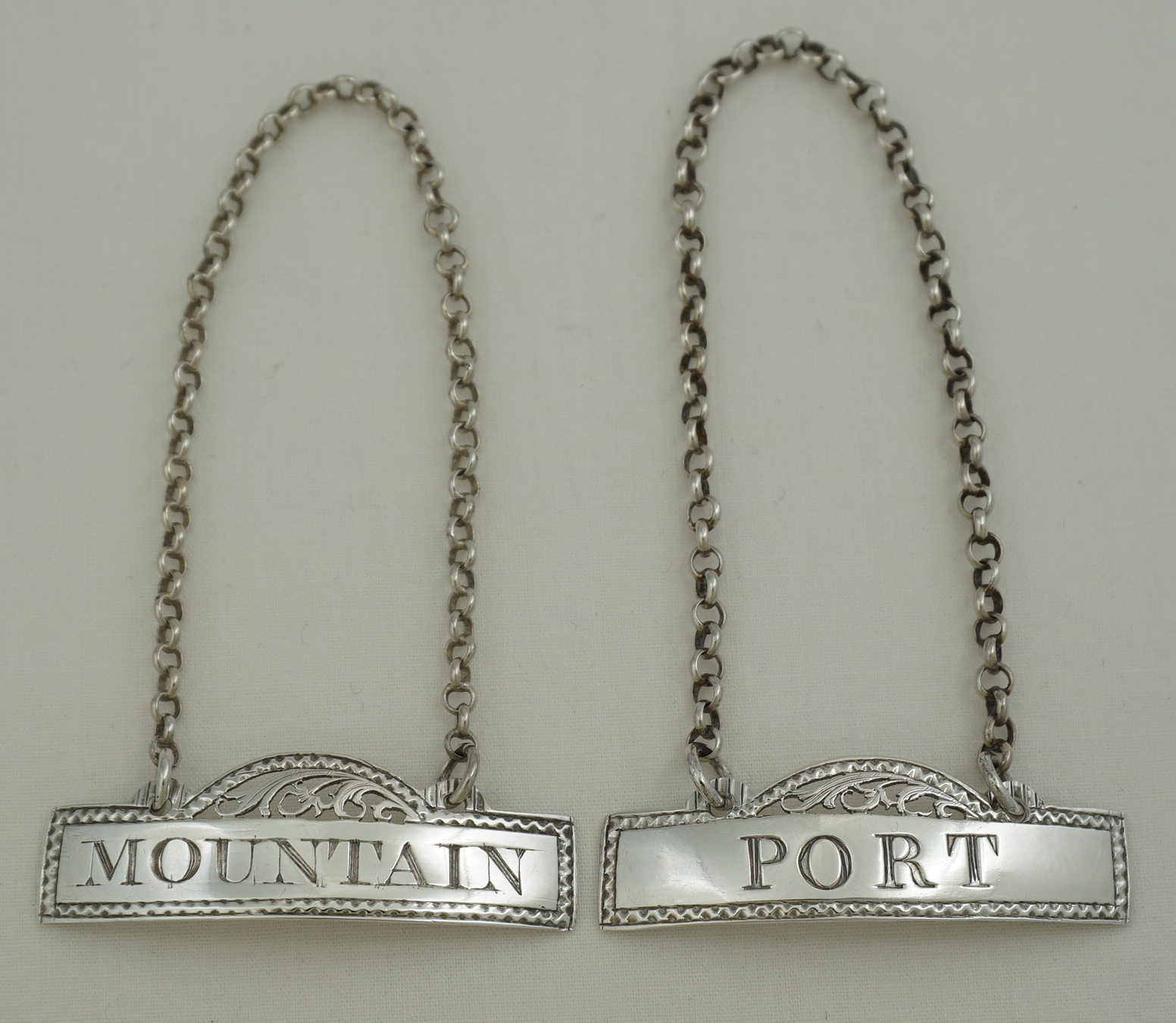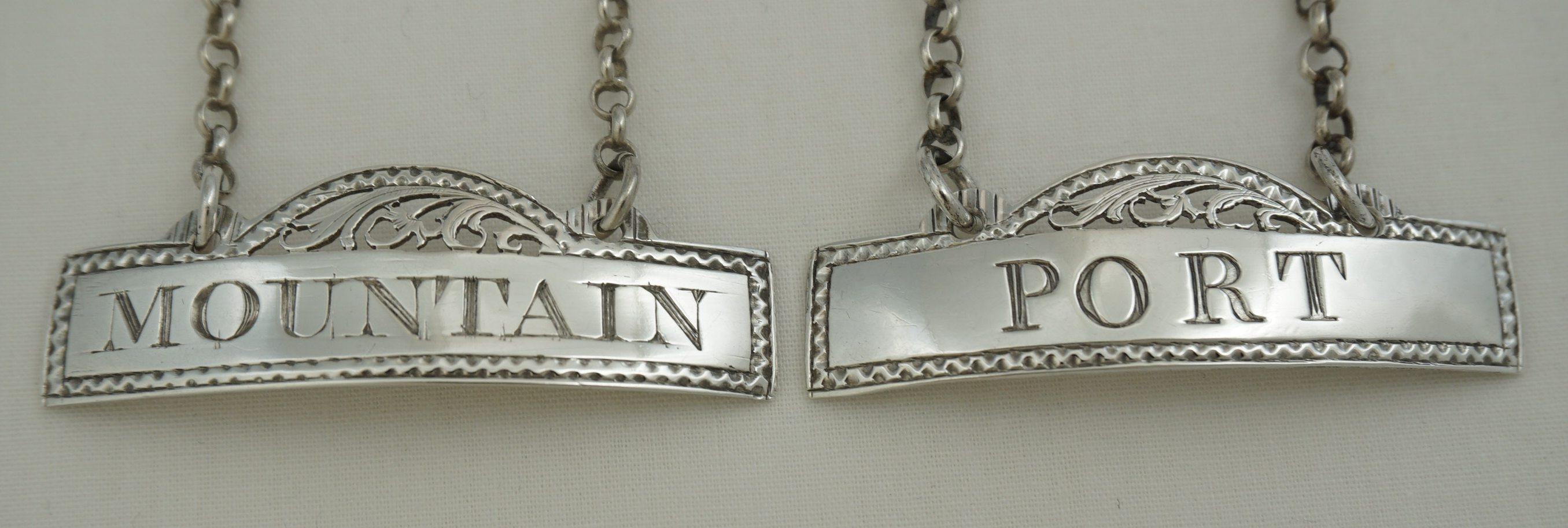 DESCRIPTION | Two scarce antique English Georgian solid sterling silver wine labels 'MOUNTAIN' (re-engraved) & 'PORT' on suspension chains. Hester Bateman designed this form circa 1770 and it has been copied by a few other makers. The Hester Bateman mark is the 4mm version registered 3rd December 1774 and the duty mark is the second version used from 1786. Hester's mark was last seen in 1790 when she retired (died 1794) so we can accurately date these pieces 1786-1790. |