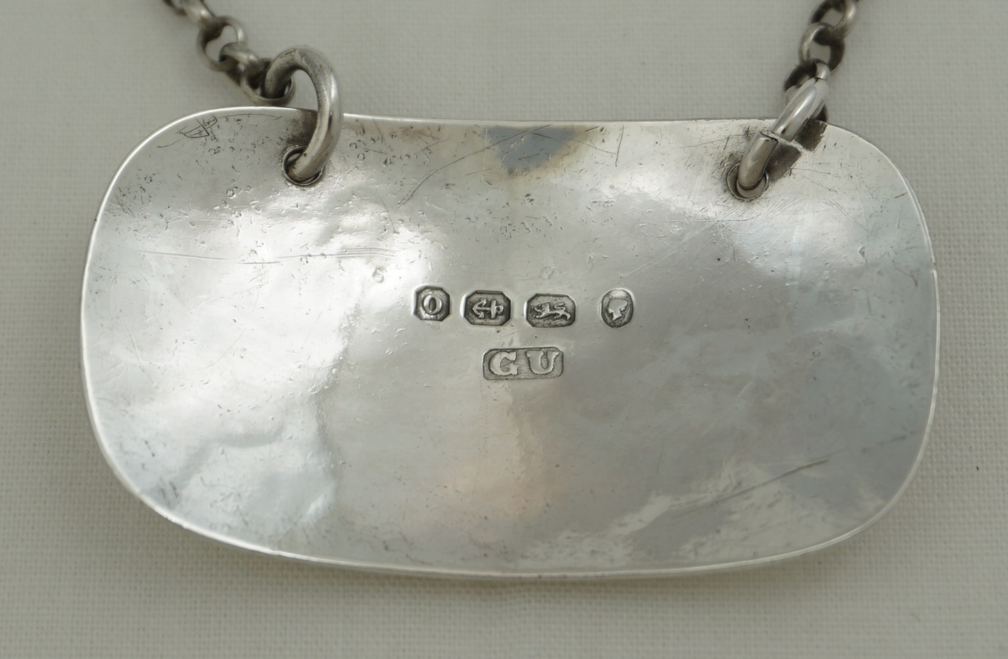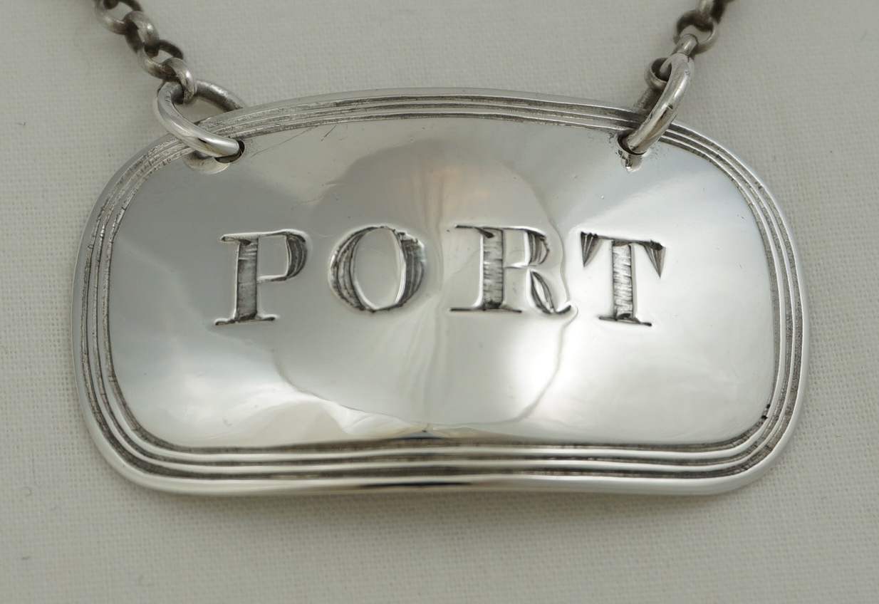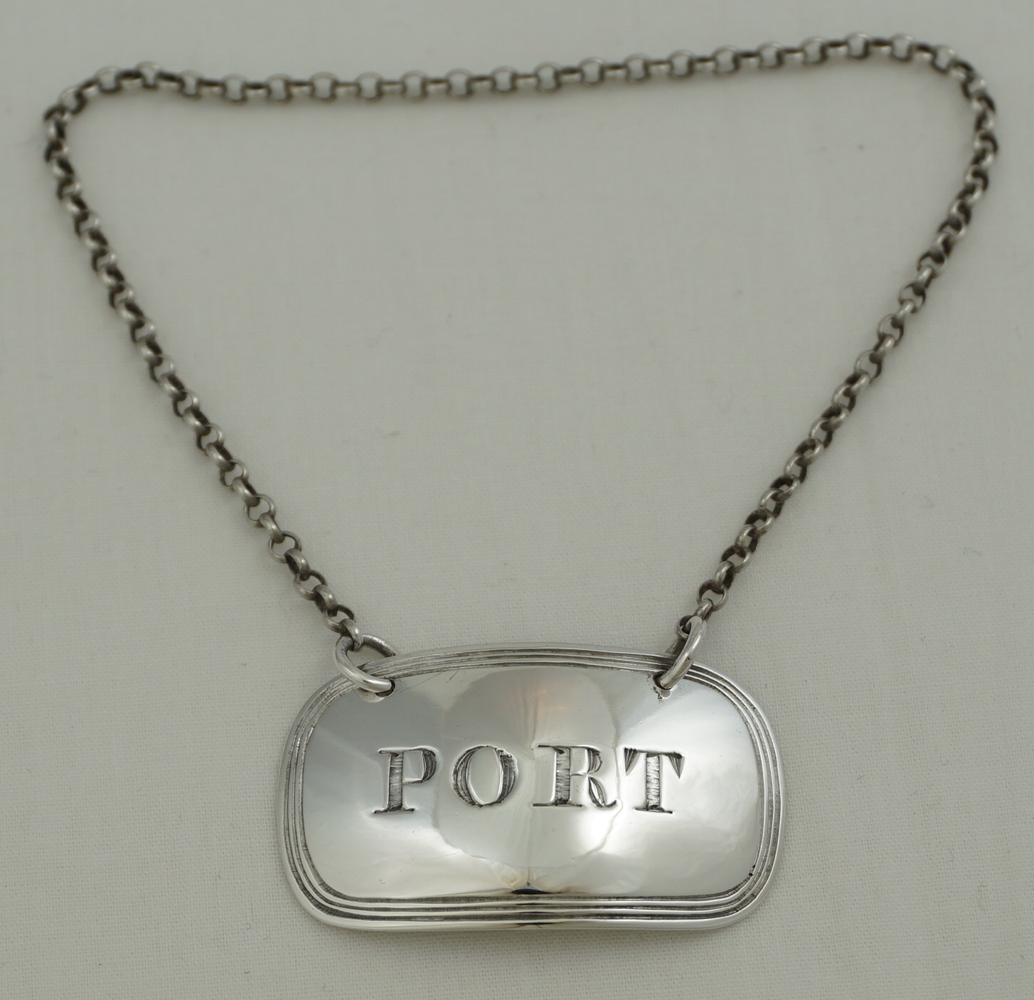DESCRIPTION | Antique English Victorian solid sterling silver 'PORT' wine label with suspension chain. |
