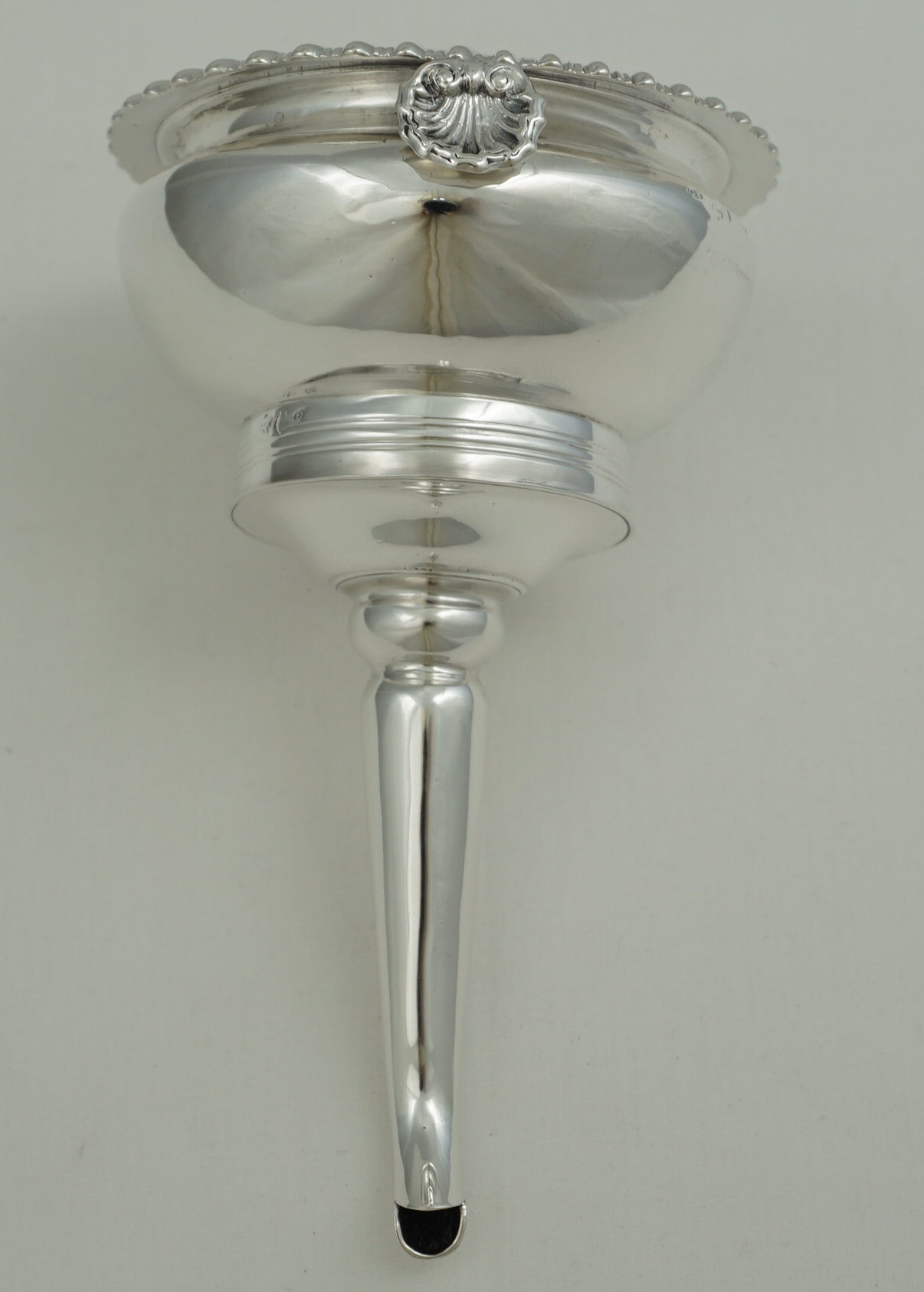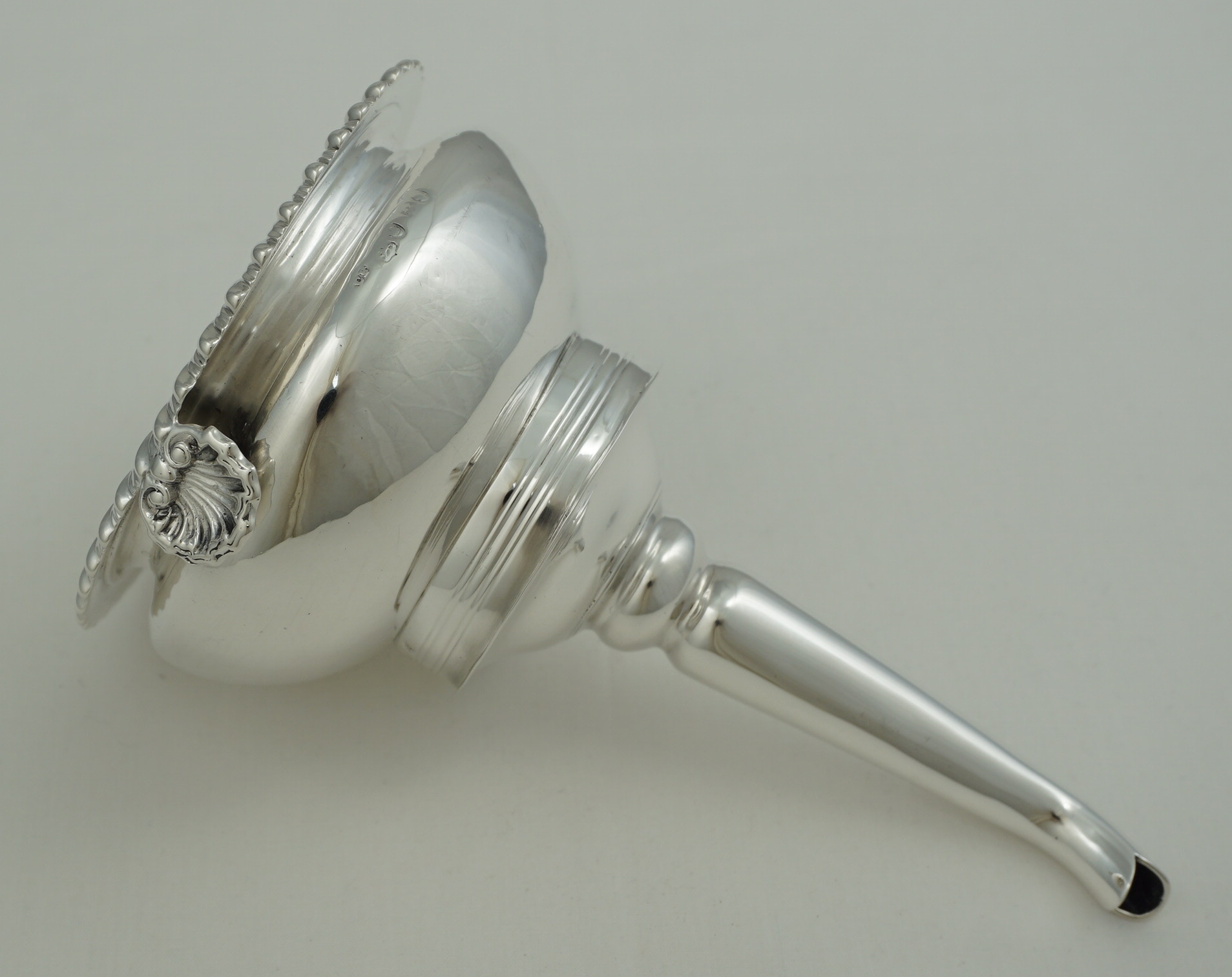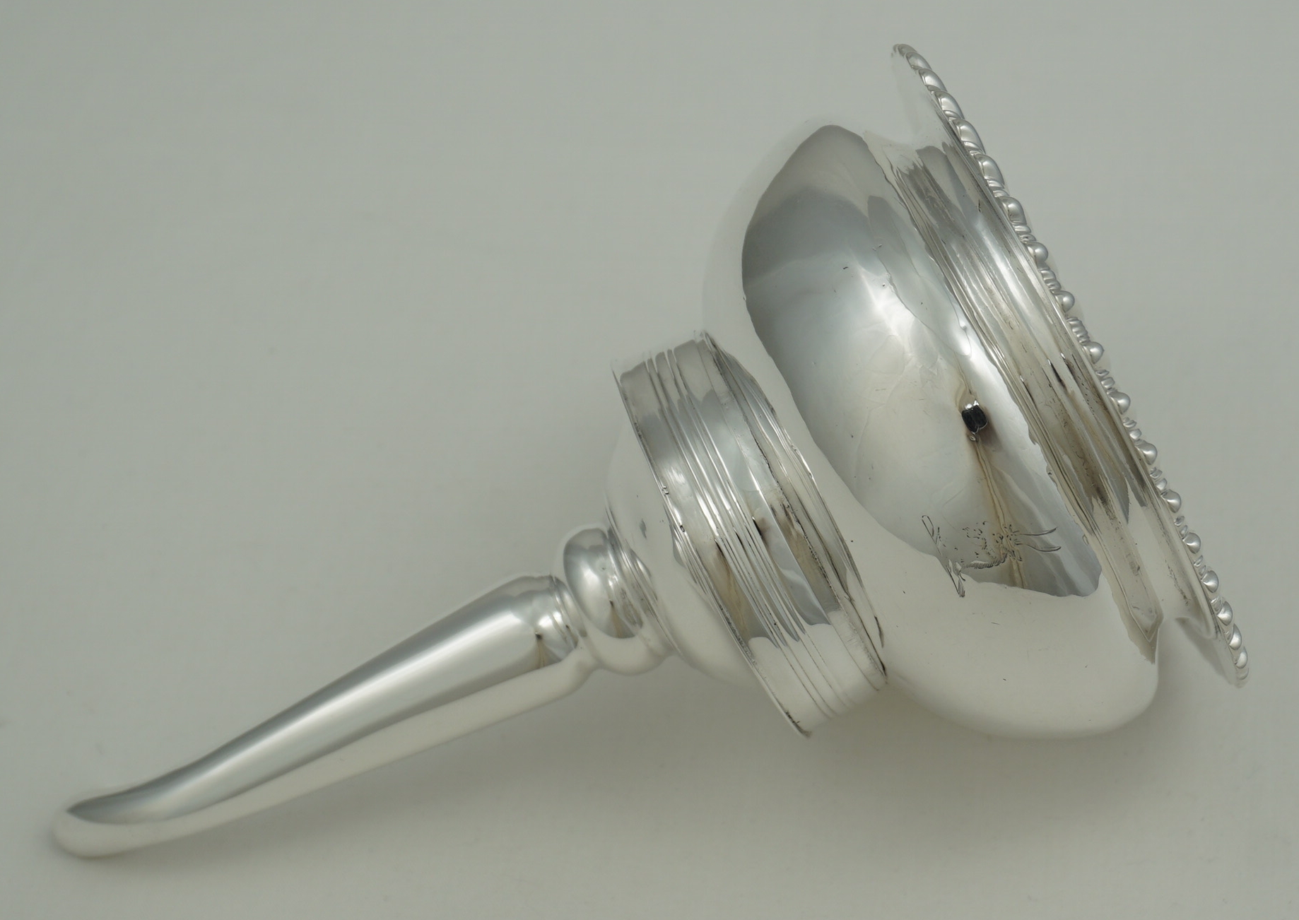 DESCRIPTION | High quality antique English very early Victorian solid sterling silver wine funnel with gadroon decorated top ring, husk form suspension tang, goat head crest and original muslin ring. |