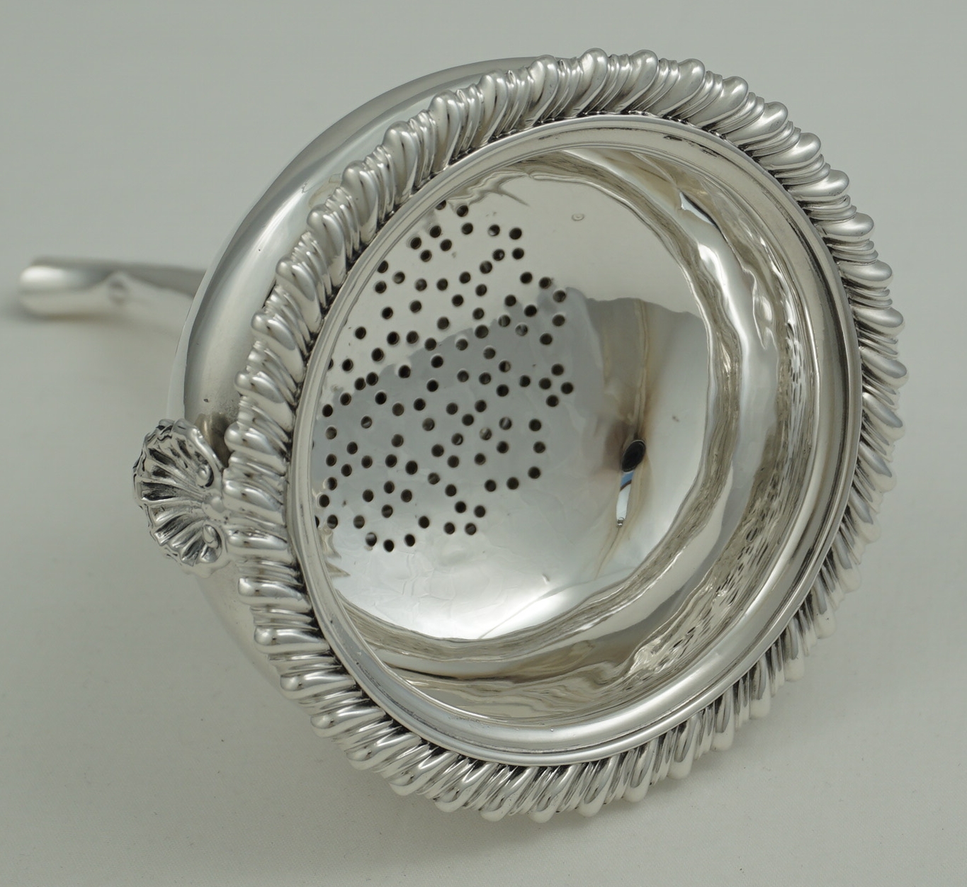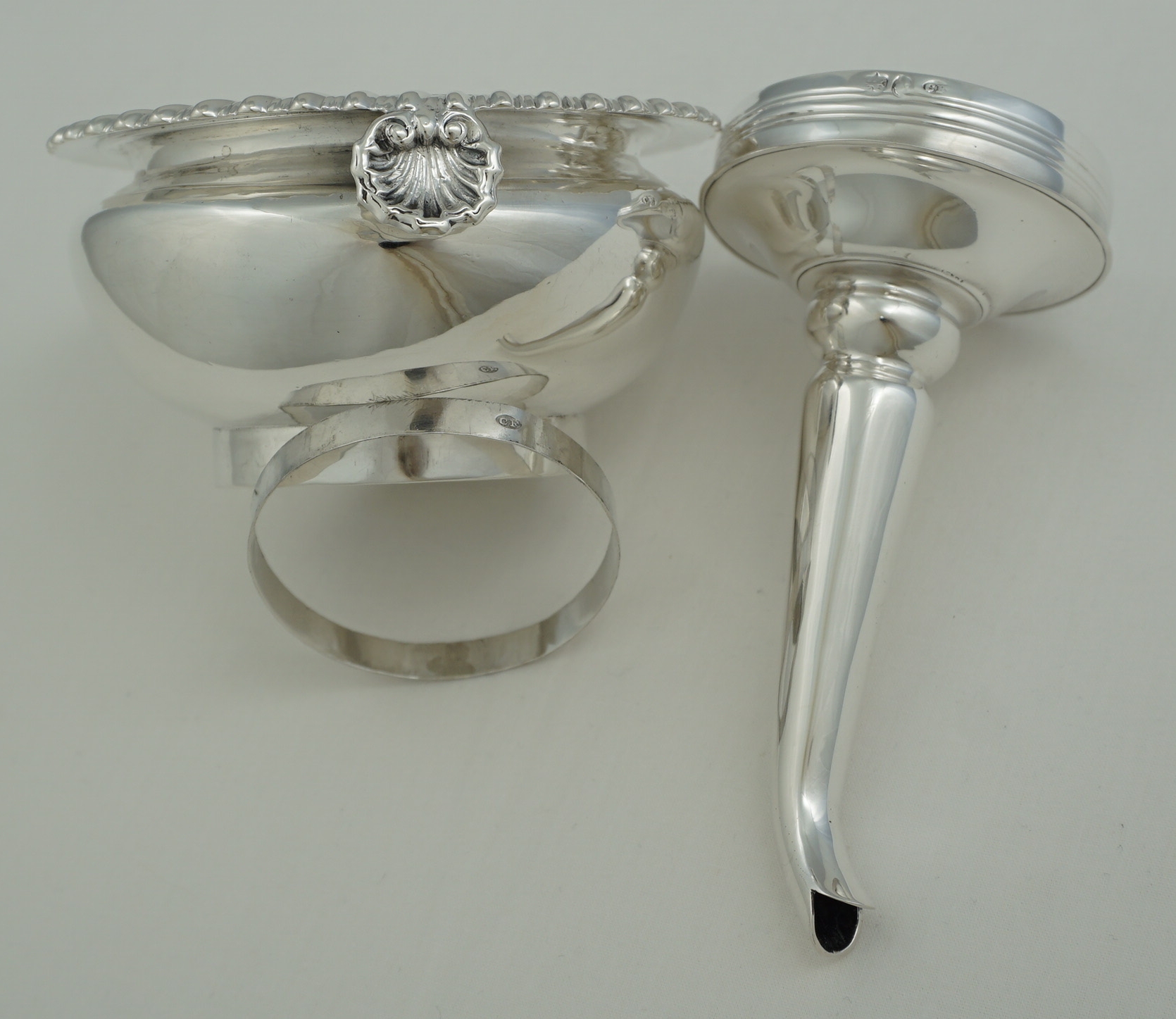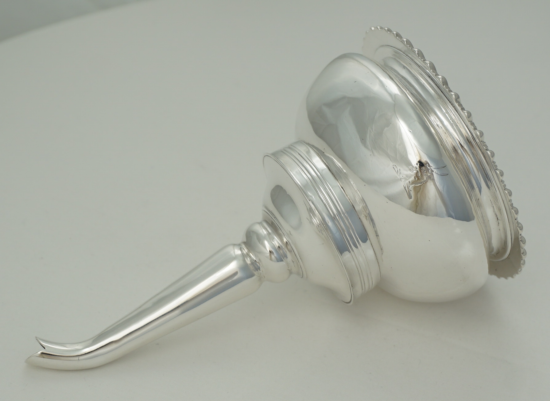 DESCRIPTION | High quality antique English very early Victorian solid sterling silver wine funnel with gadroon decorated top ring, husk form suspension tang, goat head crest and original muslin ring. |
