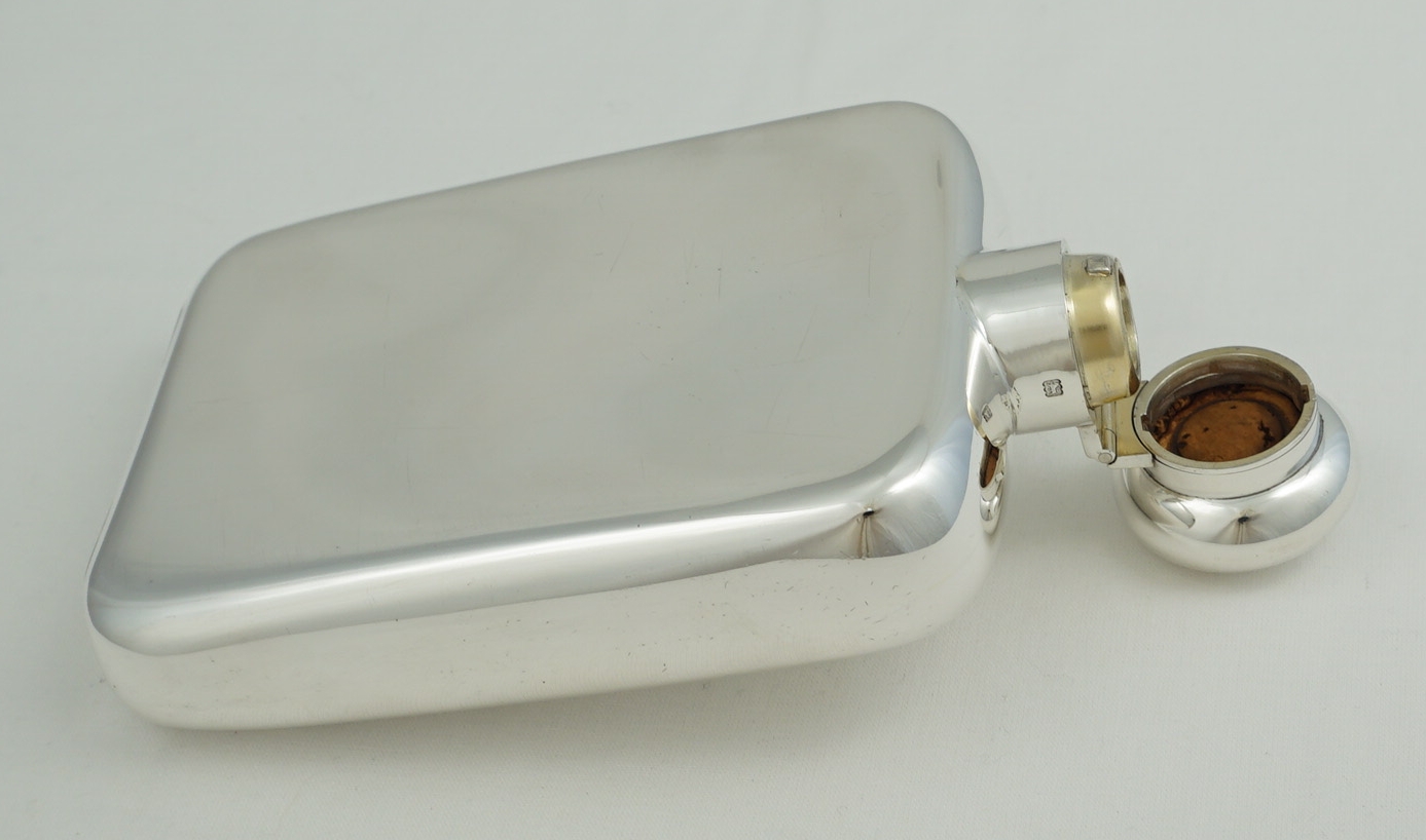 DESCRIPTION | Large, high quality and heavy antique English Edwardian solid sterling silver gilt pocket flask. Holds 300ml and has been tested leak proof with both air and water. |