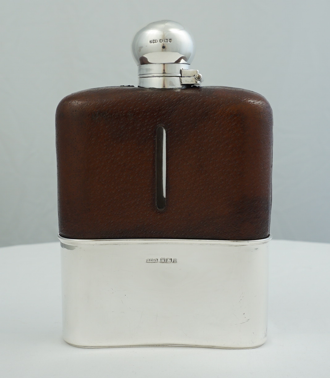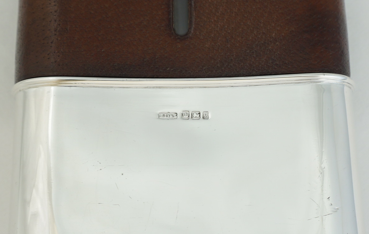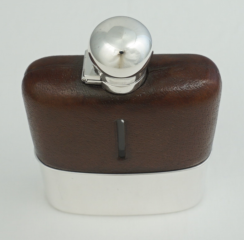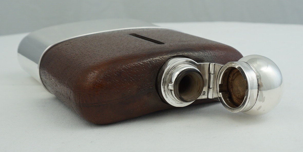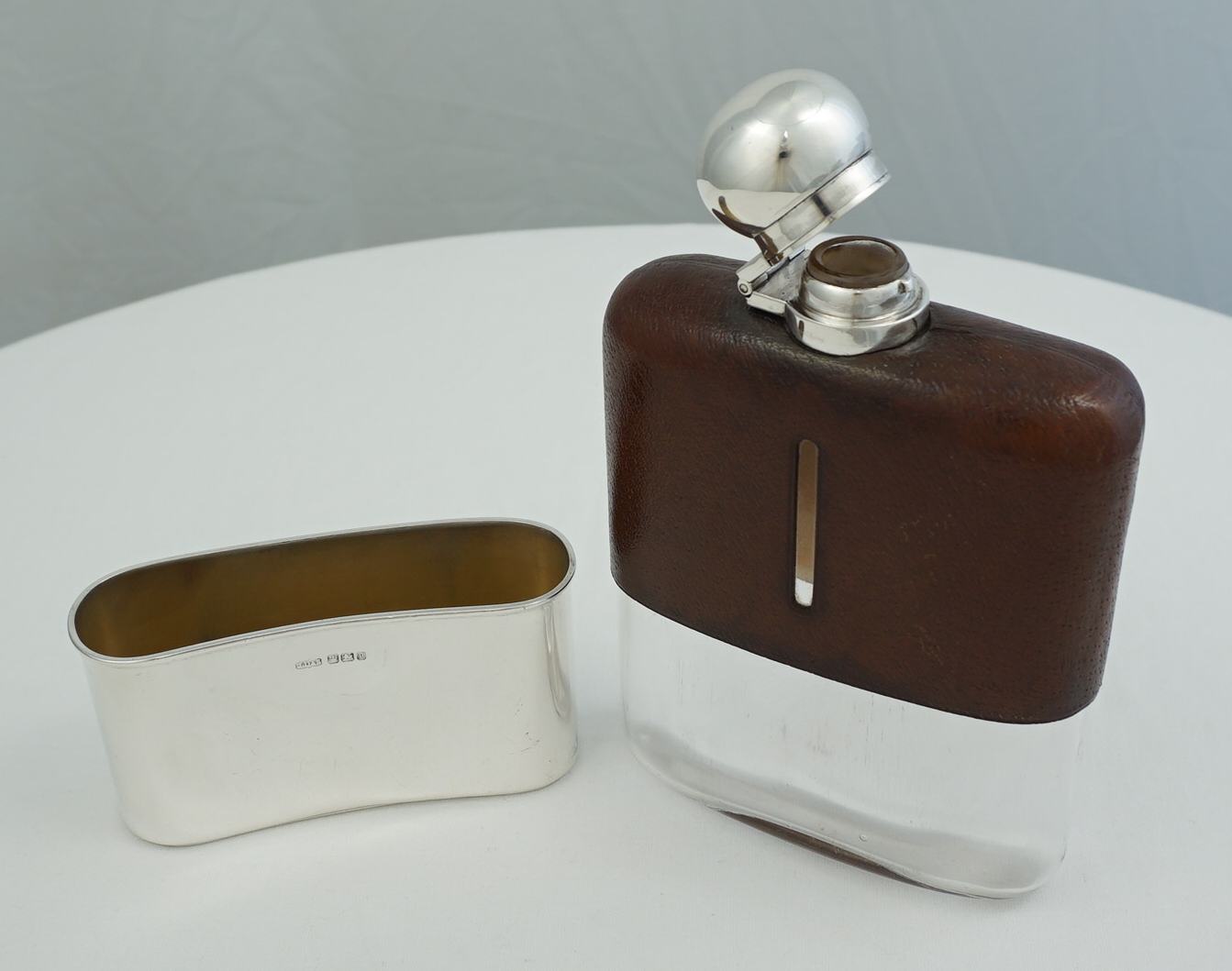 DESCRIPTION | Large, high quality and heavy antique English Victorian solid sterling silver gilt and leather mounted glass pocket flask. Holds 250ml and has been tested leak proof with both air and water. |