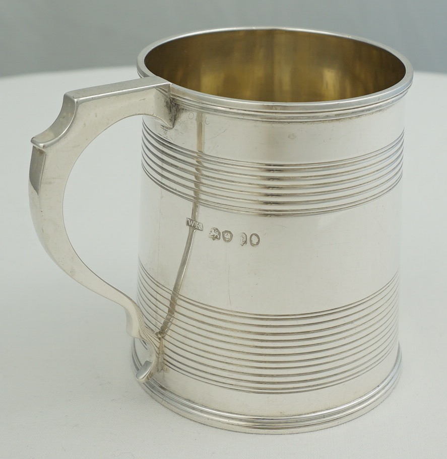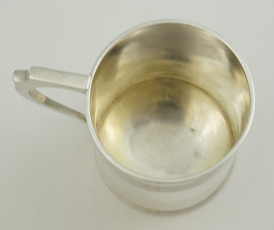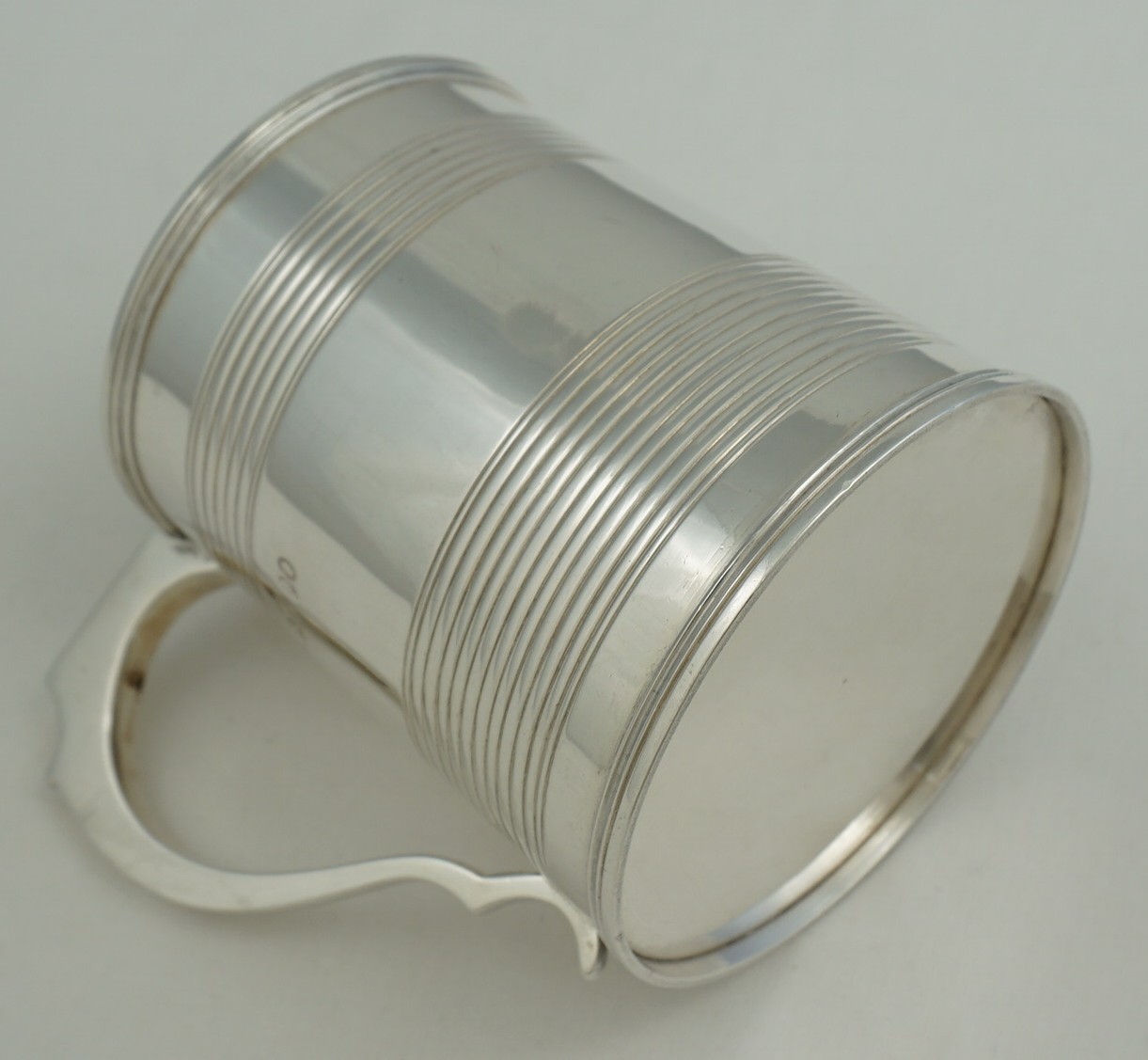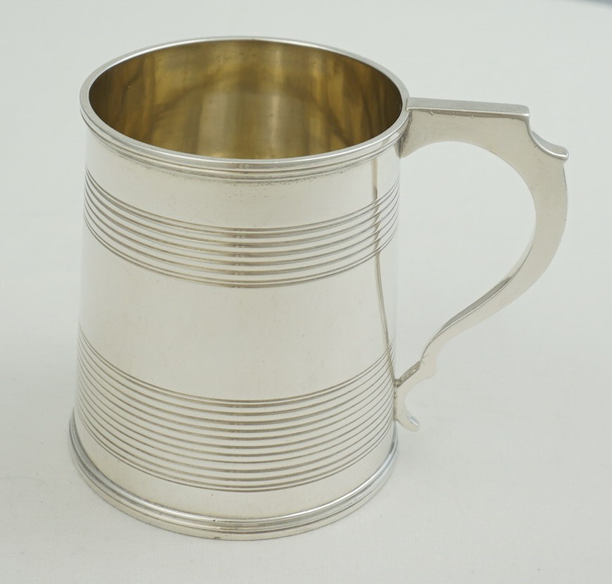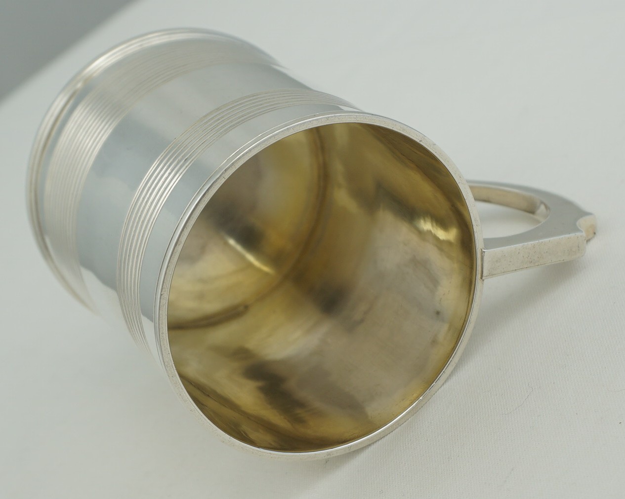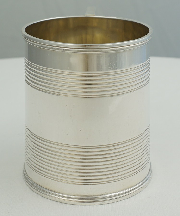 DESCRIPTION | Good value antique English William IV solid sterling silver christening mug with reed banded decoration, gilded interior and no engraving or erasure. |