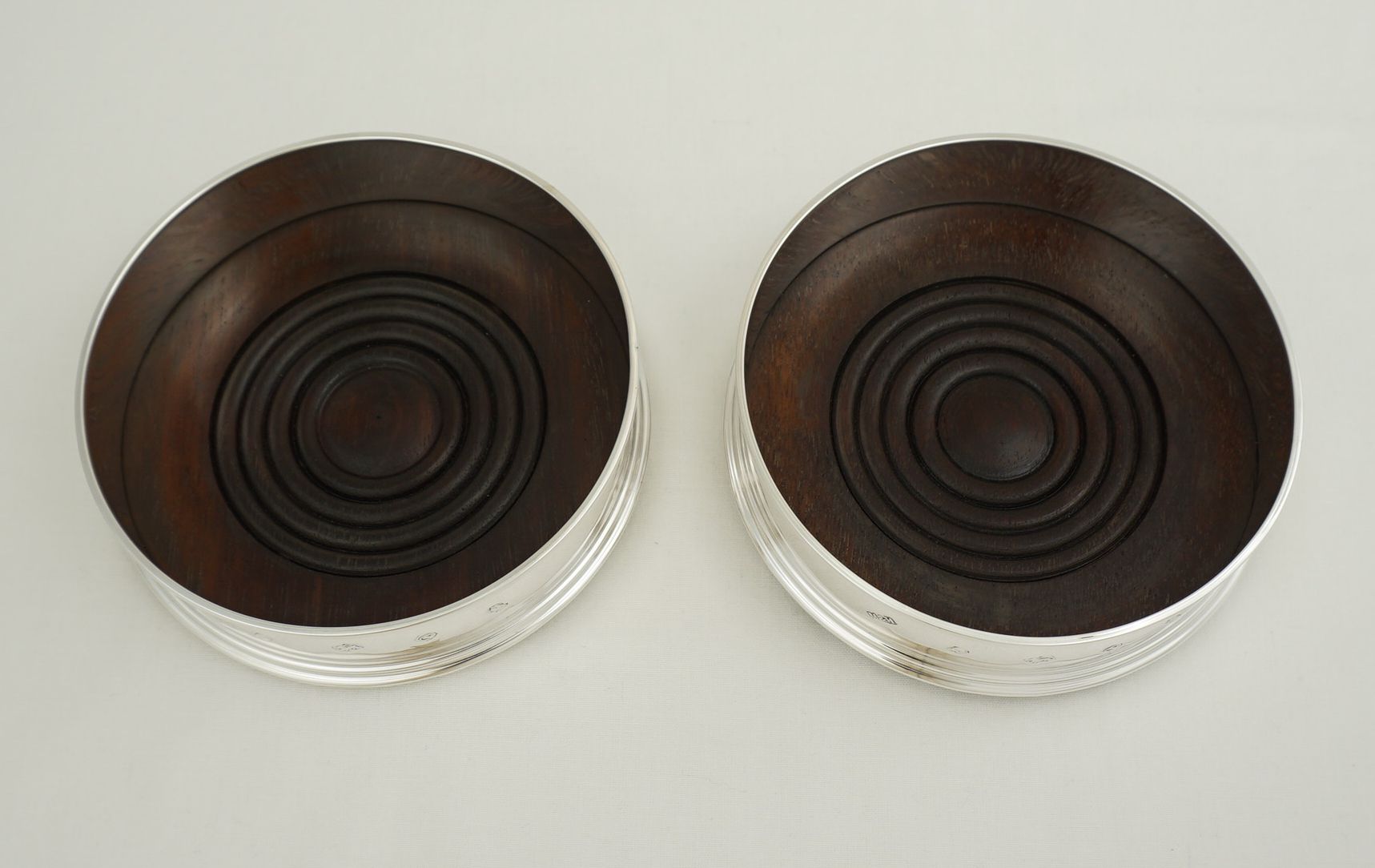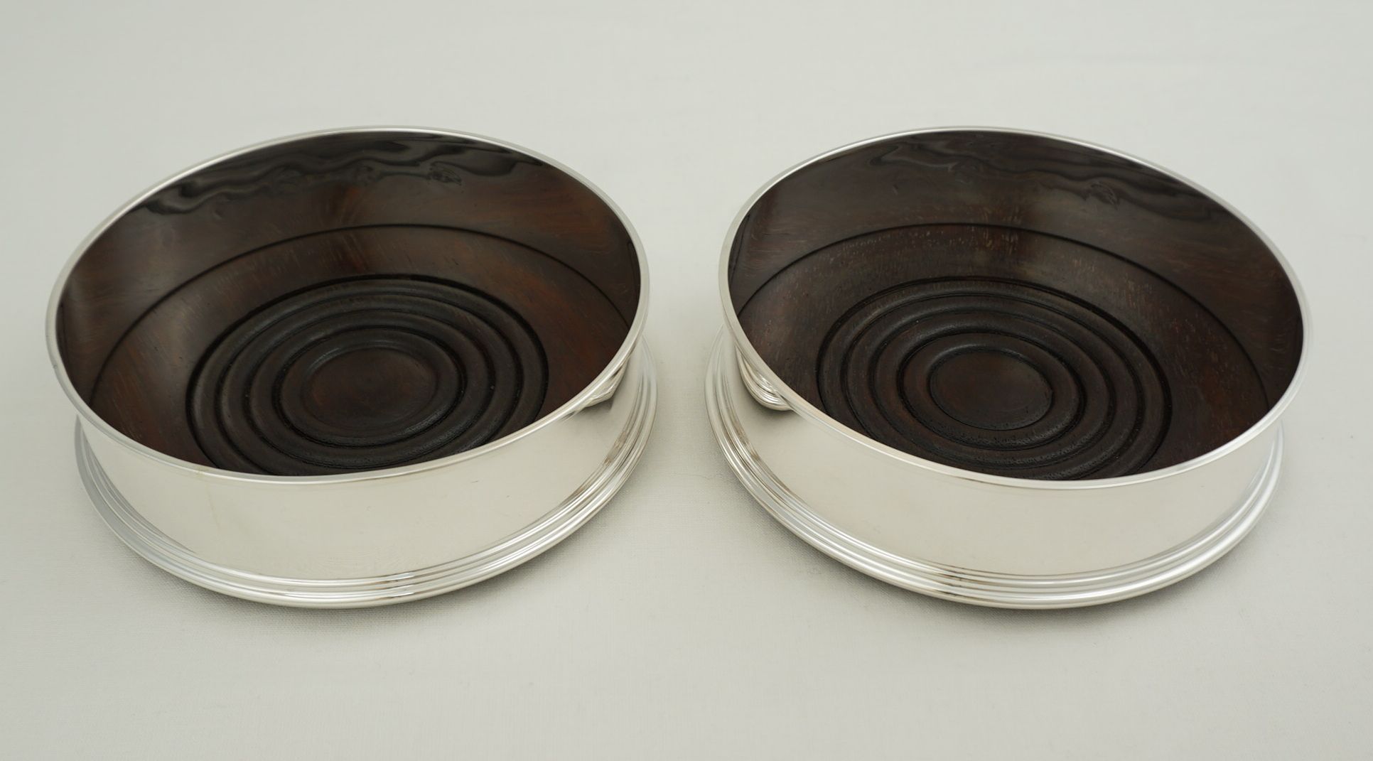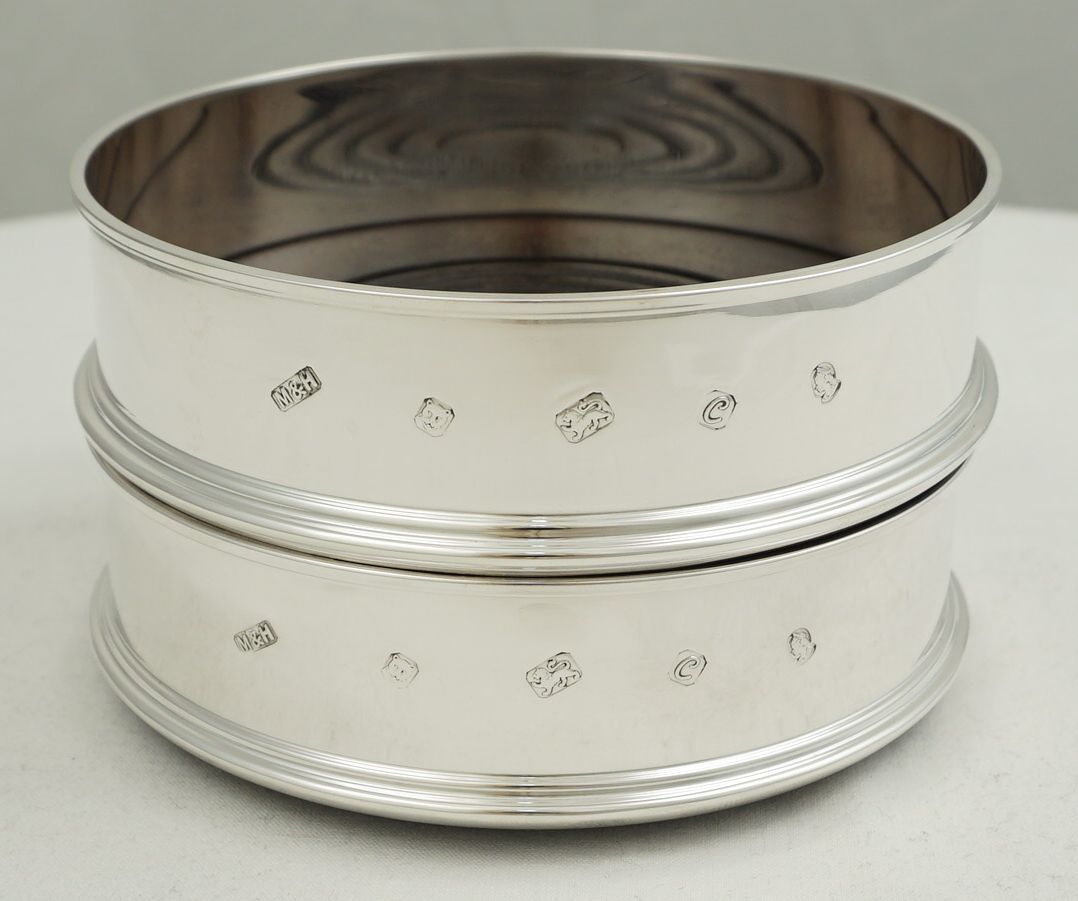 | DESCRIPTION | Good pair of large vintage English solid sterling silver bottle coasters with turned wood bases and felt bottoms. Similar examples can be bought new for £290 each (not a pair but each). It has taken me many years to realise why these coasters often have blobs of wax on the wood bases. People use them for the large, fat candles that are popular today as well as protecting your polished surfaces from water damage due to condensation on chilled white wine bottles. |
