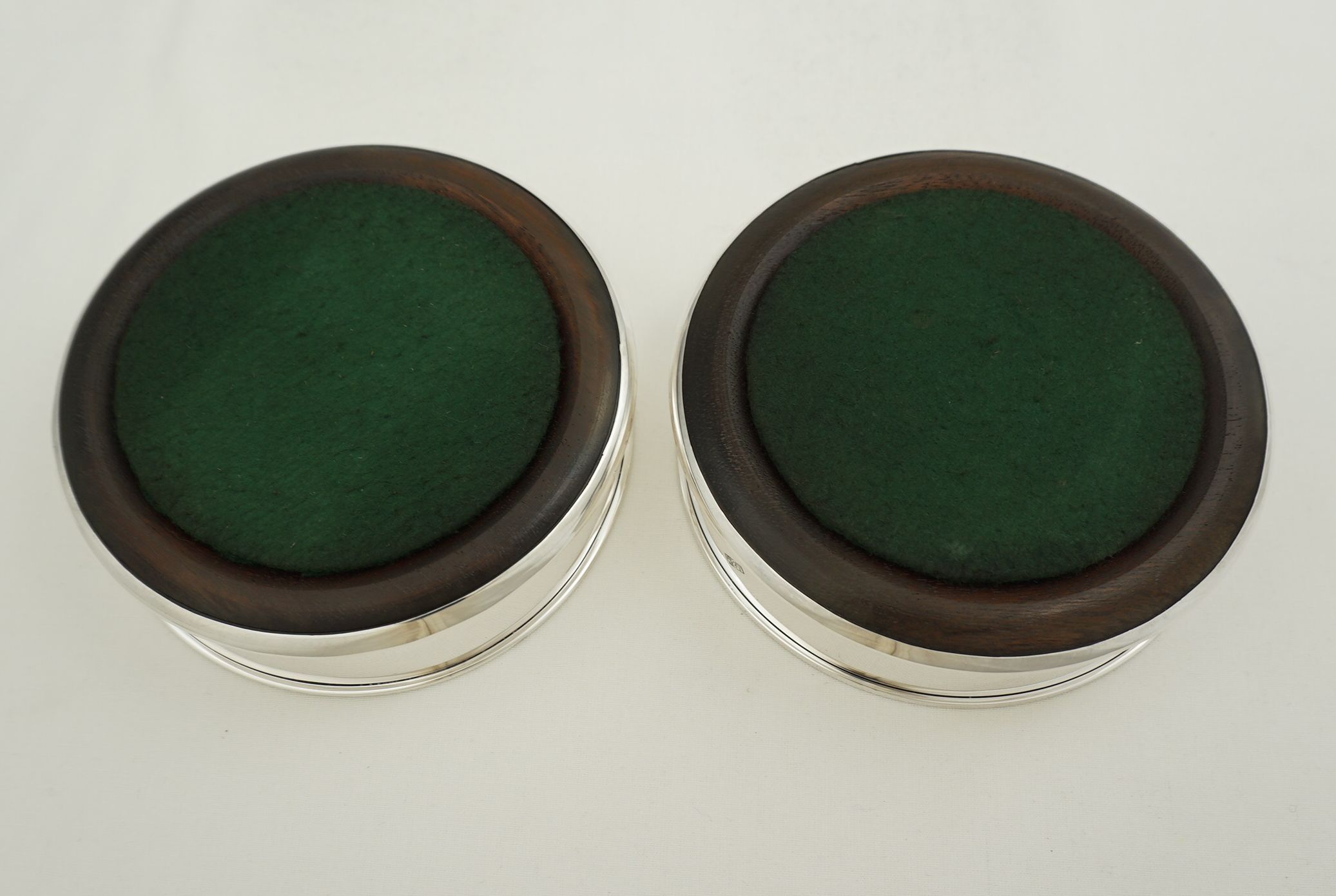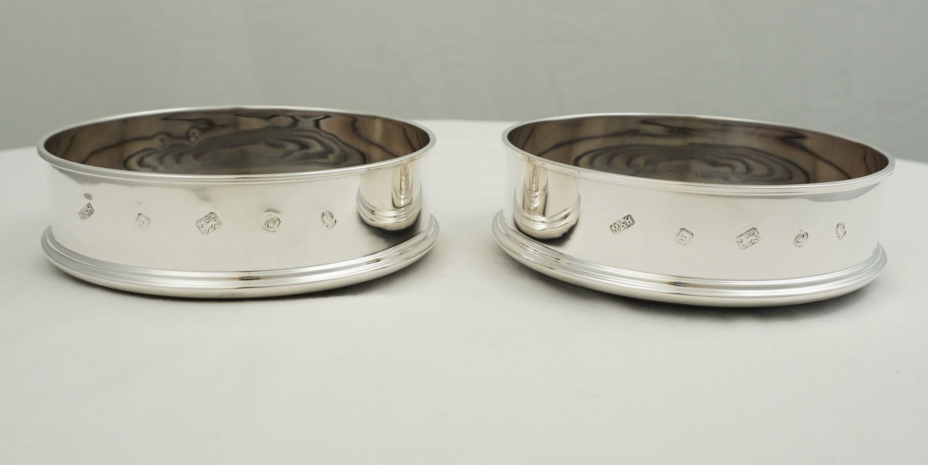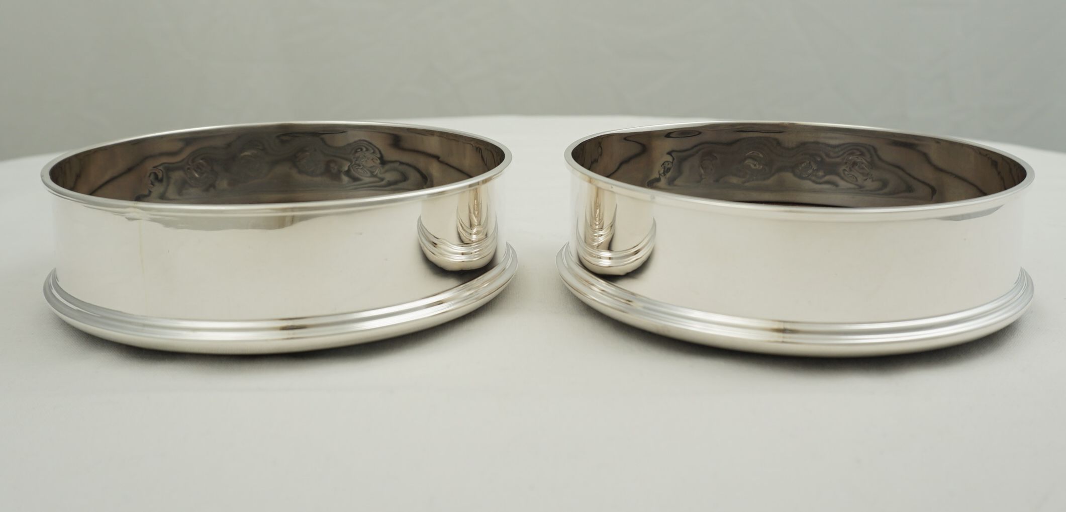 | DESCRIPTION | Good pair of large vintage English solid sterling silver bottle coasters with turned wood bases and felt bottoms. Similar examples can be bought new for £290 each (not a pair but each). It has taken me many years to realise why these coasters often have blobs of wax on the wood bases. People use them for the large, fat candles that are popular today as well as protecting your polished surfaces from water damage due to condensation on chilled white wine bottles. |