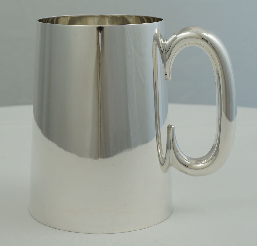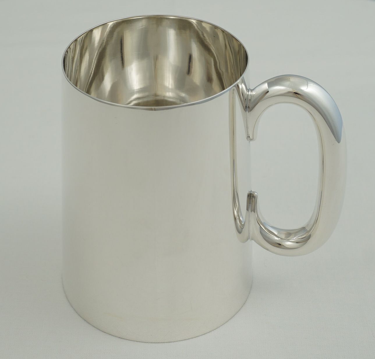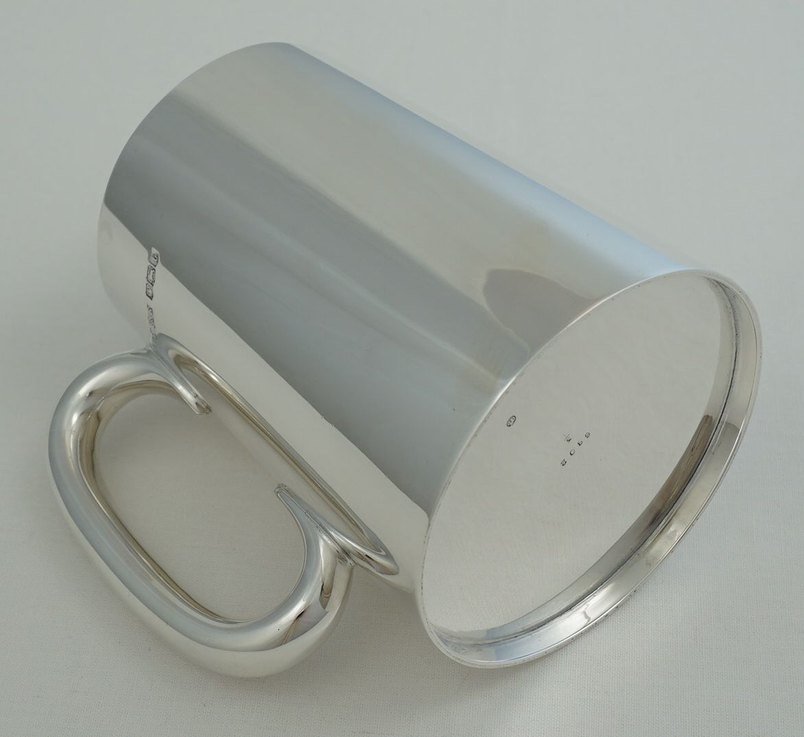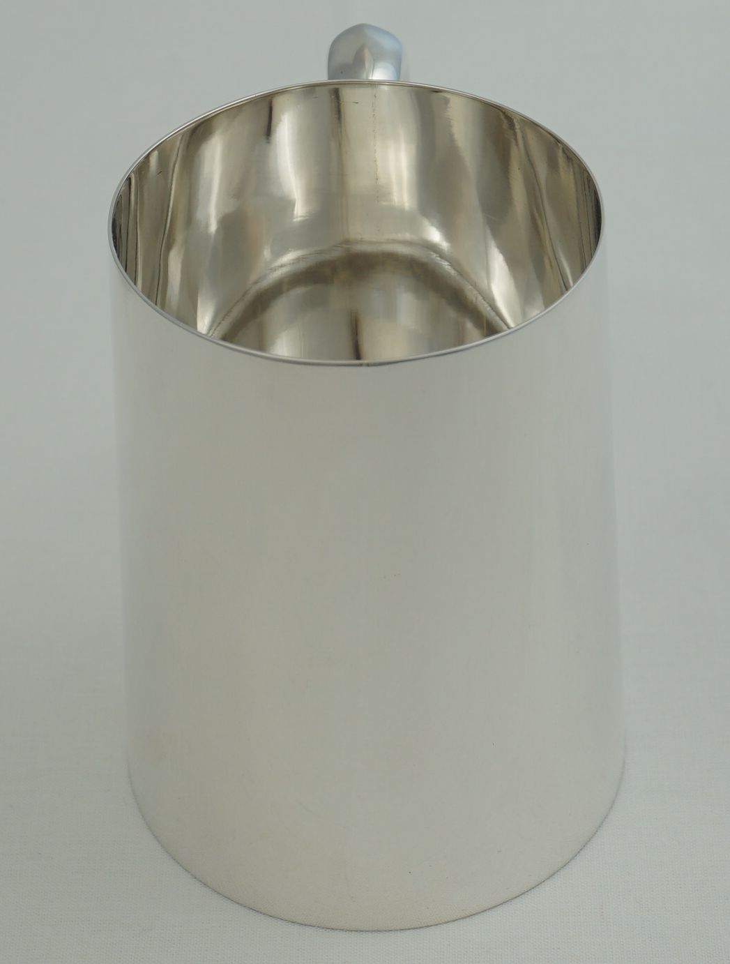 | DESCRIPTION | Excellent vintage English solid sterling silver tankard of plain form with no engraving or erasure. Holds 460ml or 16 British fluid ounces. |
