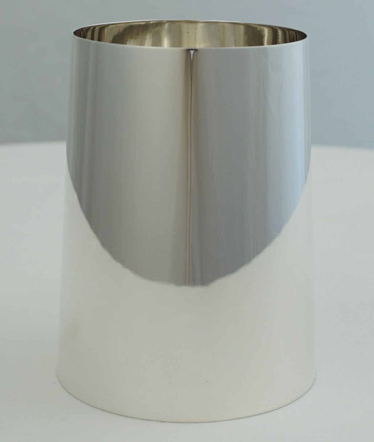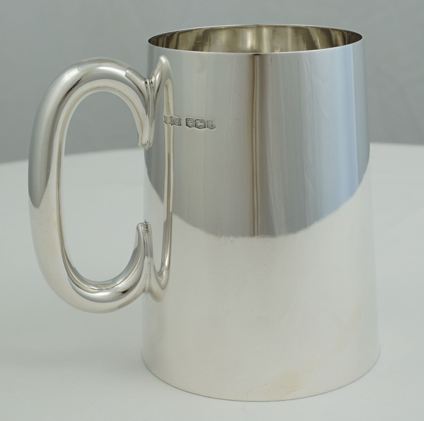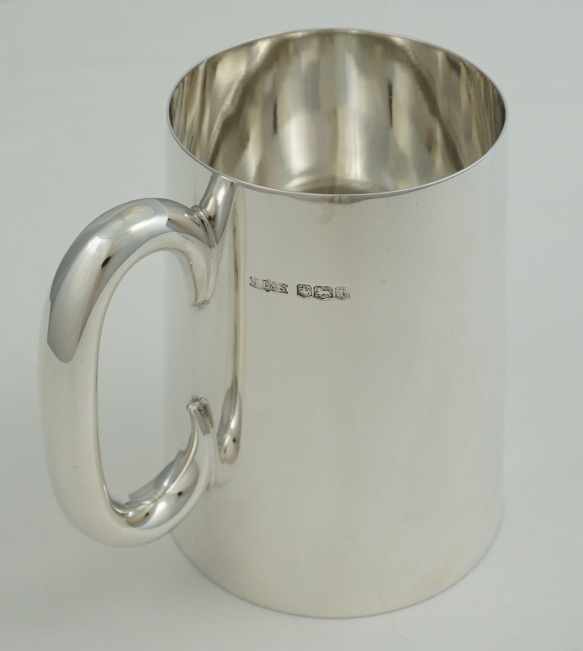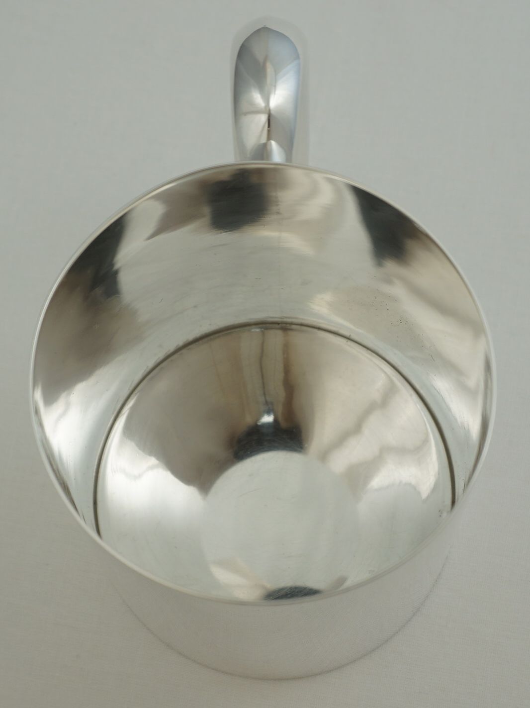 | DESCRIPTION | Excellent vintage English solid sterling silver tankard of plain form with no engraving or erasure. Holds 460ml or 16 British fluid ounces. |