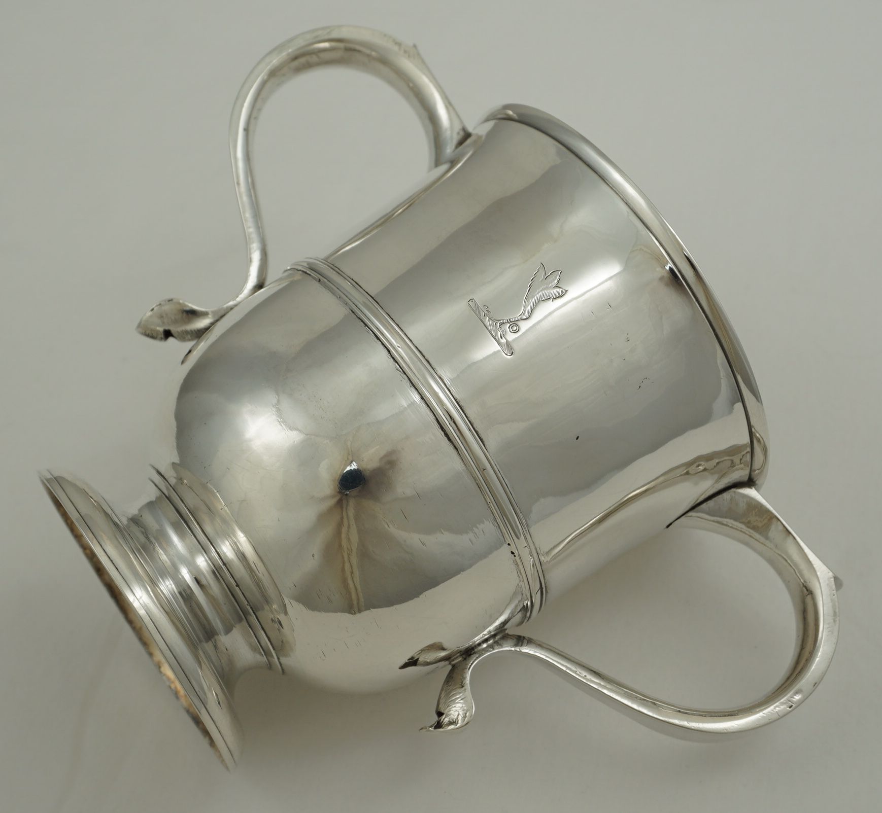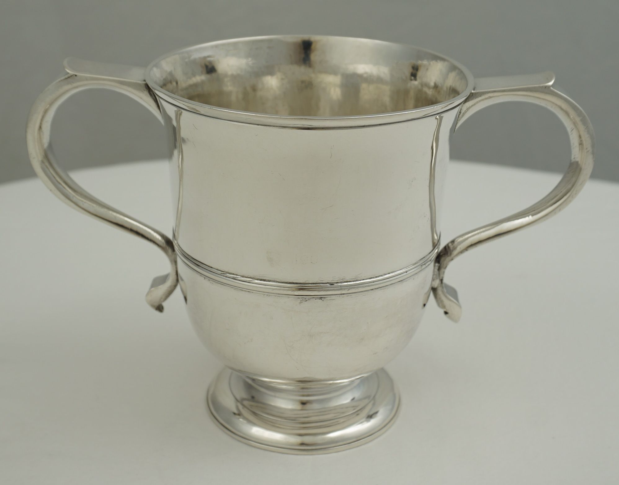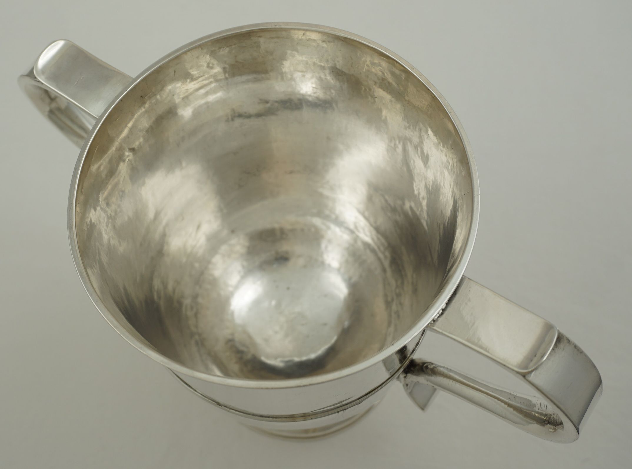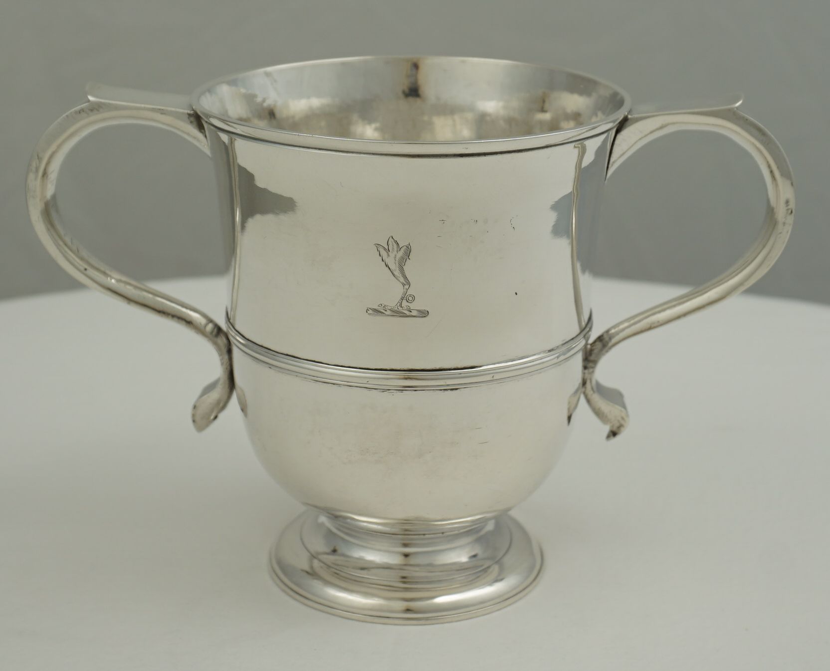 | DESCRIPTION | Antique English Georgian solid sterling silver two-handled cup with a crest engraving. The somewhat unusual crest engraving is probably later. I expected an erasure of an original monogram engraving but can find no evidence of this erasure. In fact, the silver is nice and thick throughout. |