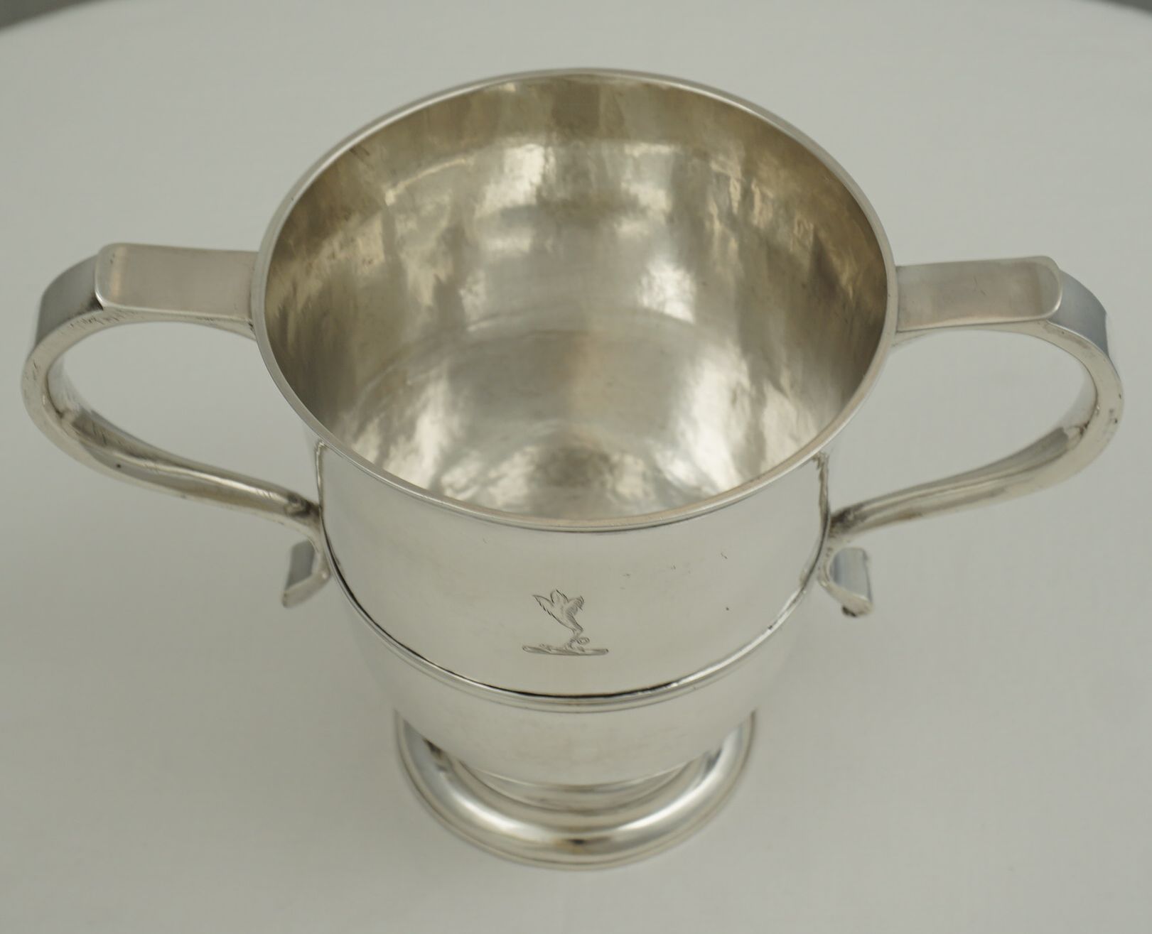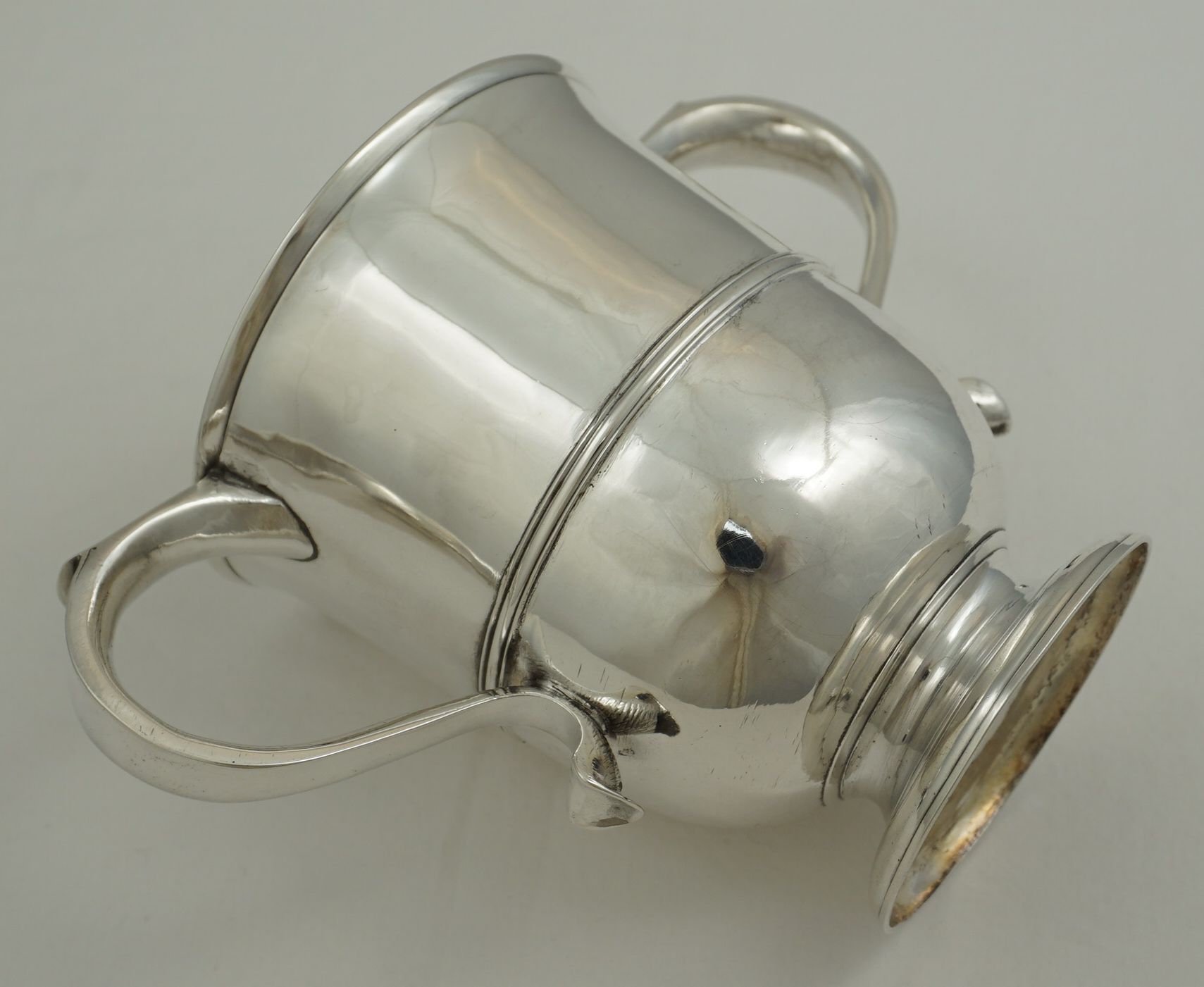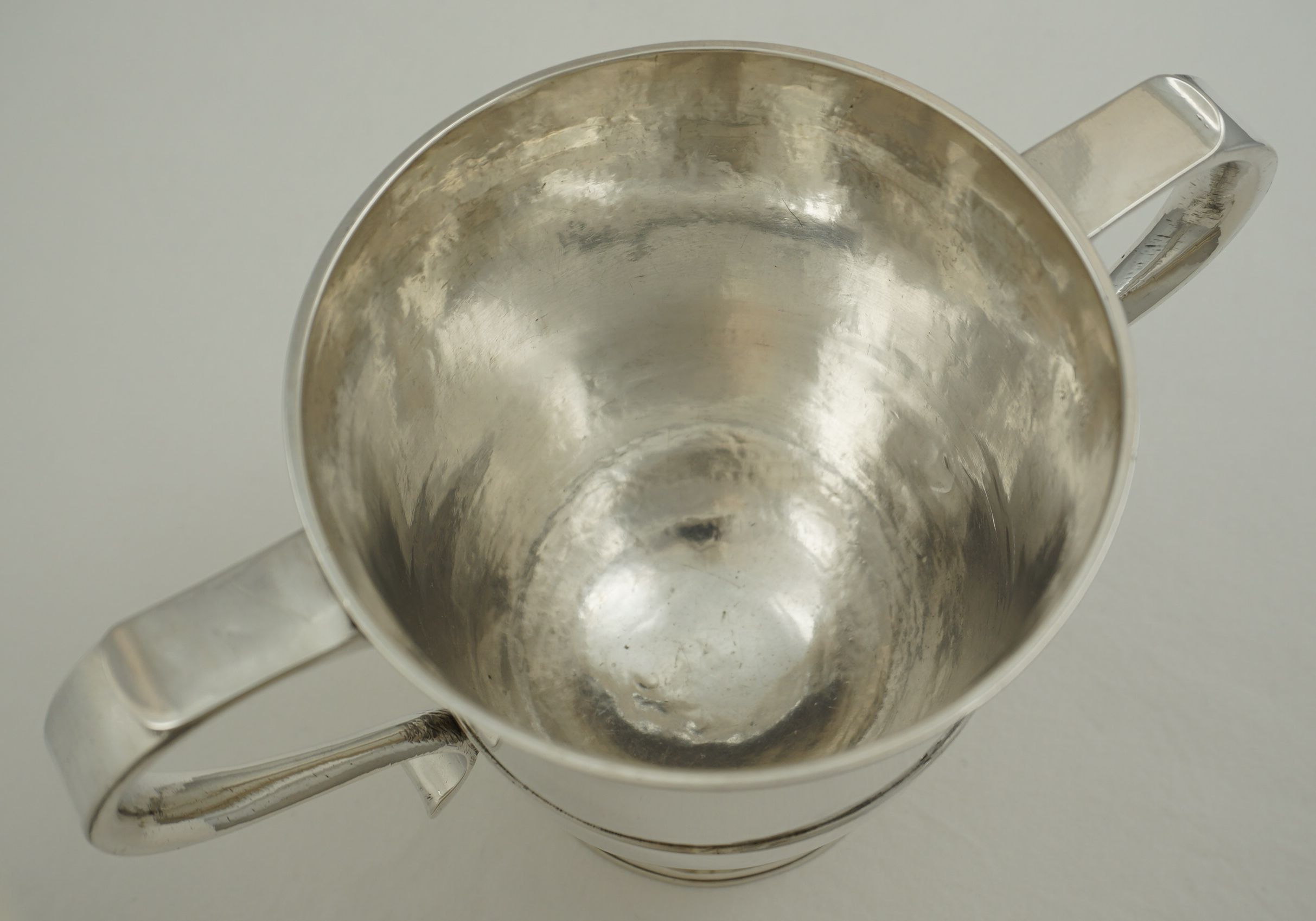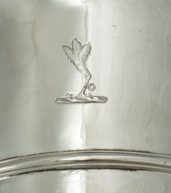 | DESCRIPTION | Antique English Georgian solid sterling silver two-handled cup with a crest engraving. The somewhat unusual crest engraving is probably later. I expected an erasure of an original monogram engraving but can find no evidence of this erasure. In fact, the silver is nice and thick throughout. |