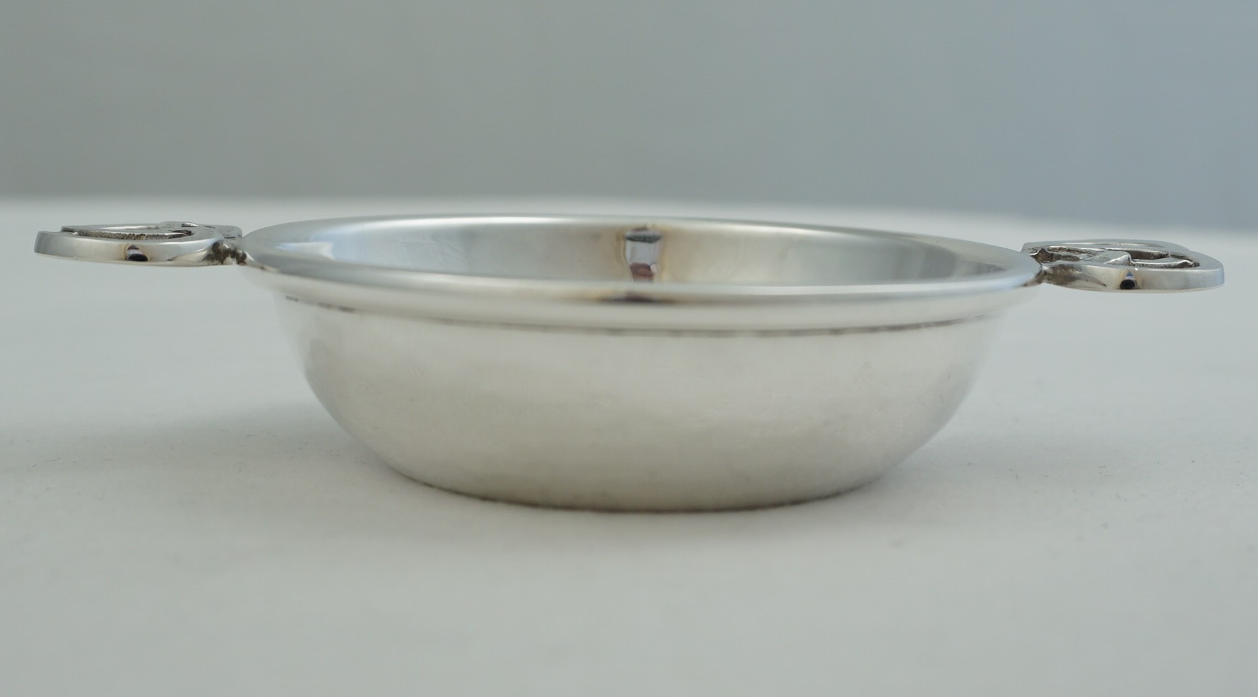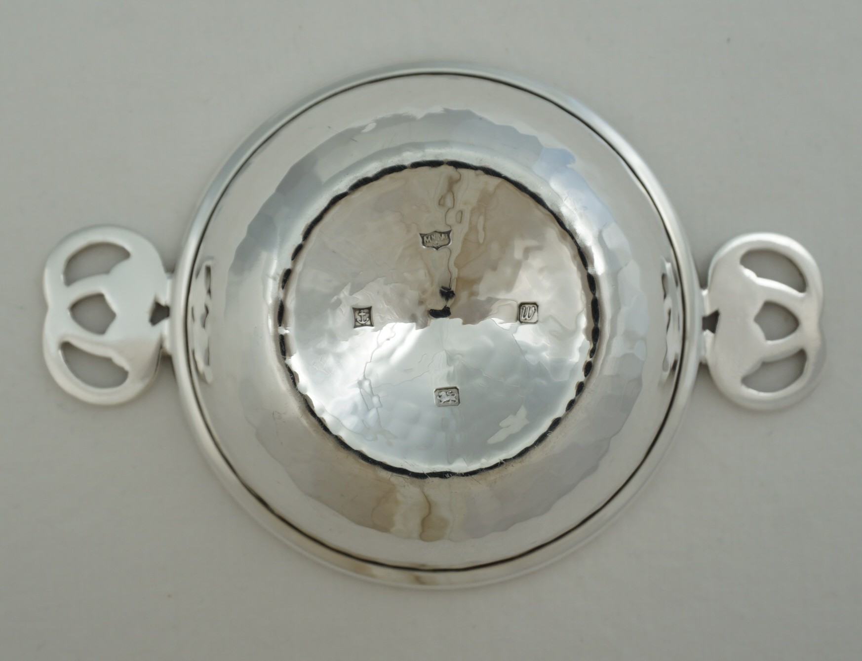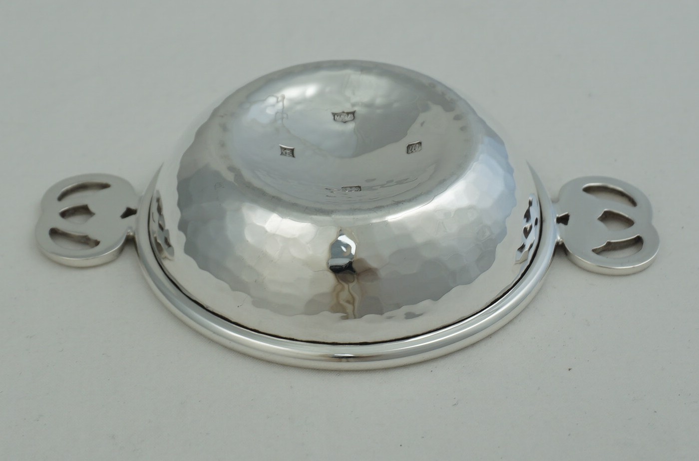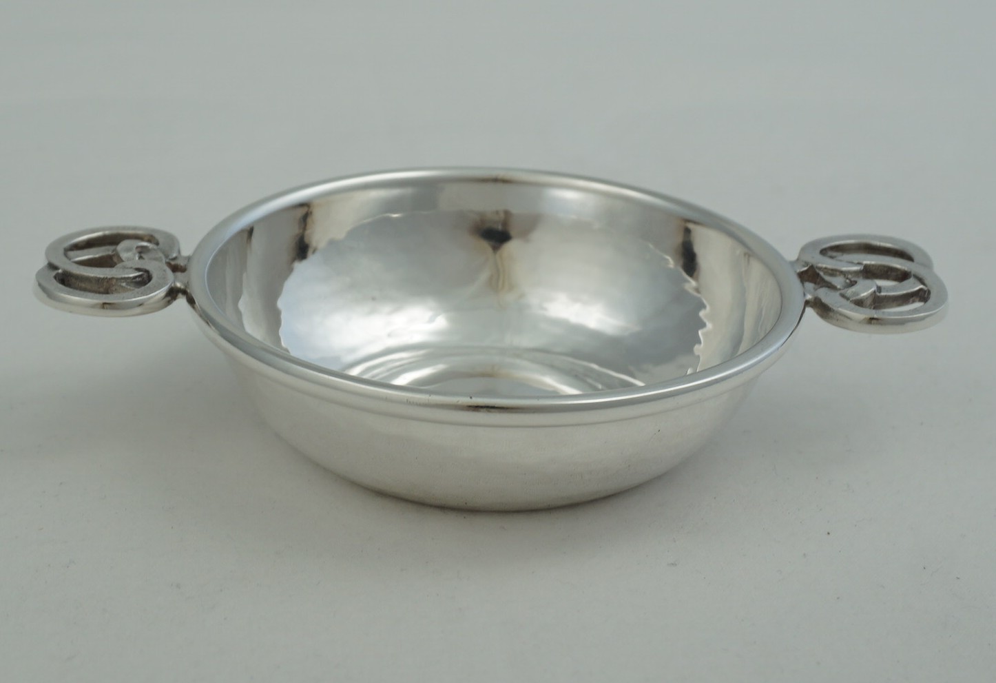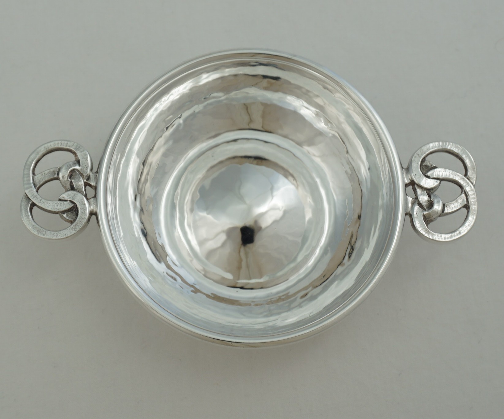 | DESCRIPTION | High quality and interesting solid sterling silver small quaich with hammered decoration and knot form handles. |