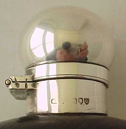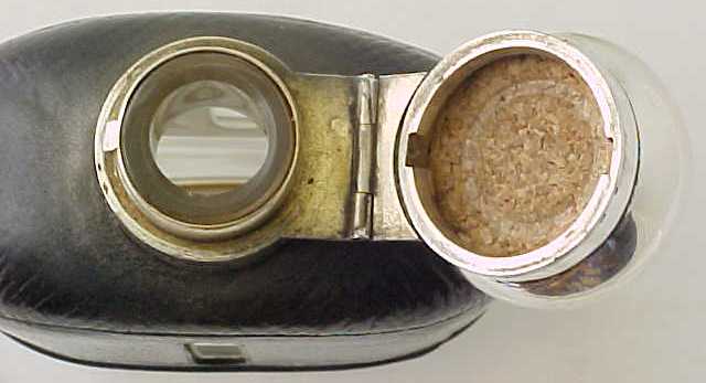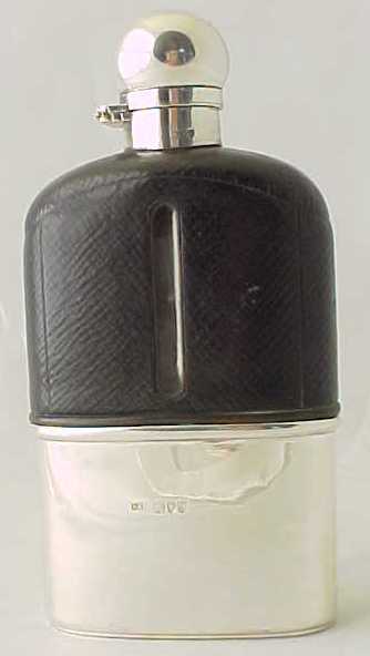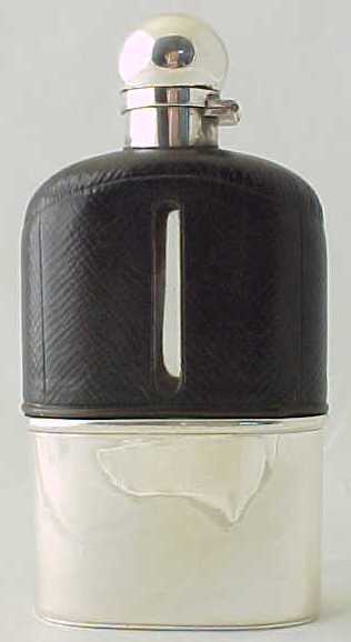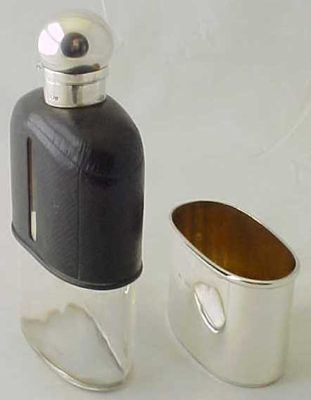 Victorian leather covered glass pocket flask with silver top and gilded silver cup base. |