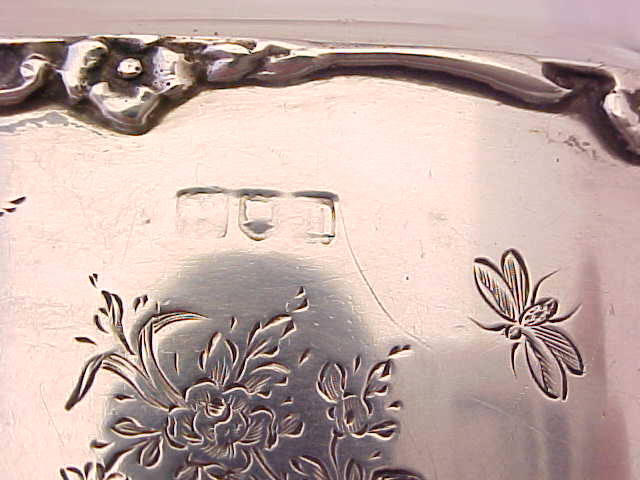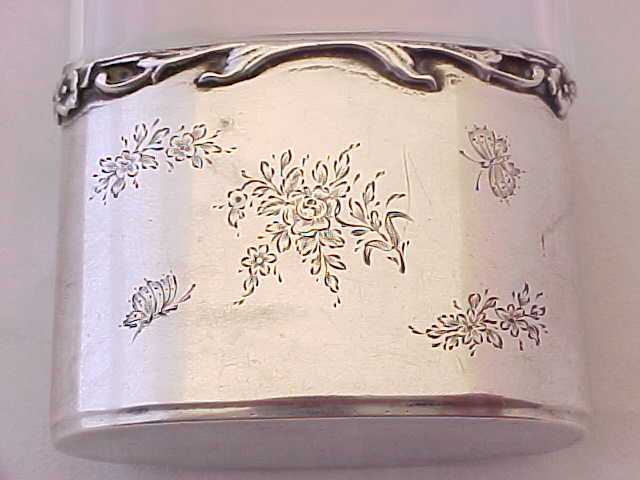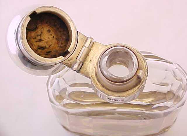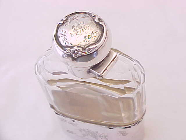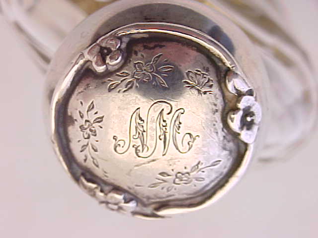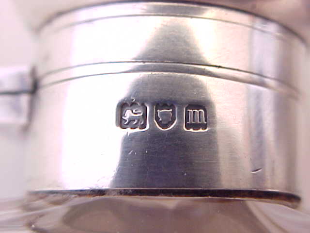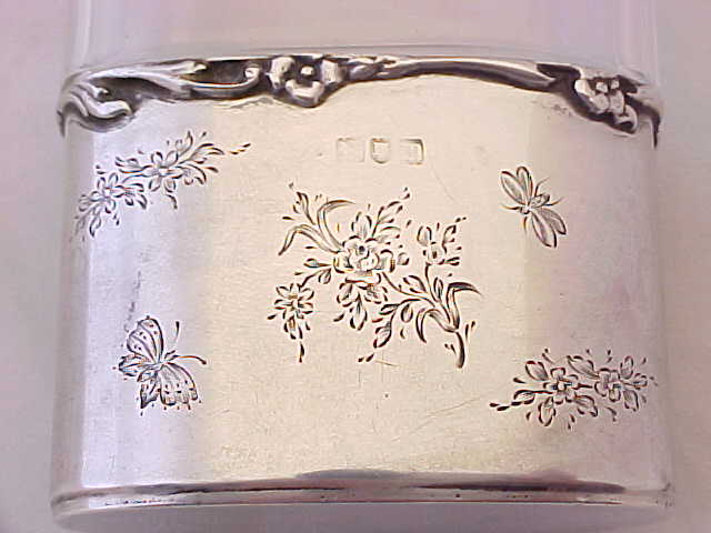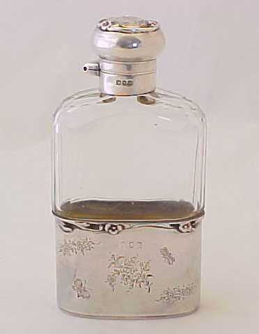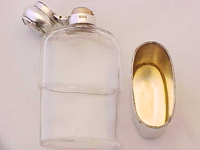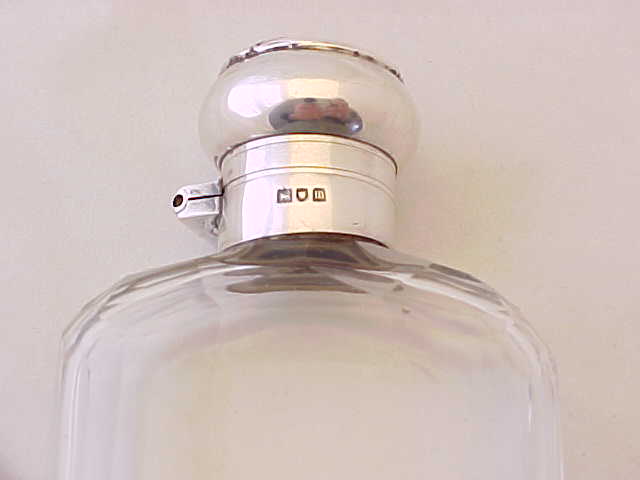 Pretty Edwardian spirit flask with a superb facet cut glass body. The silver top has a cork seal and is engraved to the top 'NM'. The detachable silver cup is decorated with engraved insects and flowers and has the original gilded interior. An attractive and useful piece. |