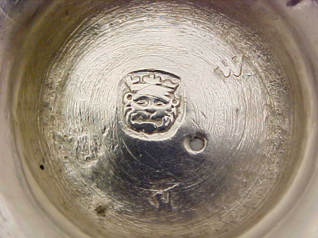 Leans slightly, best seen in the first image. When I found this piece it had a functional old lead repair to the base of the cup. Lead was commonly used in the past as a cheap means of fixing silver, but we know better now and it must be removed for it dissolves the surrounding silver and is toxic. My silversmith has removed it and replaced with silver. There were traces of internal gilding and so this has been reinstated. Now that this restoration has been carried out, this beaker has become a piece of early silver that you could actually use safely and without fear of ruin. |