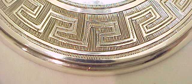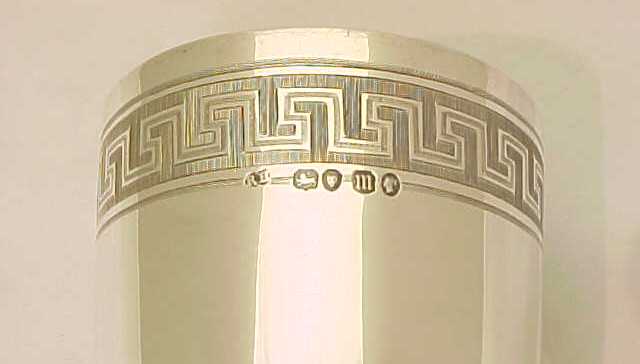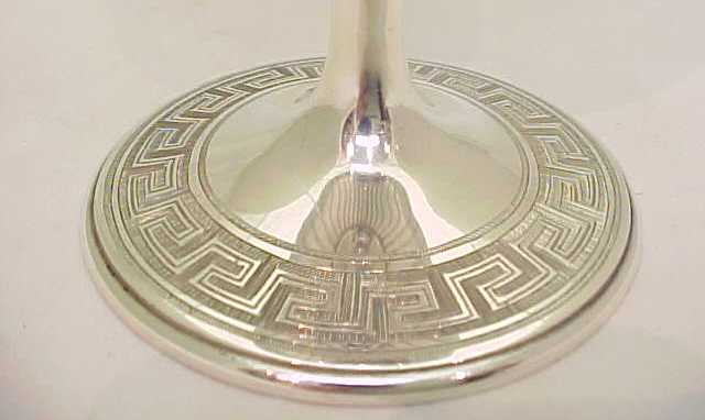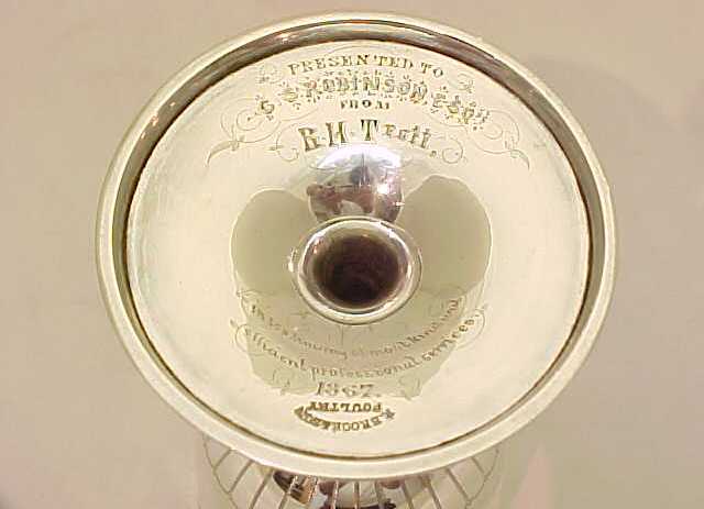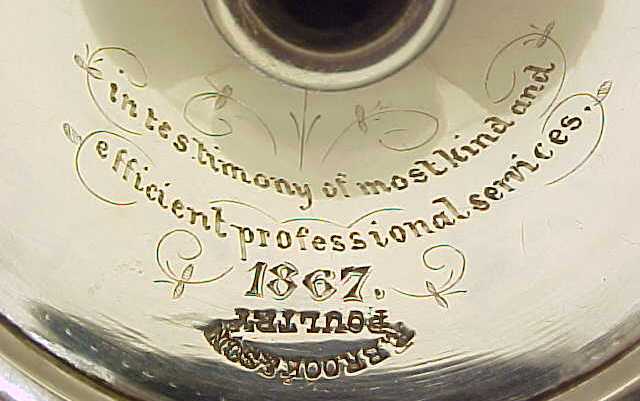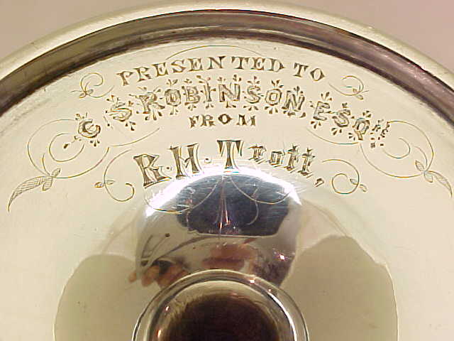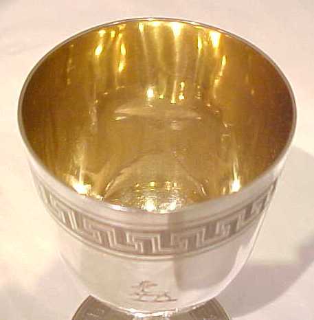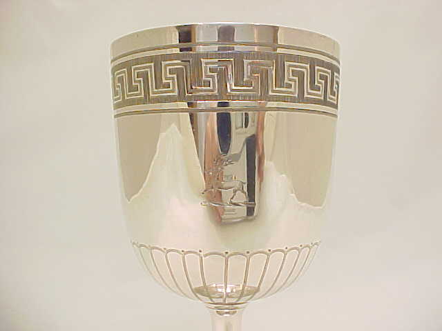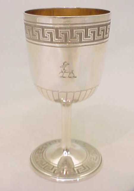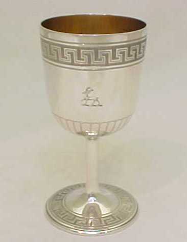 Beautiful Victorian silver pedestal goblet with a richly gilded interior and engraved with Greek key banding and fluted decoration. Original engraved stag crest is still crisp as is the presentation inscription beneath the base. Retailer's mark R. Brook & Son. |