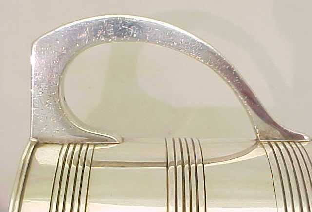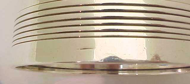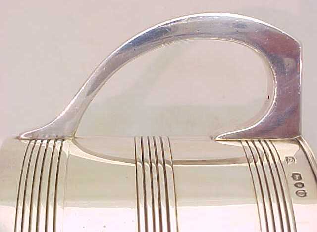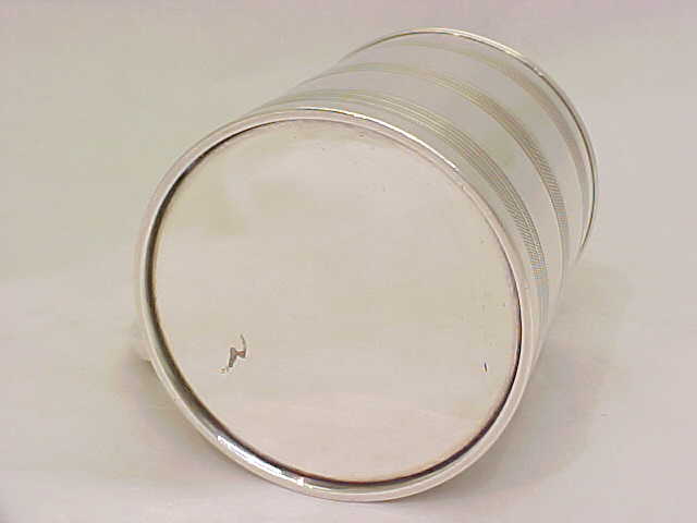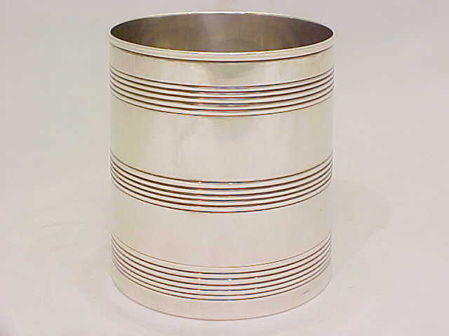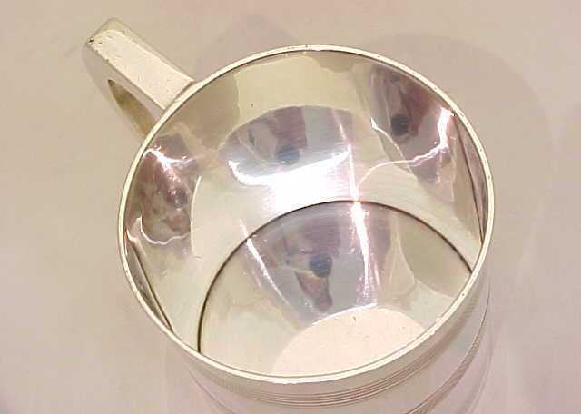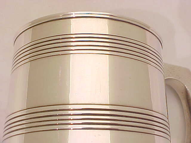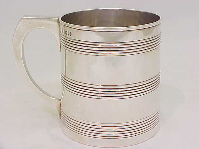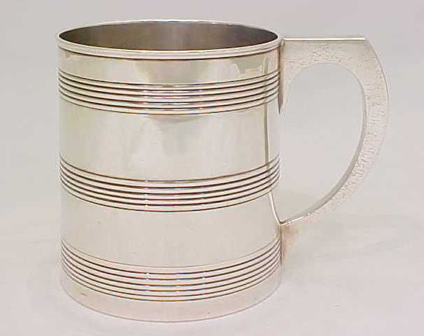 Substantial Victorian silver mug simply decorated with three reeded bands. Holds one pint and one ounce. |
