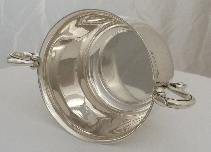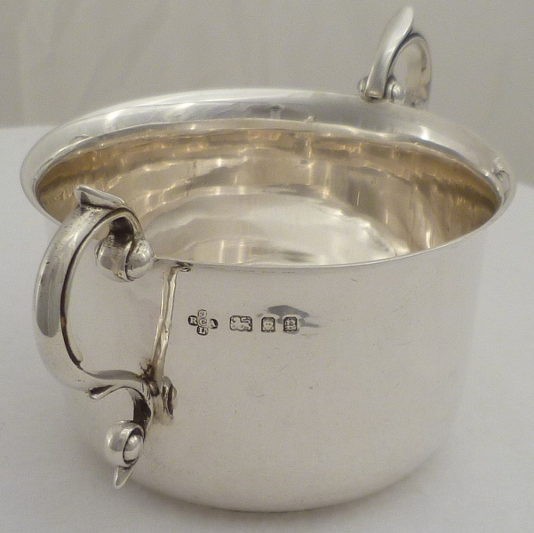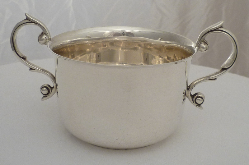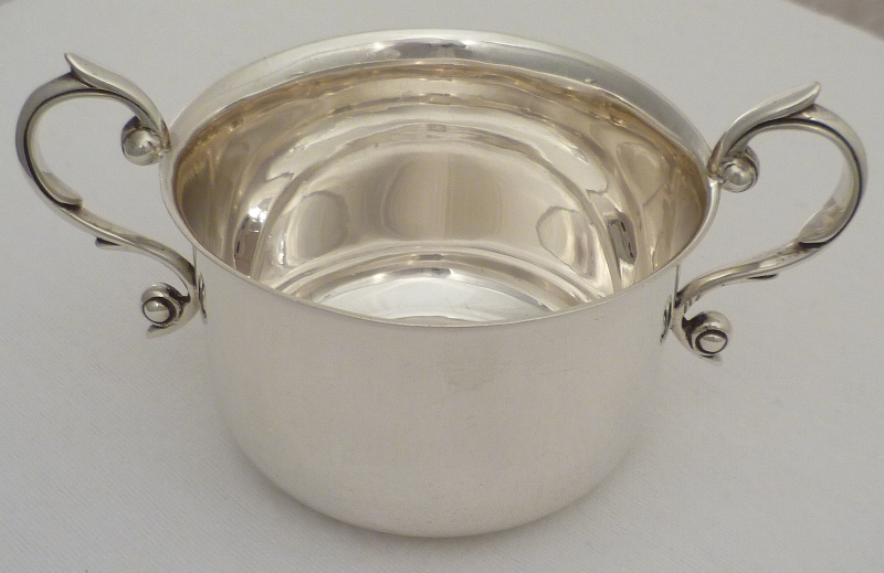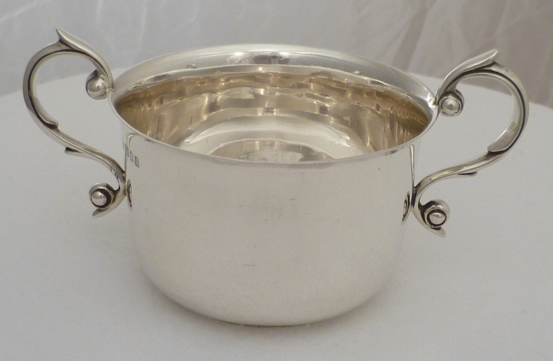 High quality solid silver reproduction of a late17th century two handled cup. Also known as a porringer, caudle cup and posset-pot. |