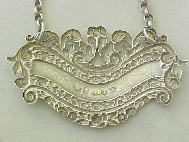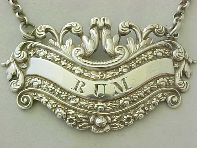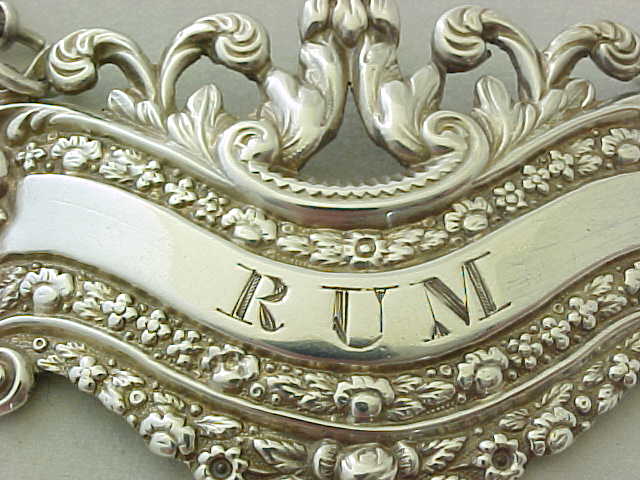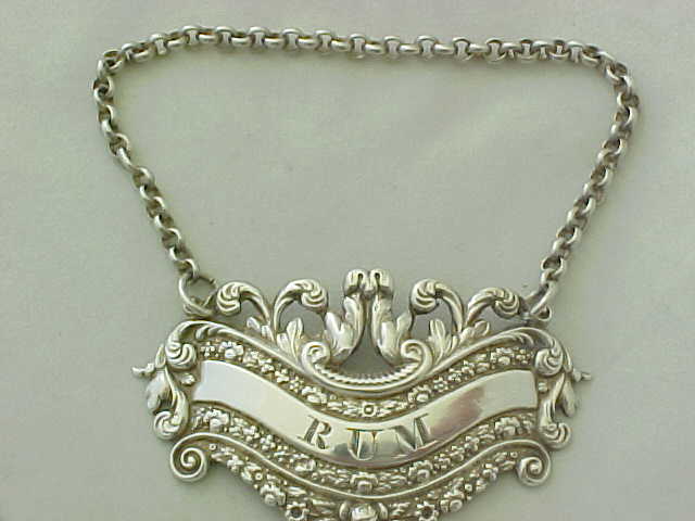 Georgian silver RUM bottle label with suspension chain. |