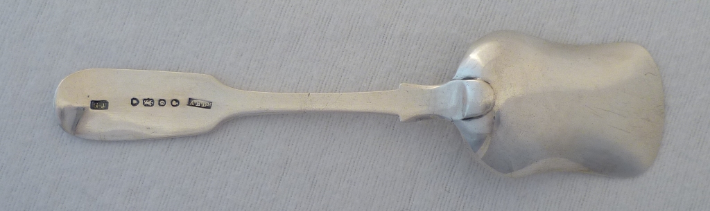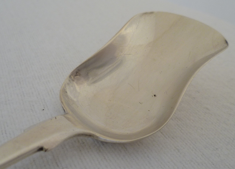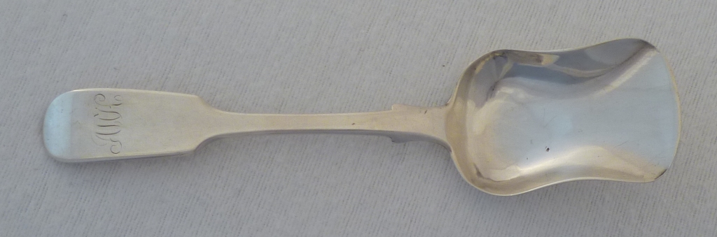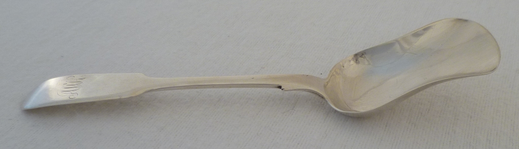 DESCRIPTION | Large Victorian Scottish provincial silver Fiddle pattern sugar shovel with a monogram engraved to the terminal. |