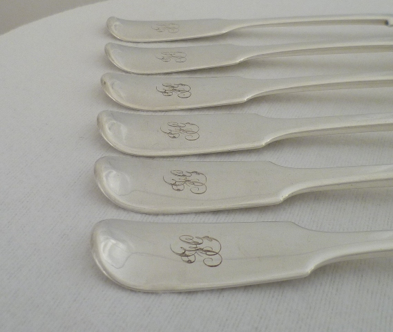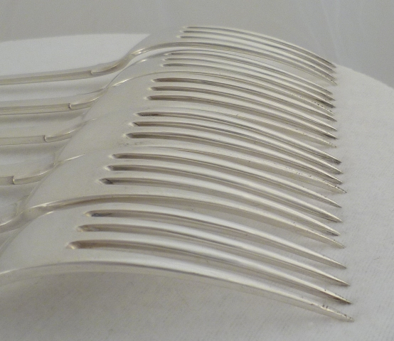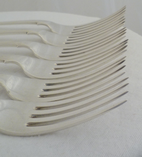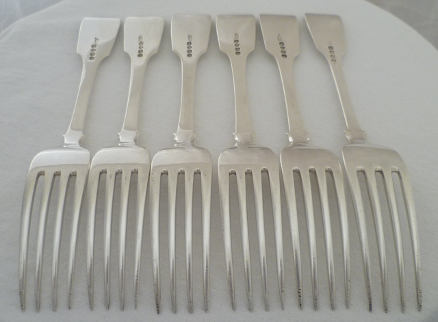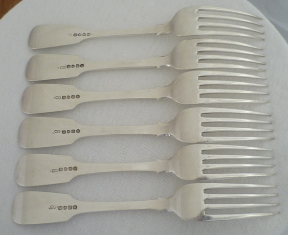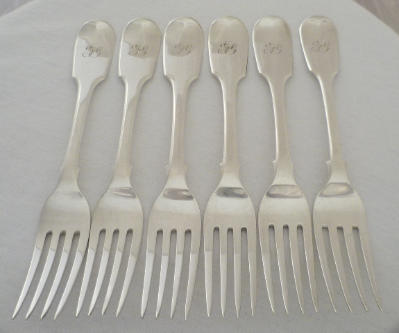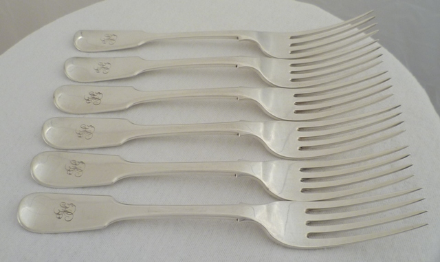 DESCRIPTION | Set of six William IV silver Fiddle pattern table forks with monogram engraved terminals. |