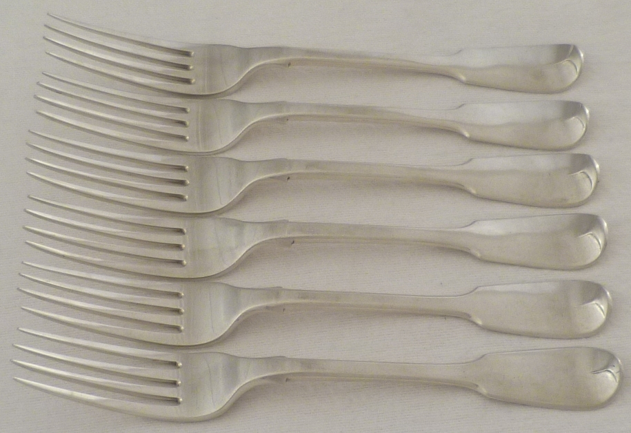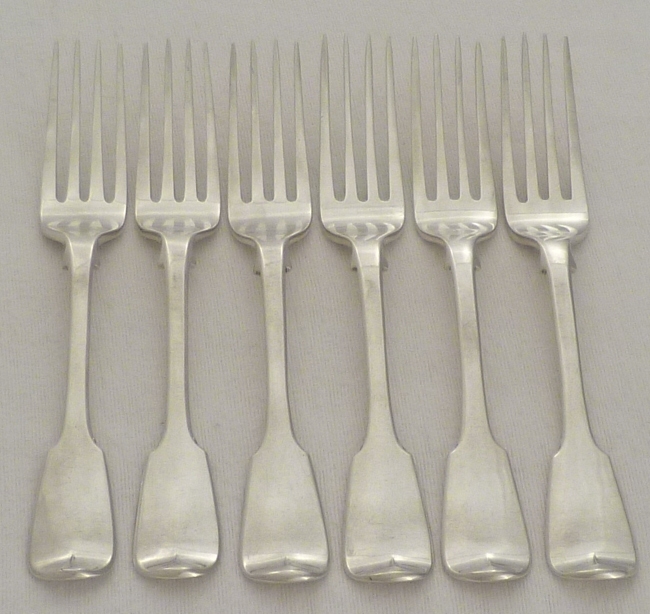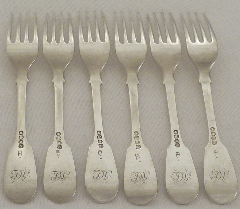DESCRIPTION | Set of six early Victorian silver Fiddle pattern forks with original monogram engraved verso. Dessert forks are now also used for salads and starter. |