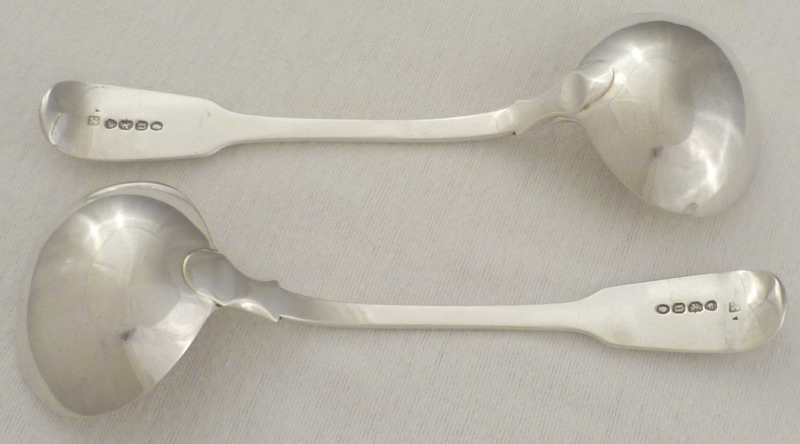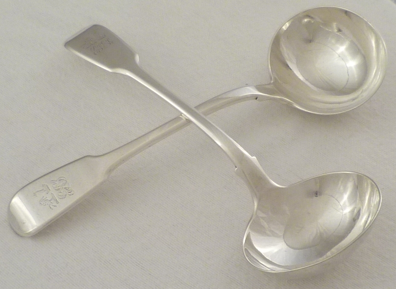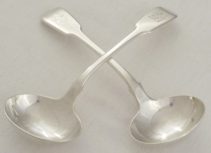 DESCRIPTION | Pair of William IV silver Fiddle pattern sauce ladles with dual crest and monogram engravings. |