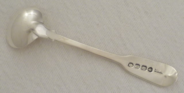 DESCRIPTION | Georgian silver Fiddle pattern salt spoon with a gilded bowl and crested terminal. |