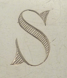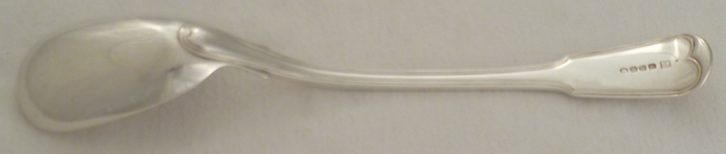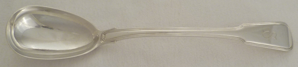 DESCRIPTION | Heavy Georgian silver Fiddle & Thread pattern salad serving spoon with an initial S engraved to the terminal. Much like a thick basting/gravy spoon but with a deeper curve to the stem and a horizontal, deep, egg shaped bowl. Could also be used as a higher volume basting spoon. |