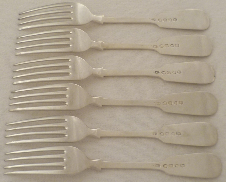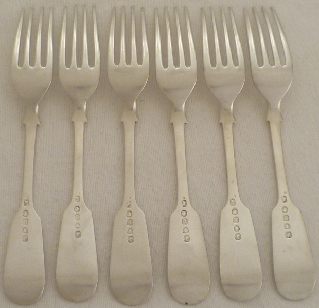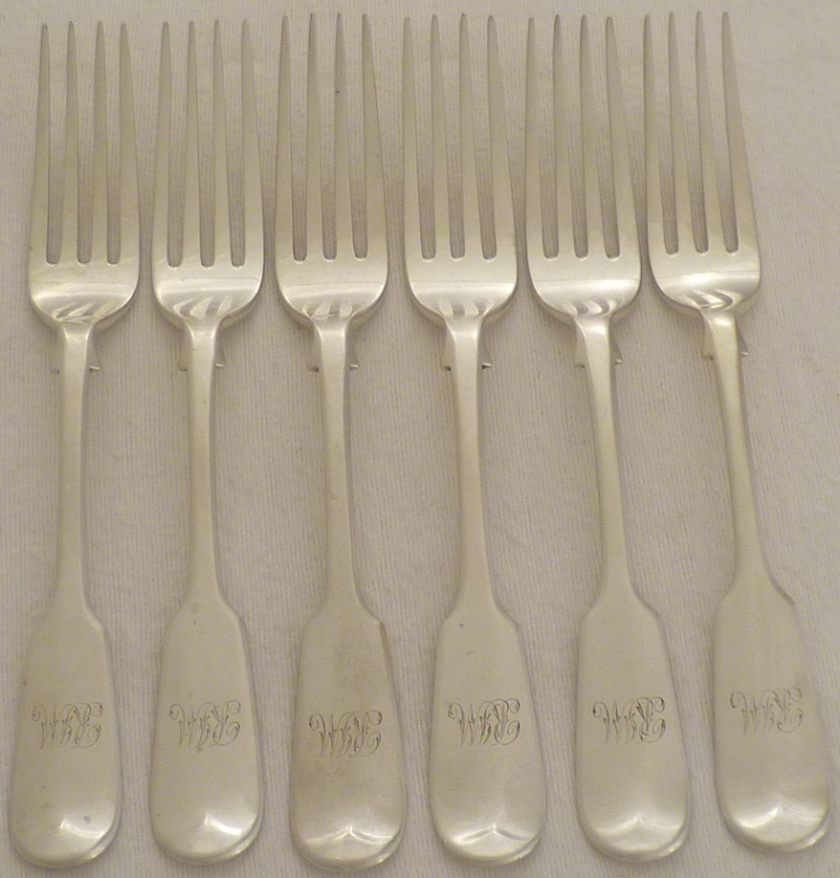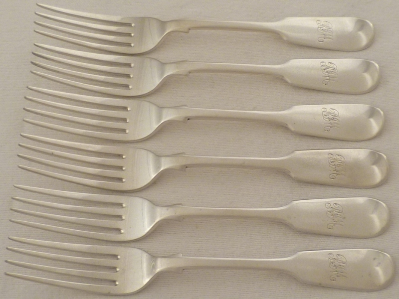DESCRIPTION | Set of six Victorian silver Fiddle pattern dessert forks with frontal monogram engraving. Today dessert forks are also used for salads and starters. |