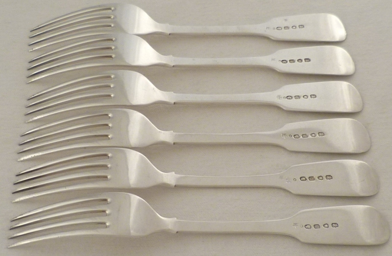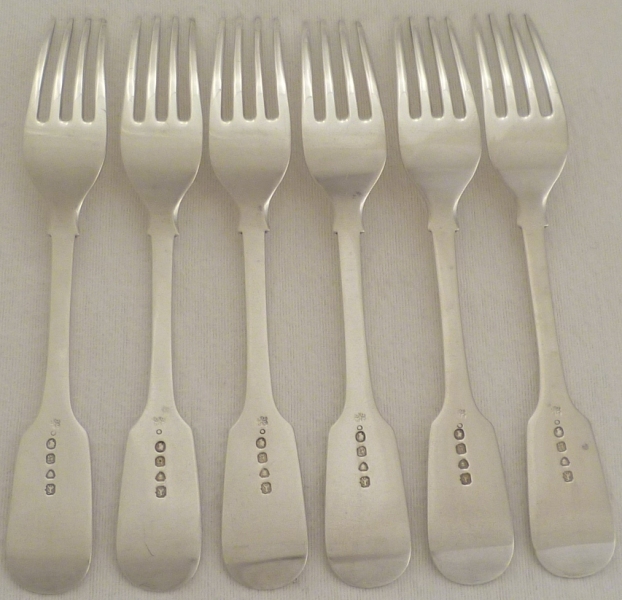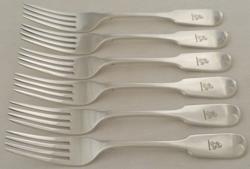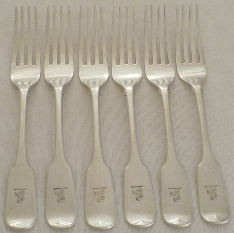 DESCRIPTION | Set of six Victorian silver Fiddle pattern table forks with original frontal crest engraving. |