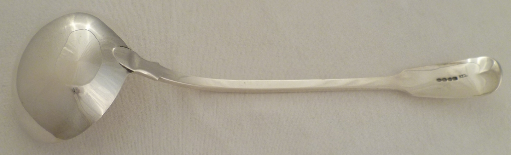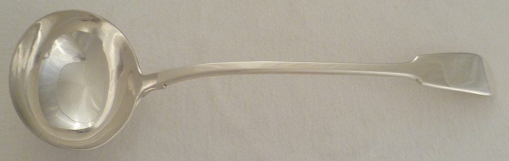 DESCRIPTION | Good, large and hefty William IV silver Fiddle pattern soup ladle with no engraving. |
