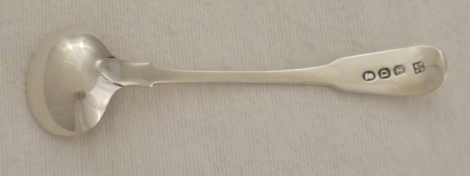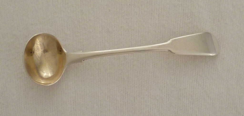 DESCRIPTION | Good Georgian silver Fiddle pattern salt spoon with a gilded bowl and no engraving. |