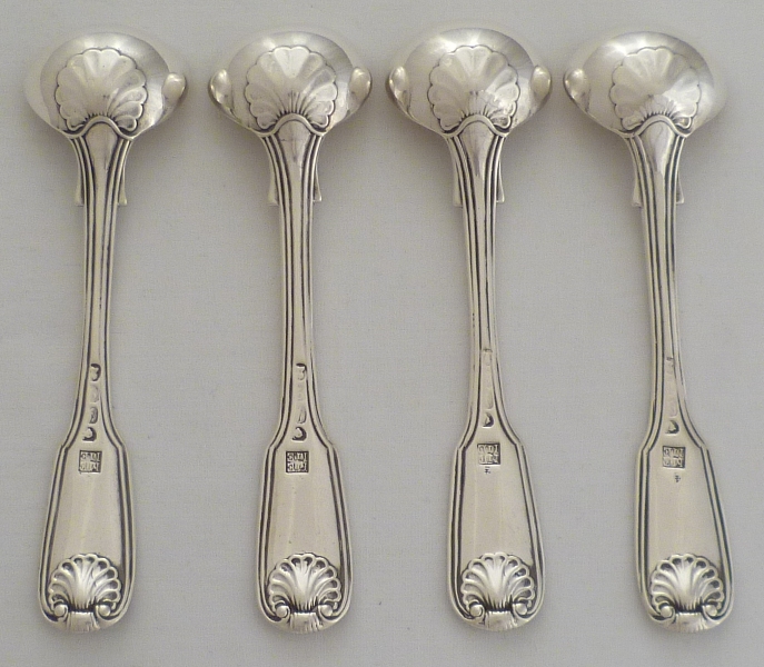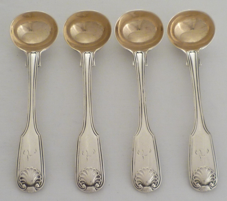 DESCRIPTION | Set of four large and heavy William IV silver gilt double struck Fiddle Thread & Shell pattern salt spoons with union shell heels and a faint/rubbed initial engraving 'A'. |