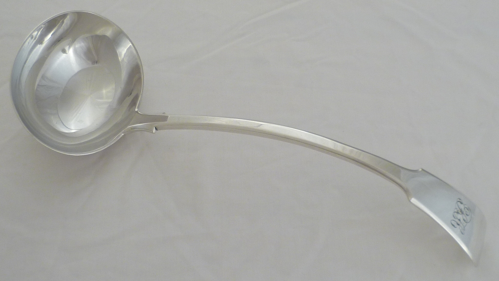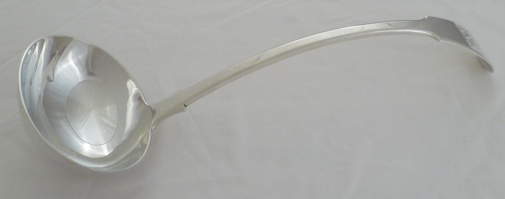 DESCRIPTION | Good, large, curvaceous and significantly hefty Victorian silver Fiddle pattern soup ladle with the original monogram engraving. |