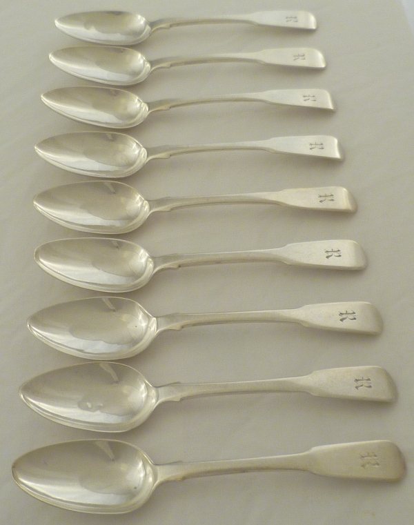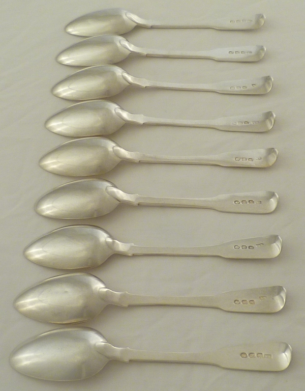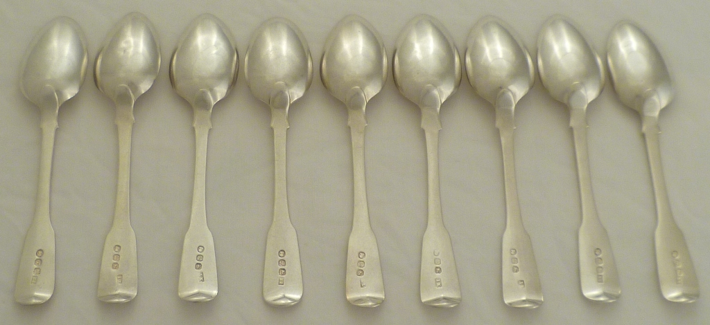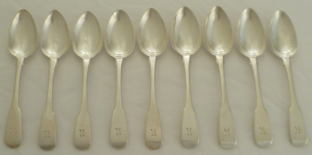 DESCRIPTION | Nine Georgian silver Fiddle pattern teaspoons, frontally engraved 'R'. |