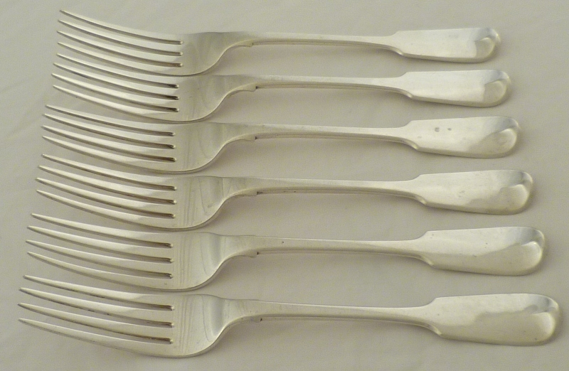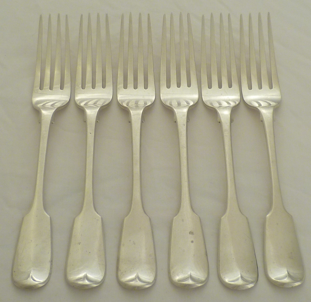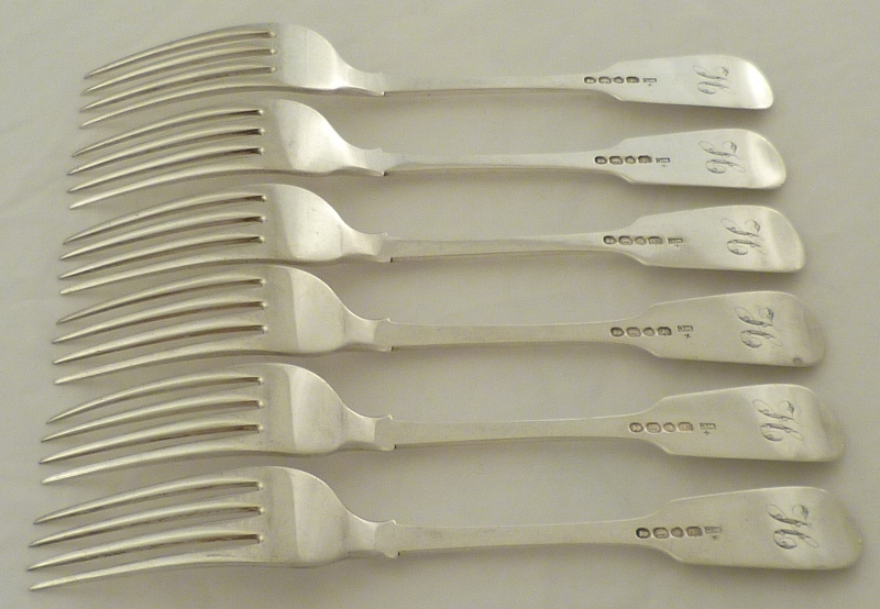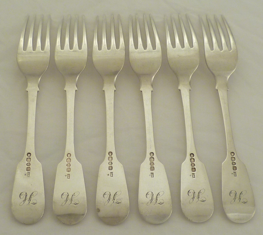 DESCRIPTION | Good set of six Georgian silver Fiddle pattern table forks with monogram engraving verso and level tines. |